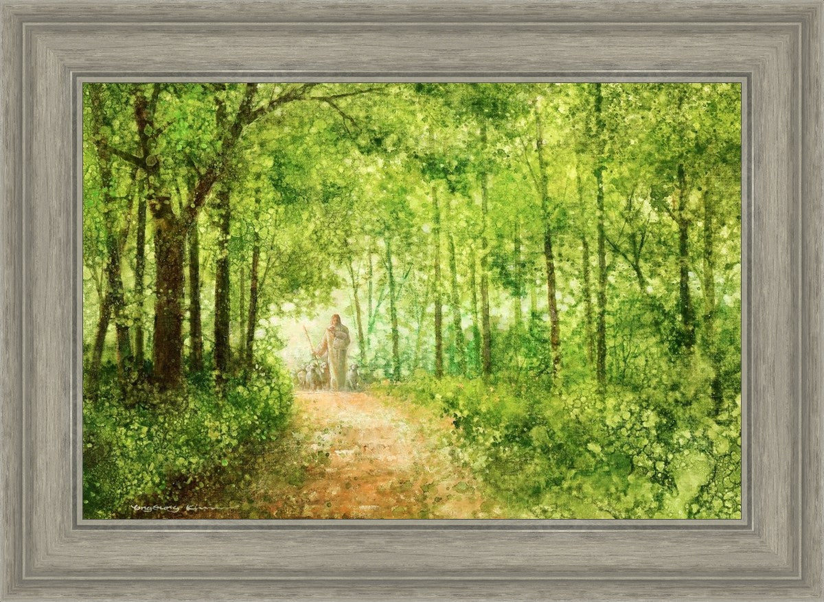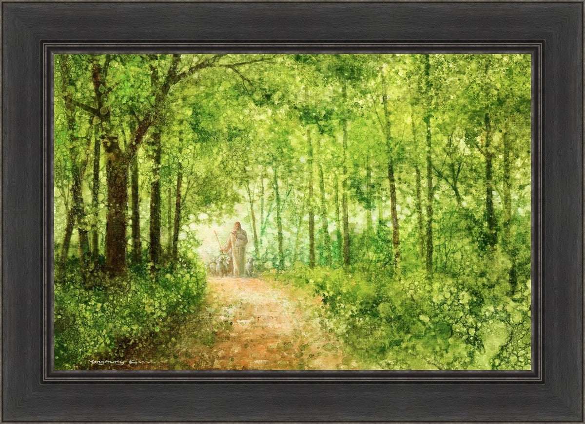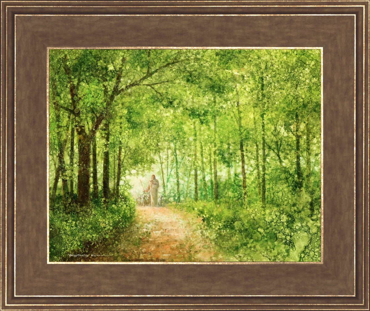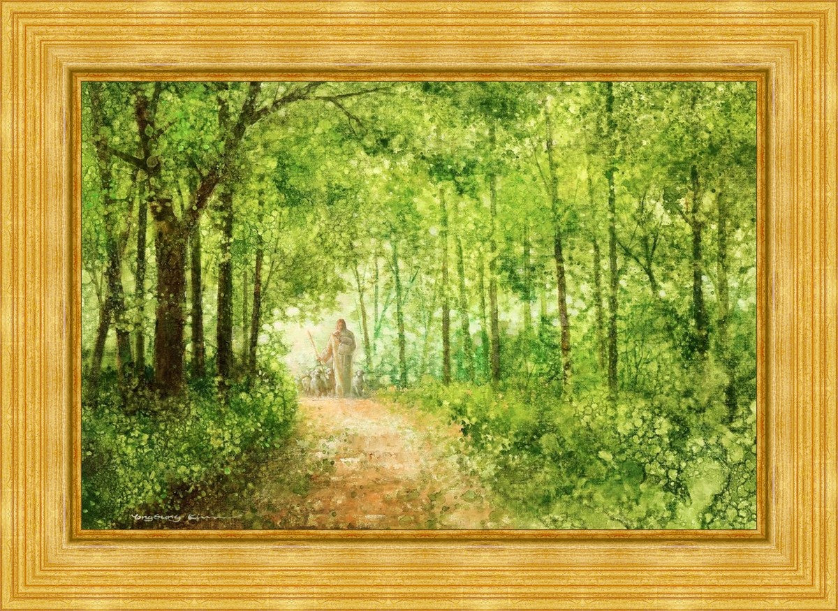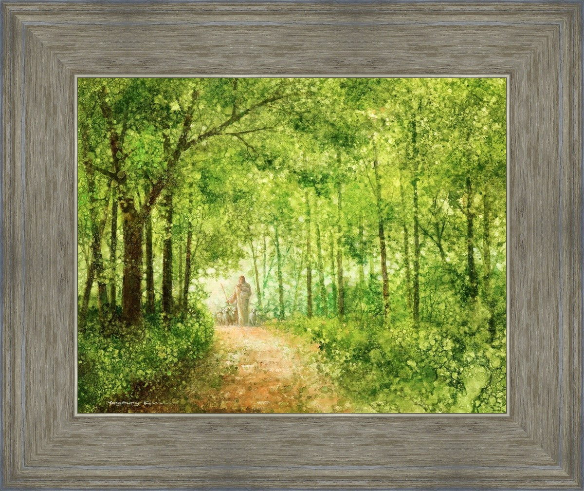 "Lead Thou Me On" by Yongsung Kim depicts Jesus Christ tenderly holding a lamb, leading a flock of sheep along a tree-lined path.