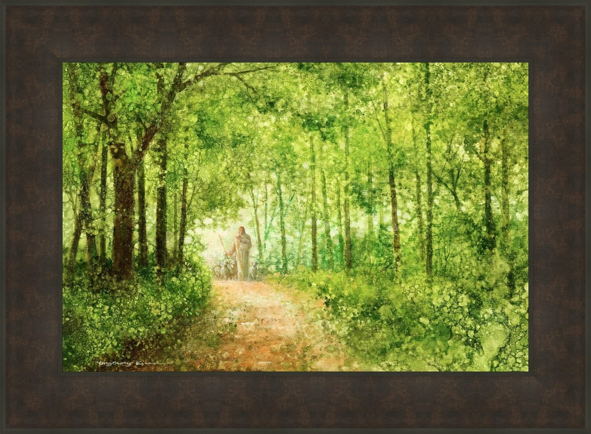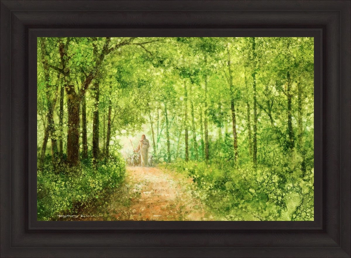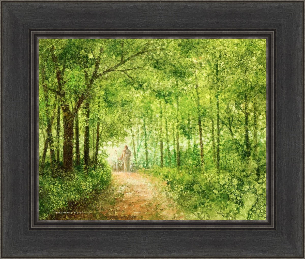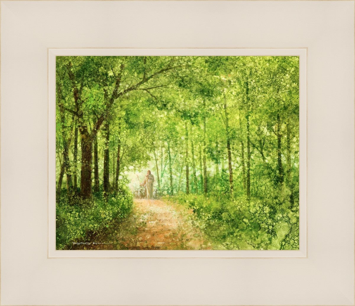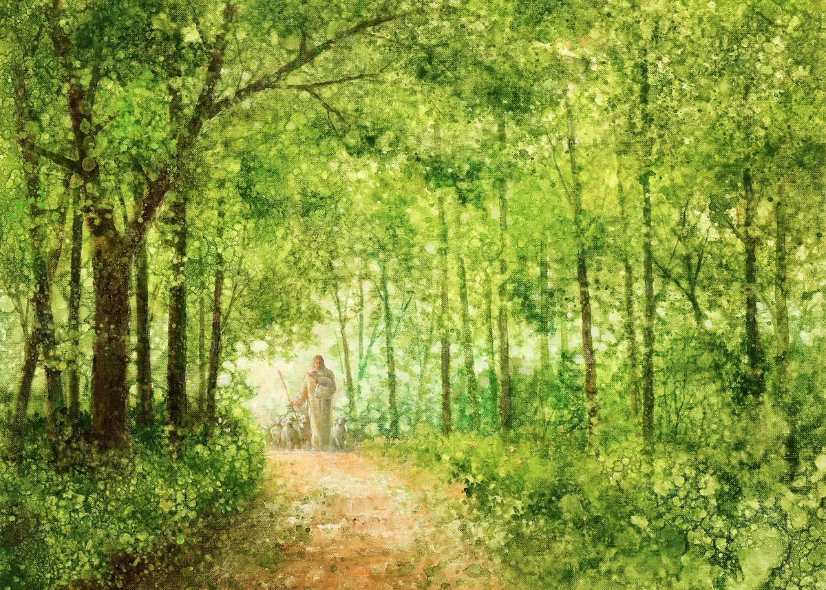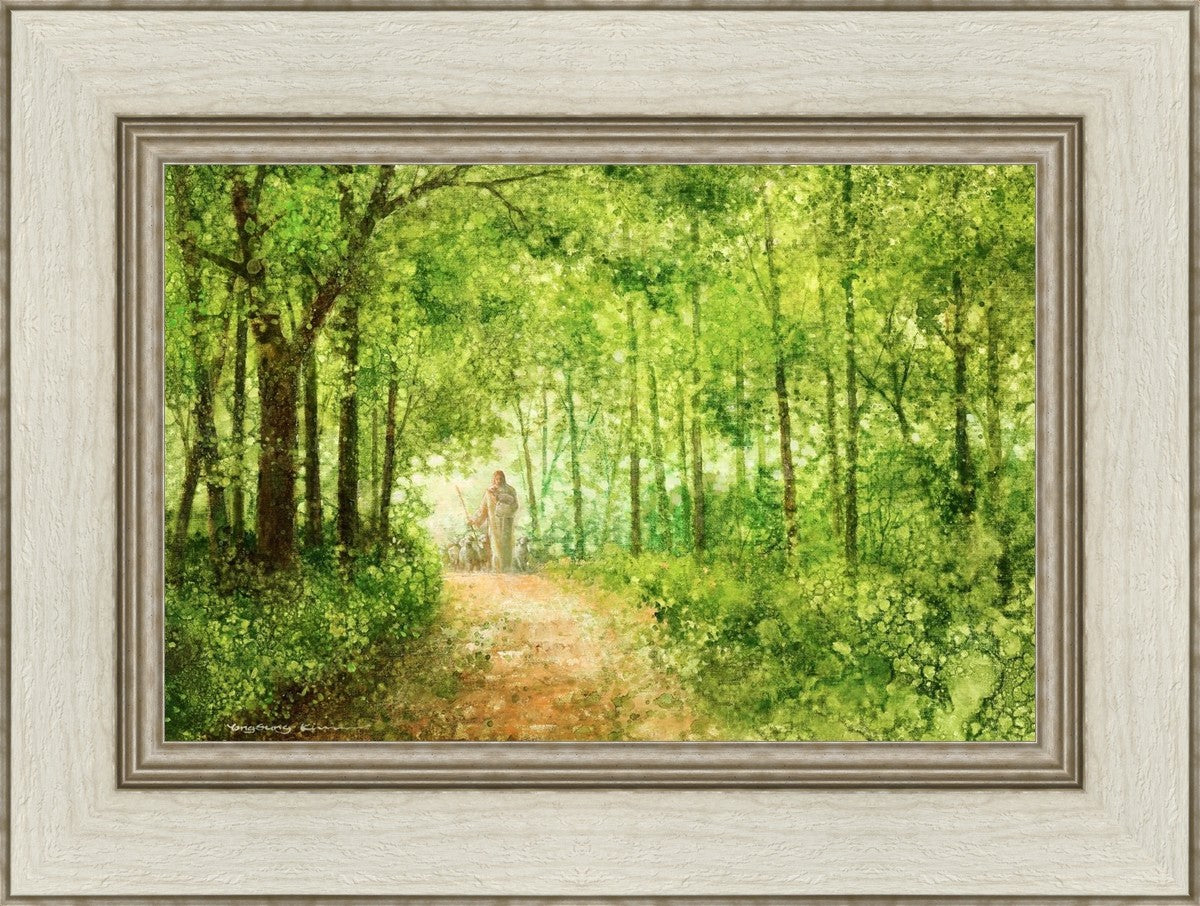"Lead Thou Me On" by Yongsung Kim depicts Jesus Christ tenderly holding a lamb, leading a flock of sheep along a tree-lined path.