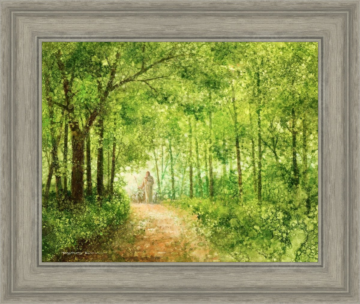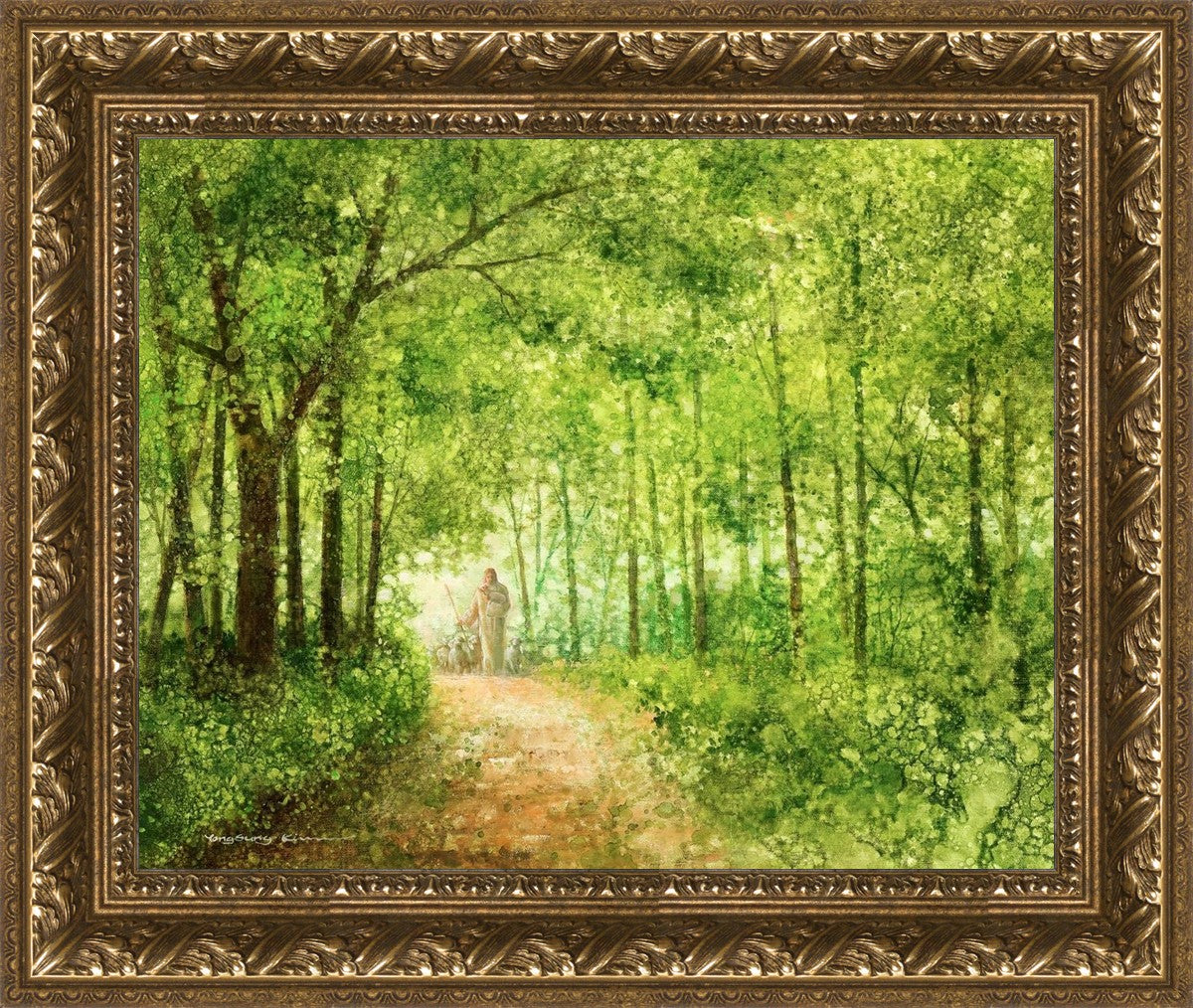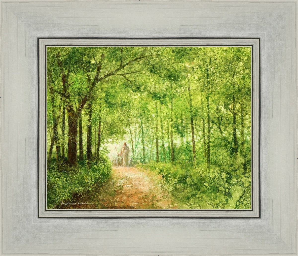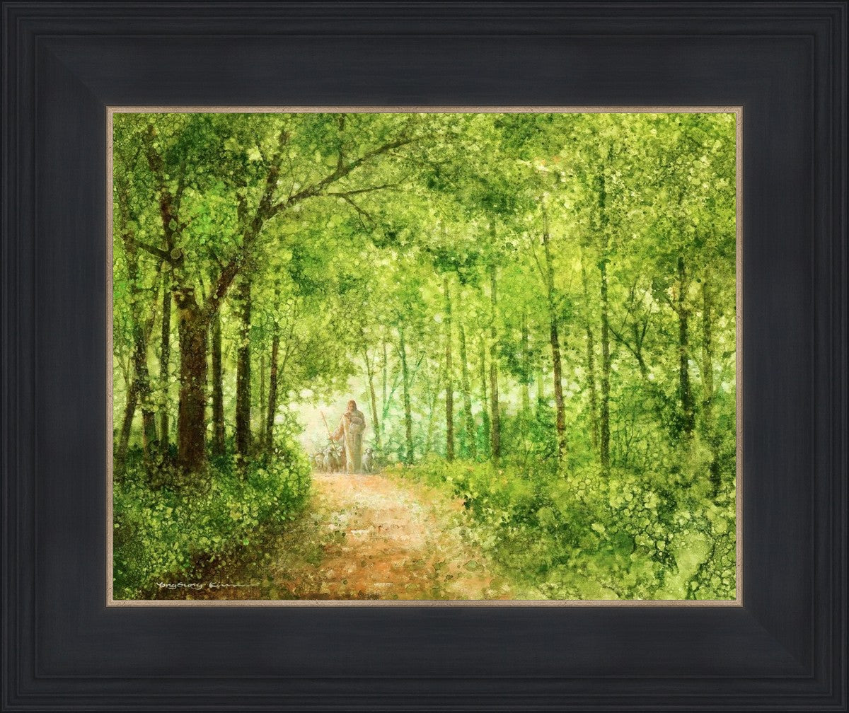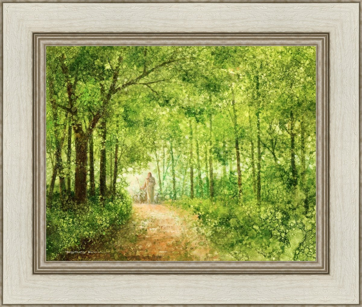 "Lead Thou Me On" by Yongsung Kim depicts Jesus Christ tenderly holding a lamb, leading a flock of sheep along a tree-lined path.