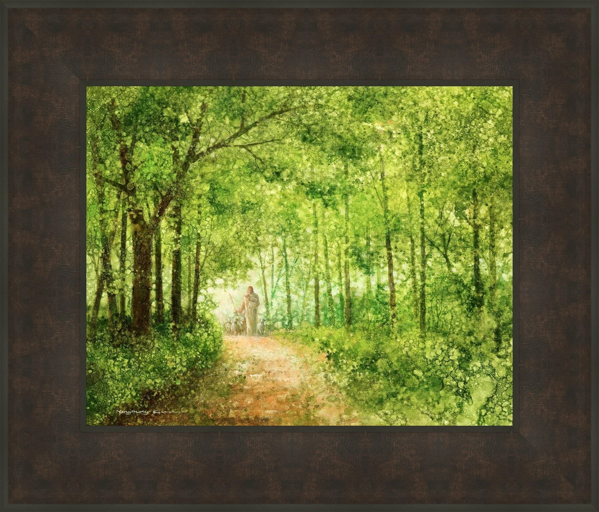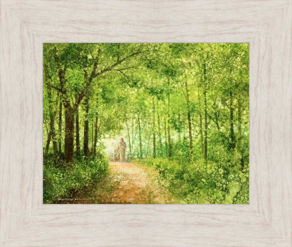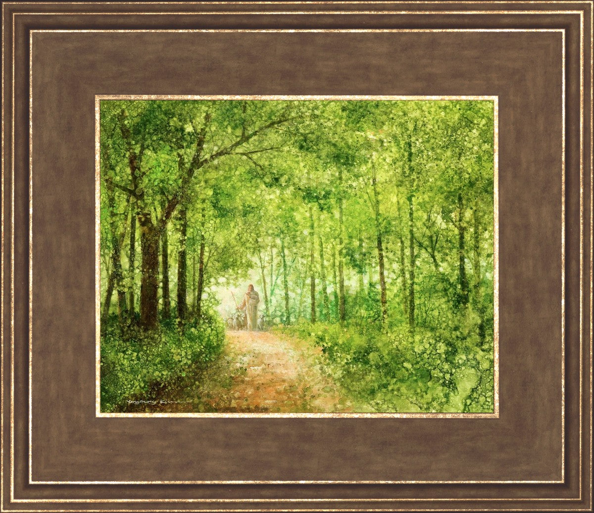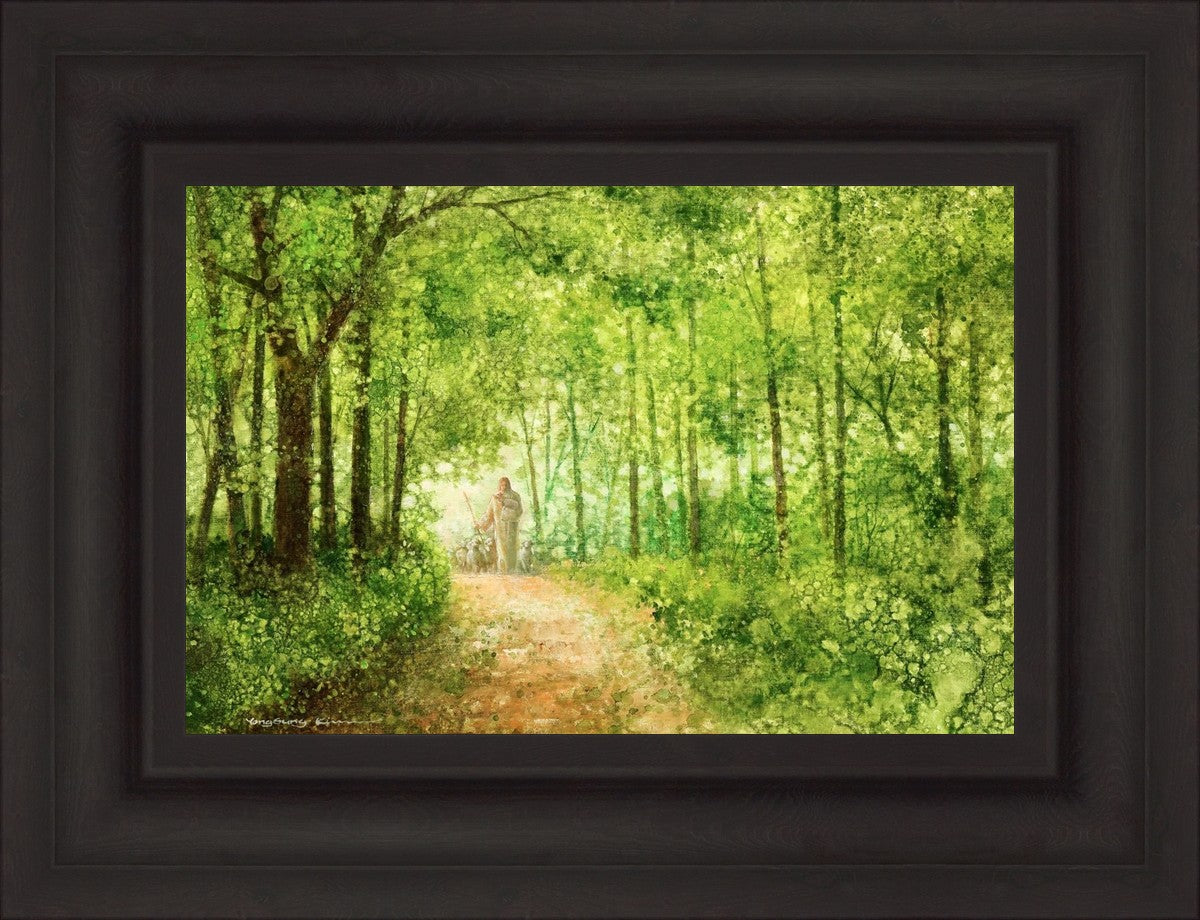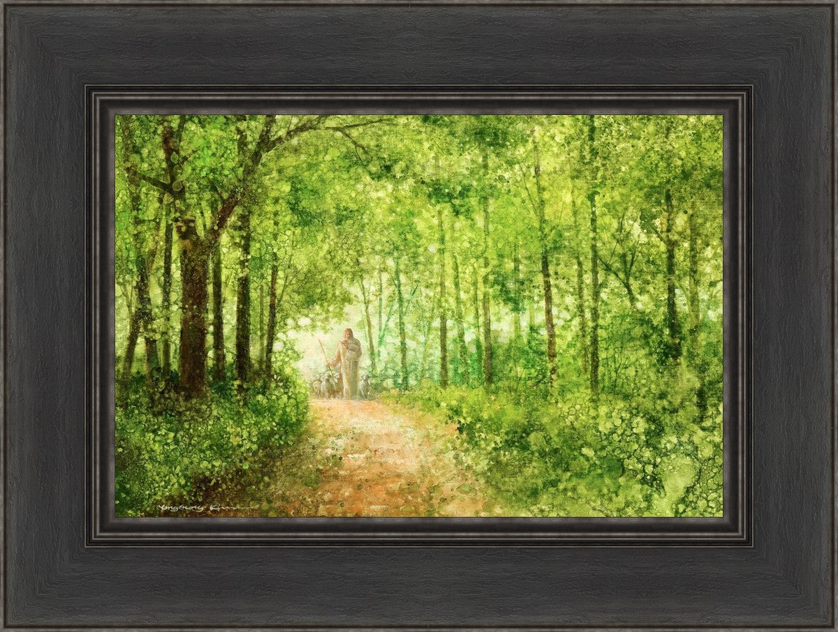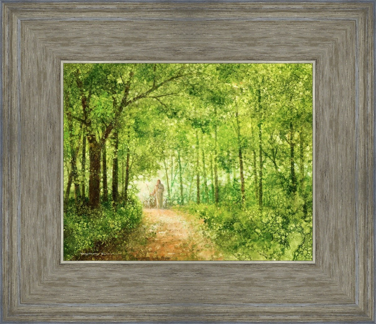 "Lead Thou Me On" by Yongsung Kim depicts Jesus Christ tenderly holding a lamb, leading a flock of sheep along a tree-lined path.