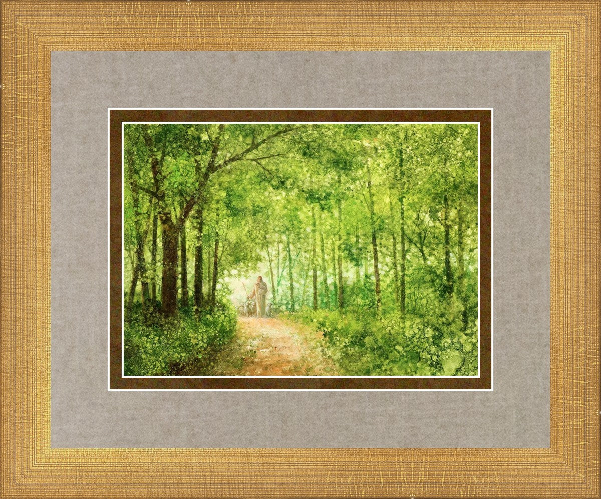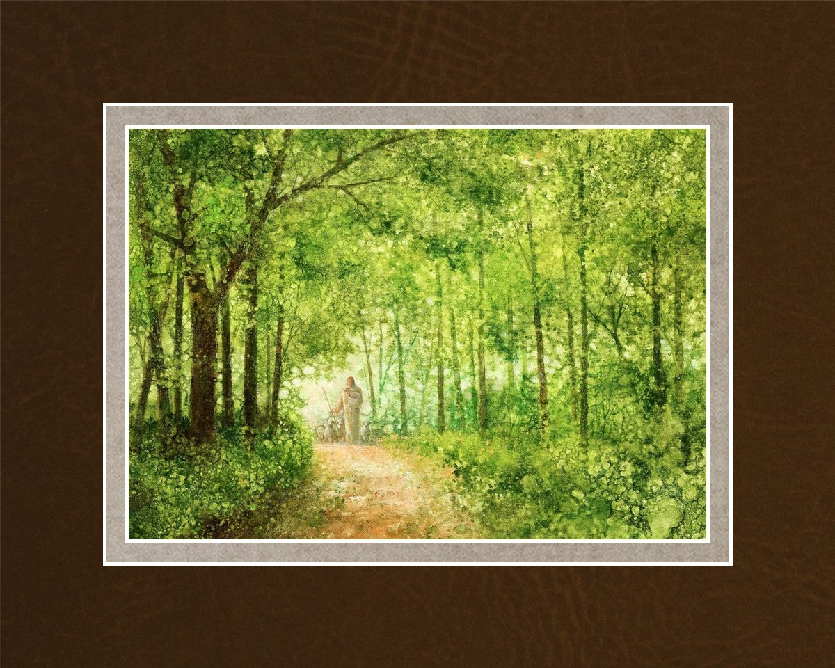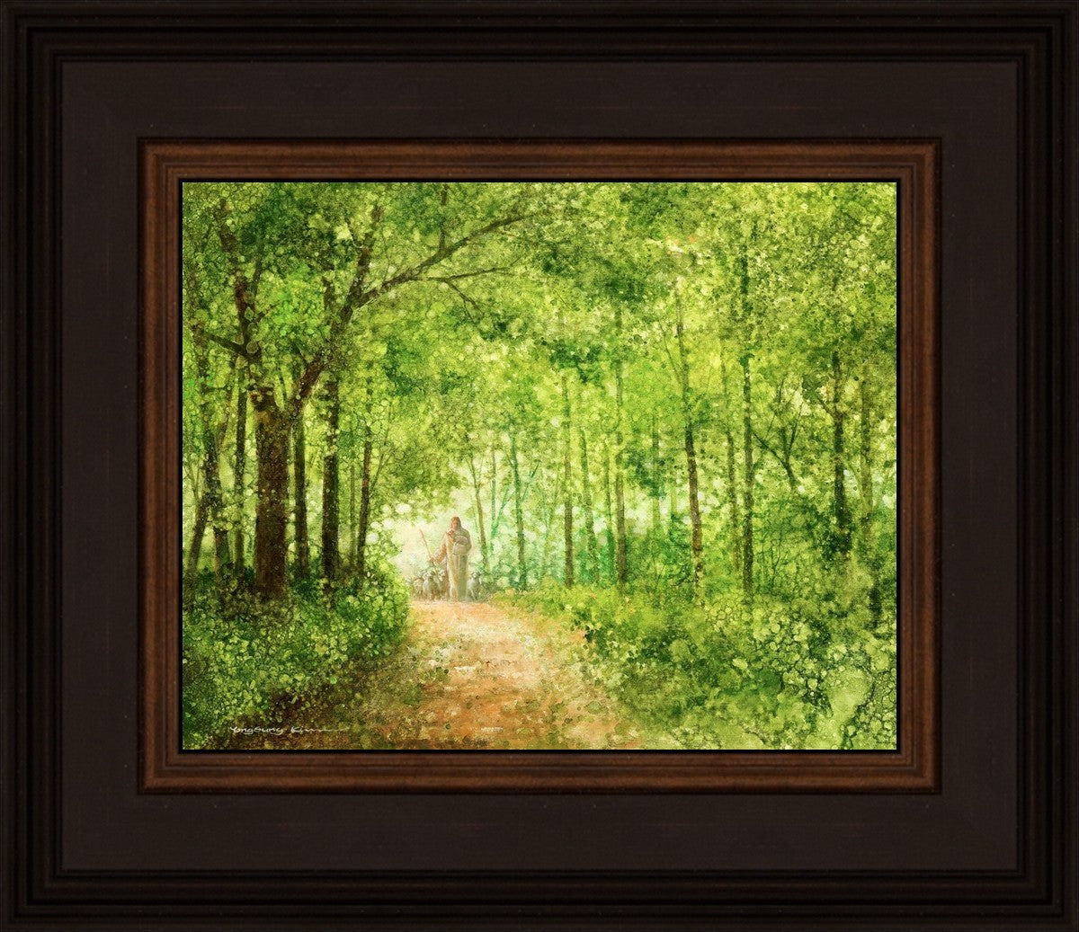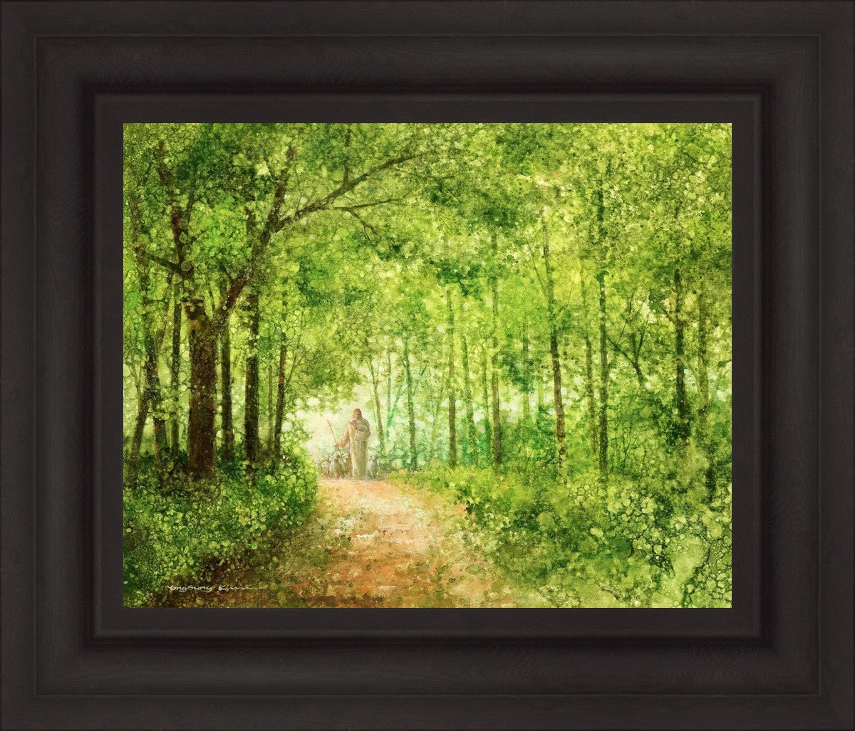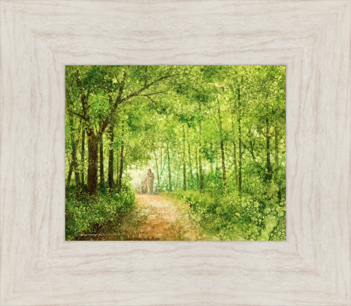 "Lead Thou Me On" by Yongsung Kim depicts Jesus Christ tenderly holding a lamb, leading a flock of sheep along a tree-lined path.