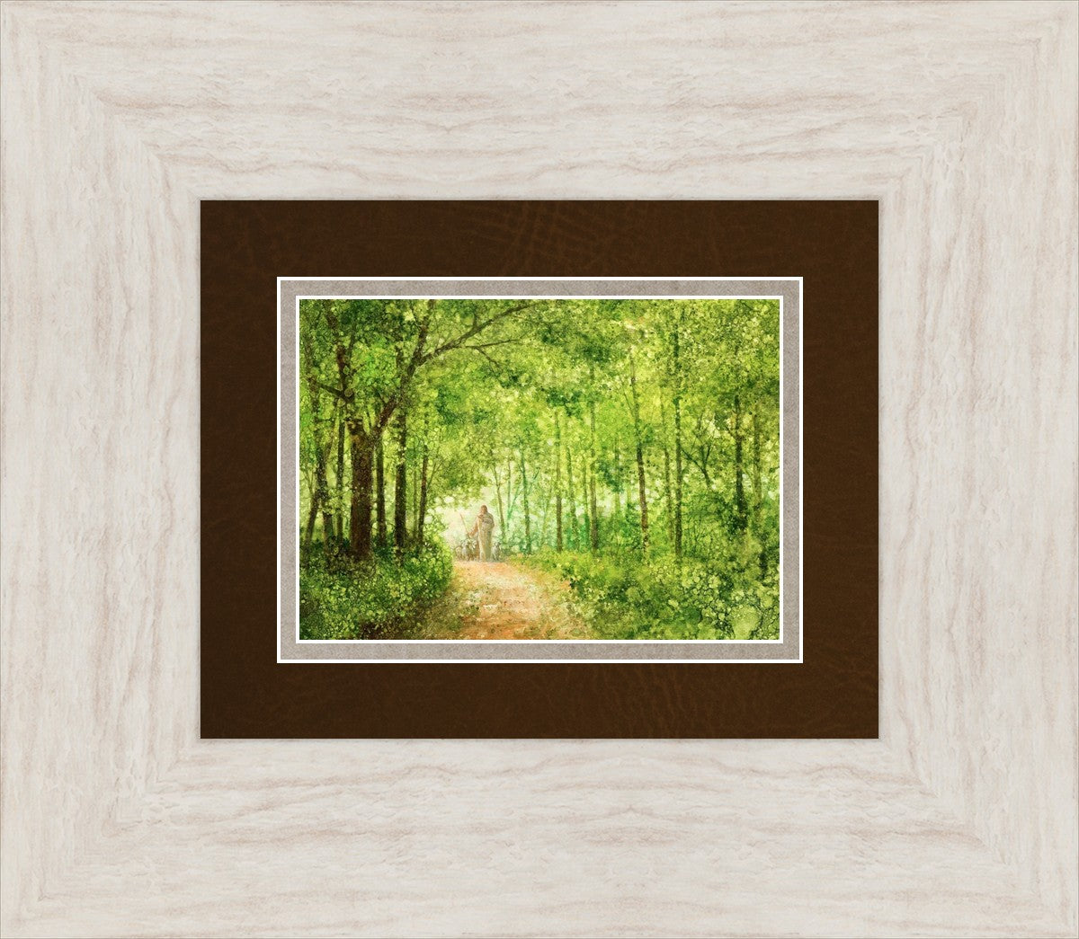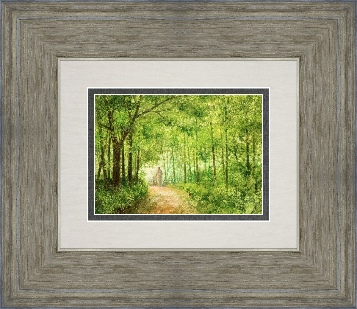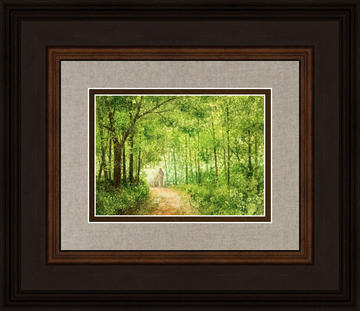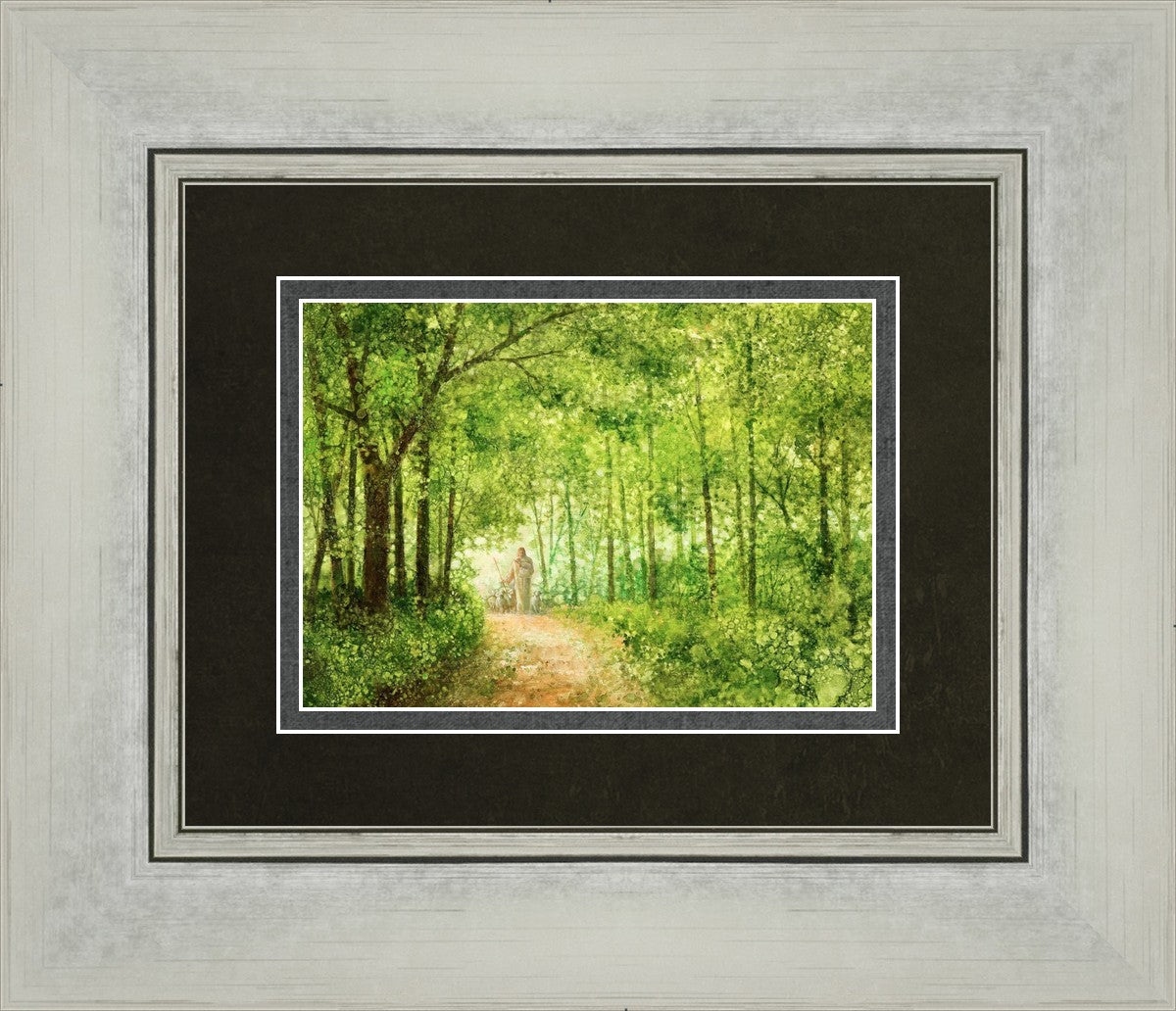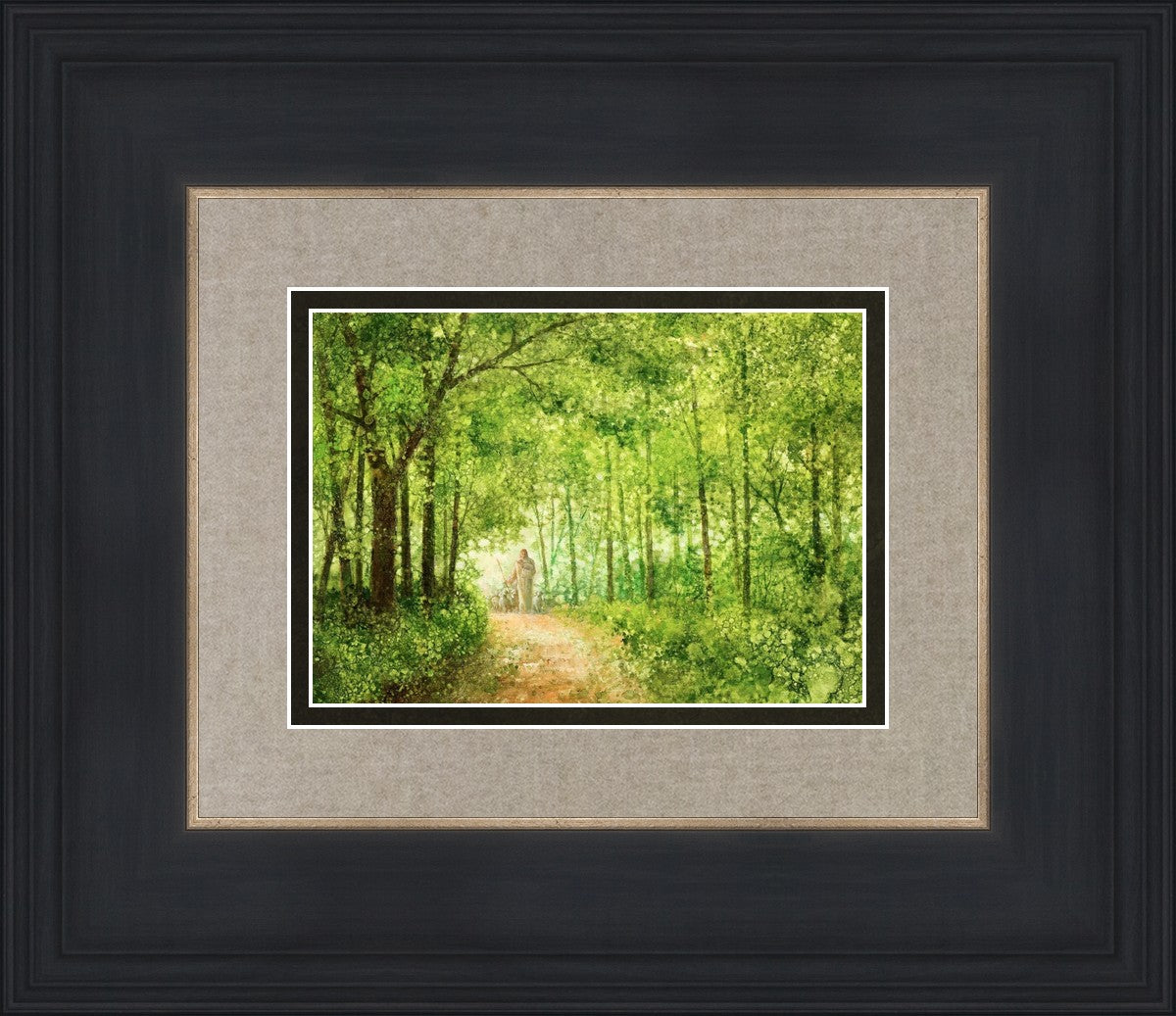 "Lead Thou Me On" by Yongsung Kim depicts Jesus Christ tenderly holding a lamb, leading a flock of sheep along a tree-lined path.