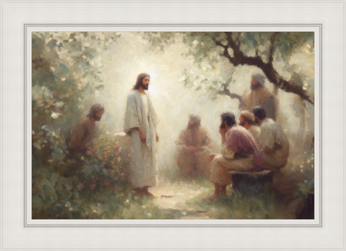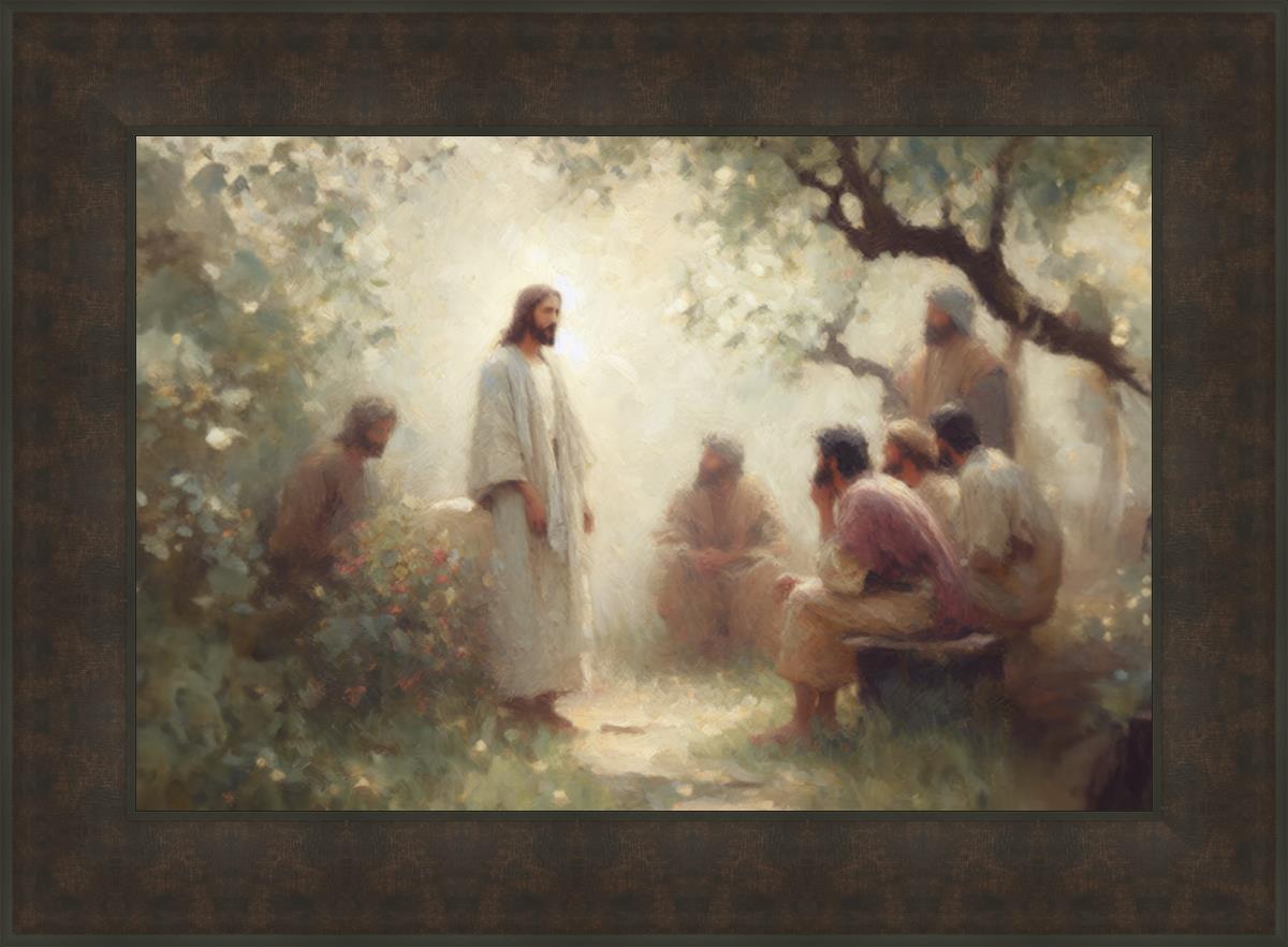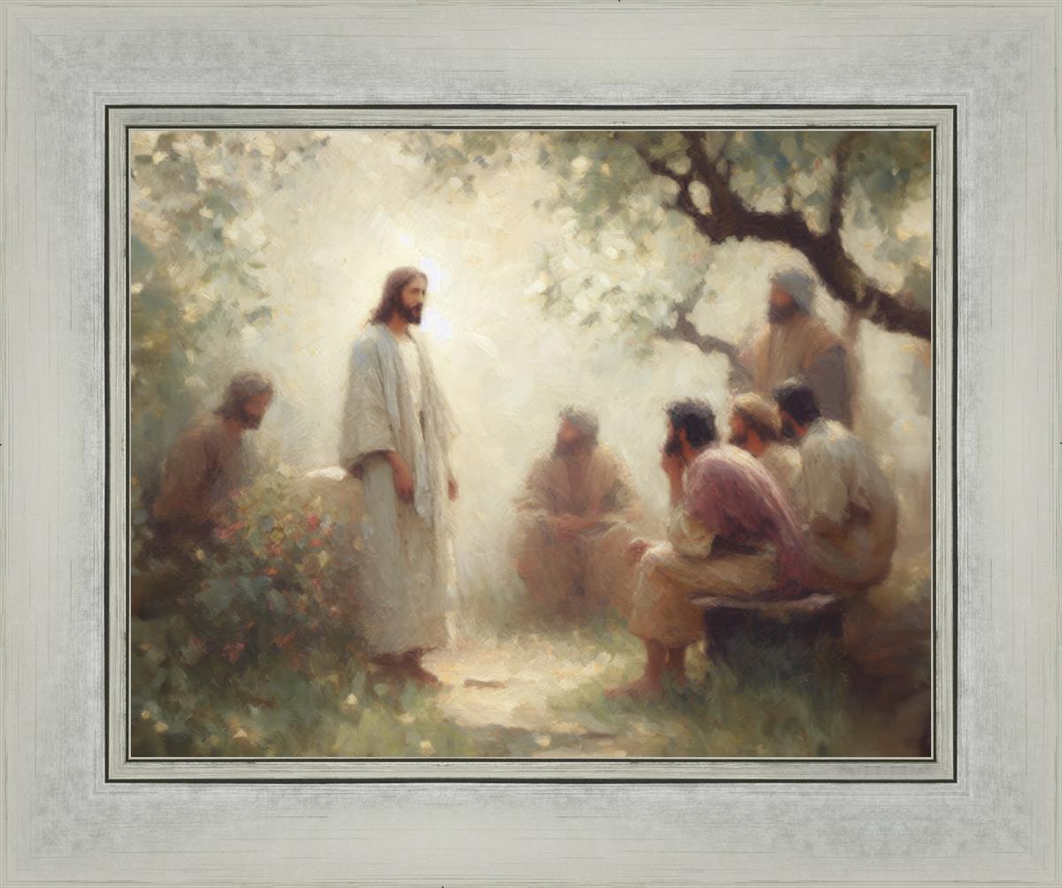 In "Learn of Me," Jesus teaches a small group of individuals in a grove of trees. With calmness, he imparts wisdom to his listeners, embodying Matthew 11:29: "Take my yoke upon you, and learn of me; for I am meek and lowly in heart: and ye shall find rest unto your souls.”