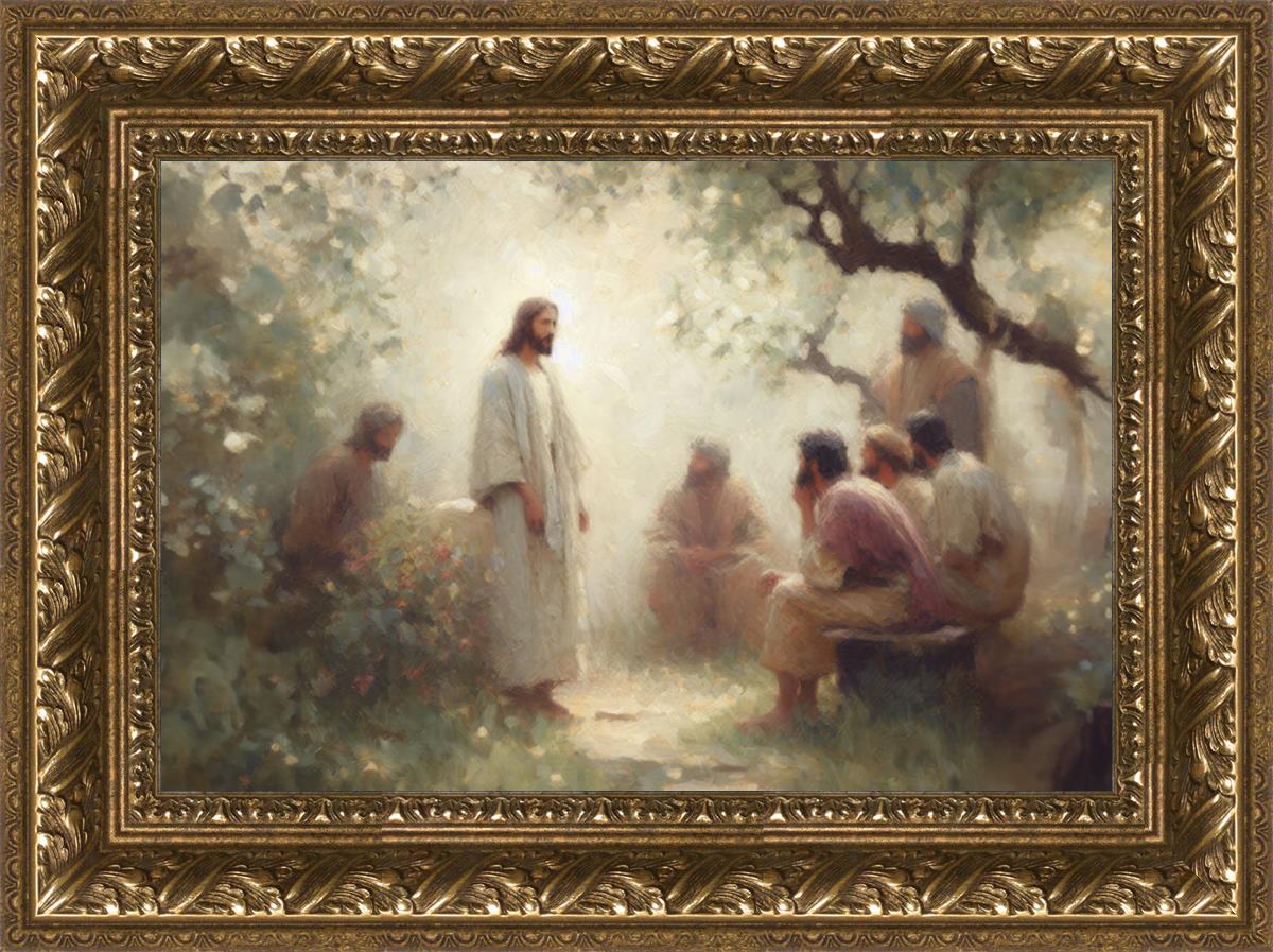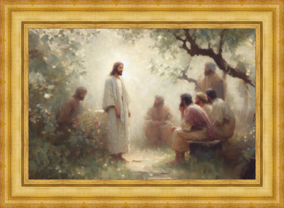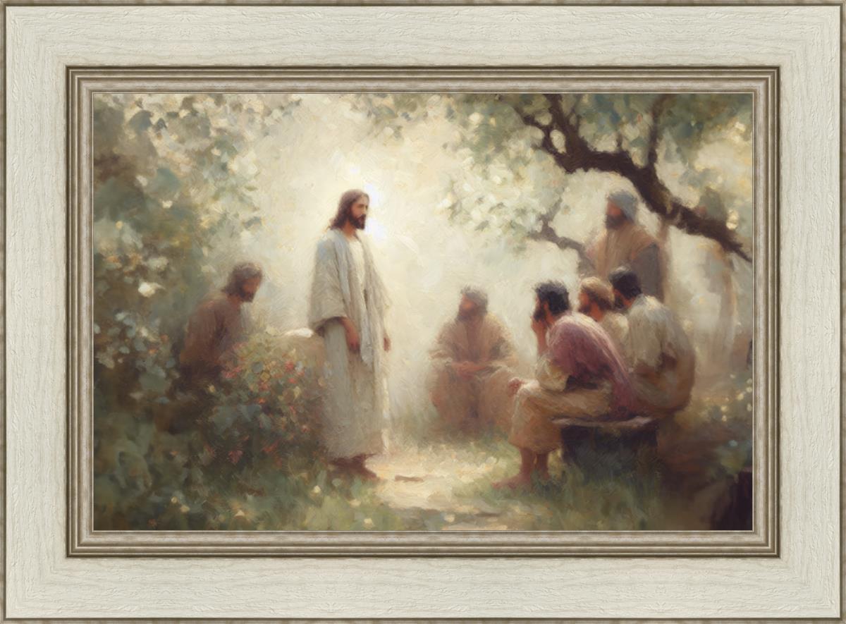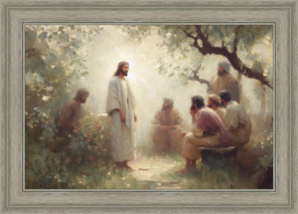 In "Learn of Me," Jesus teaches a small group of individuals in a grove of trees. With calmness, he imparts wisdom to his listeners, embodying Matthew 11:29: "Take my yoke upon you, and learn of me; for I am meek and lowly in heart: and ye shall find rest unto your souls.”
