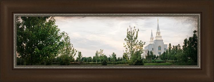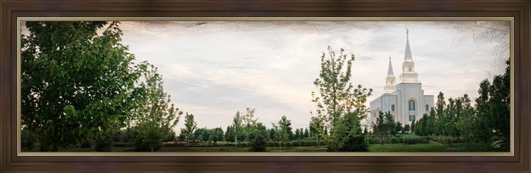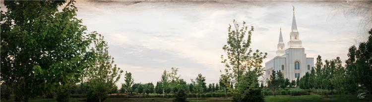 Since 1999 Landon has worked as an artisan in nearly 40 temples doing the decorative paint and gold leaf. He continues to do so as well as wood repair and graining. He was married in 2001 to Jacey Thomas in the Manti Utah temple. When she couldn’t find an image of the temple that she liked enough to purchase for their home, he decided to take one himself. That desire to create something original and different inspired his current series of temple art. They are taken from a panoramic viewpoint and stylized with an artistic border that reflect his paintings. All modern structures apart from the temple have been omitted.