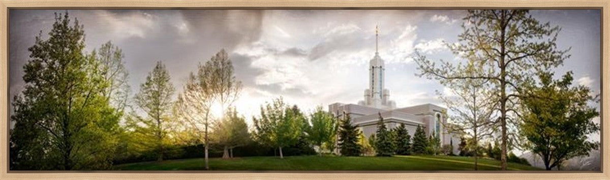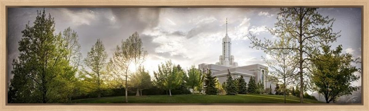 Since 1999 Landon has worked as an artisan in nearly 40 temples doing the decorative paint and gold leaf. He continues to do so as well as wood repair and graining. He was married in 2001 to Jacey Thomas in the Manti Utah temple. When she couldn’t find an image of the temple that she liked enough to purchase for their home, he decided to take one himself. That desire to create something original and different inspired his current series of temple art. They are taken from a panoramic viewpoint and stylized with an artistic border that reflect his paintings. All modern structures apart from the temple have been omitted.