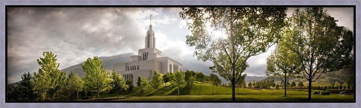 Since 1999 Landon has worked as an artisan in nearly 40 temples doing the decorative paint and gold leaf. He continues to do so as well as wood repair and graining. He was married in 2001 to Jacey Thomas in the Manti Utah temple. When she couldn’t find an image of the temple that she liked enough to purchase for their home, he decided to take one himself. That desire to create something original and different inspired his current series of temple art. They are taken from a panoramic viewpoint and stylized with an artistic border that reflect his paintings. All modern structures apart from the temple have been omitted.
