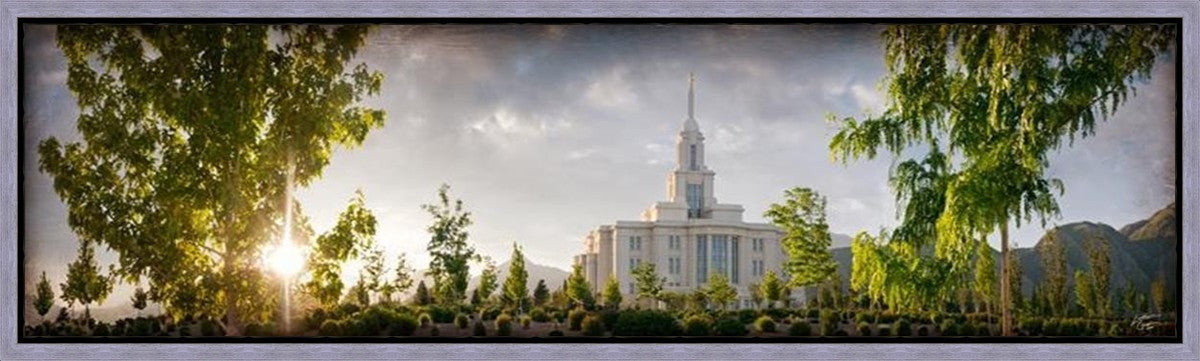 Since 1999 Landon has worked as an artisan in nearly 40 temples doing the decorative paint and gold leaf. He continues to do so as well as wood repair and graining. He was married in 2001 to Jacey Thomas in the Manti Utah temple. When she couldn’t find an image of the temple that she liked enough to purchase for their home, he decided to take one himself. That desire to create something original and different inspired his current series of temple art. They are taken from a panoramic viewpoint and stylized with an artistic border that reflect his paintings. All modern structures apart from the temple have been omitted.