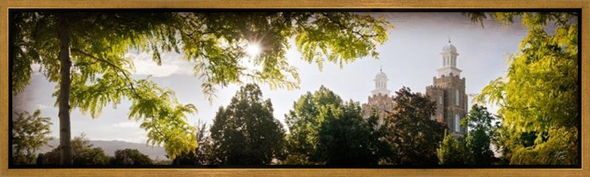 Since 1999 Landon has worked as an artisan in nearly 40 temples doing the decorative paint and gold leaf. He continues to do so as well as wood repair and graining. He was married in 2001 to Jacey Thomas in the Manti Utah temple. When she couldn’t find an image of the temple that she liked enough to purchase for their home, he decided to take one himself. That desire to create something original and different inspired his current series of temple art. They are taken from a panoramic viewpoint and stylized with an artistic border that reflect his paintings. All modern structures apart from the temple have been omitted.