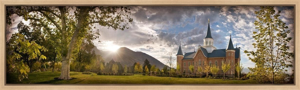 Since 1999 Landon has worked as an artisan in nearly 40 temples doing the decorative paint and gold leaf. He continues to do so as well as wood repair and graining. He was married in 2001 to Jacey Thomas in the Manti Utah temple. When she couldn’t find an image of the temple that she liked enough to purchase for their home, he decided to take one himself. That desire to create something original and different inspired his current series of temple art. They are taken from a panoramic viewpoint and stylized with an artistic border that reflect his paintings. All modern structures apart from the temple have been omitted.