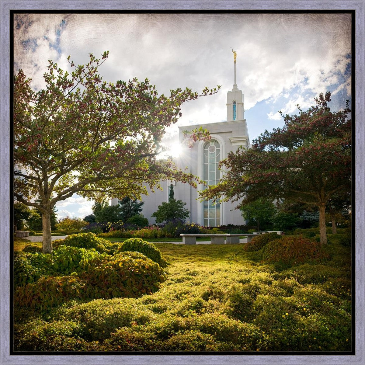 Since 1999 Landon has worked as an artisan in nearly 40 temples doing the decorative paint and gold leaf. He continues to do so as well as wood repair and graining. He was married in 2001 to Jacey Thomas in the Manti Utah temple. When she couldn’t find an image of the temple that she liked enough to purchase for their home, he decided to take one himself. That desire to create something original and different inspired his current series of temple art. They are taken from a panoramic viewpoint and stylized with an artistic border that reflect his paintings. All modern structures apart from the temple have been omitted.