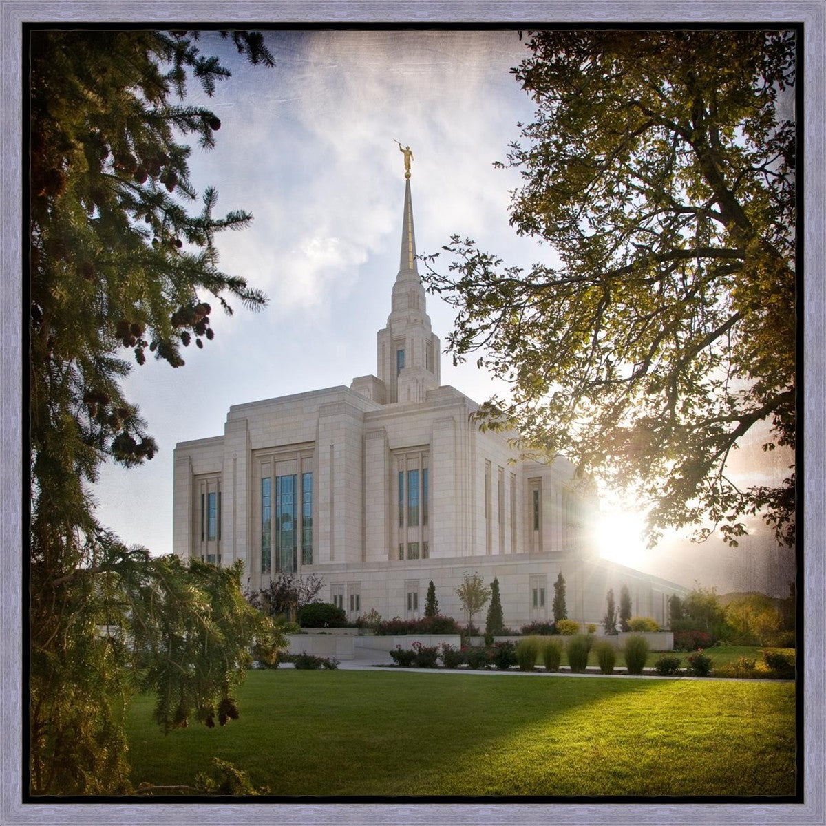Since 1999 Landon has worked as an artisan in nearly 40 temples doing the decorative paint and gold leaf. He continues to do so as well as wood repair and graining. He was married in 2001 to Jacey Thomas in the Manti Utah temple. When she couldn’t find an image of the temple that she liked enough to purchase for their home, he decided to take one himself. That desire to create something original and different inspired his current series of temple art. They are taken from a panoramic viewpoint and stylized with an artistic border that reflect his paintings. All modern structures apart from the temple have been omitted.