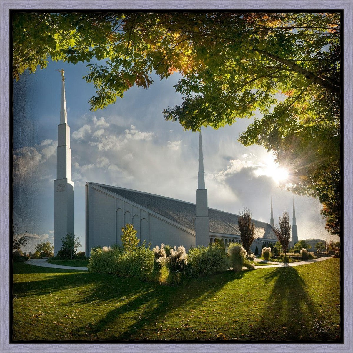 Since 1999 Landon has worked as an artisan in nearly 40 temples doing the decorative paint and gold leaf. He continues to do so as well as wood repair and graining. He was married in 2001 to Jacey Thomas in the Manti Utah temple. When she couldn’t find an image of the temple that she liked enough to purchase for their home, he decided to take one himself. That desire to create something original and different inspired his current series of temple art. They are taken from a panoramic viewpoint and stylized with an artistic border that reflect his paintings. All modern structures apart from the temple have been omitted.