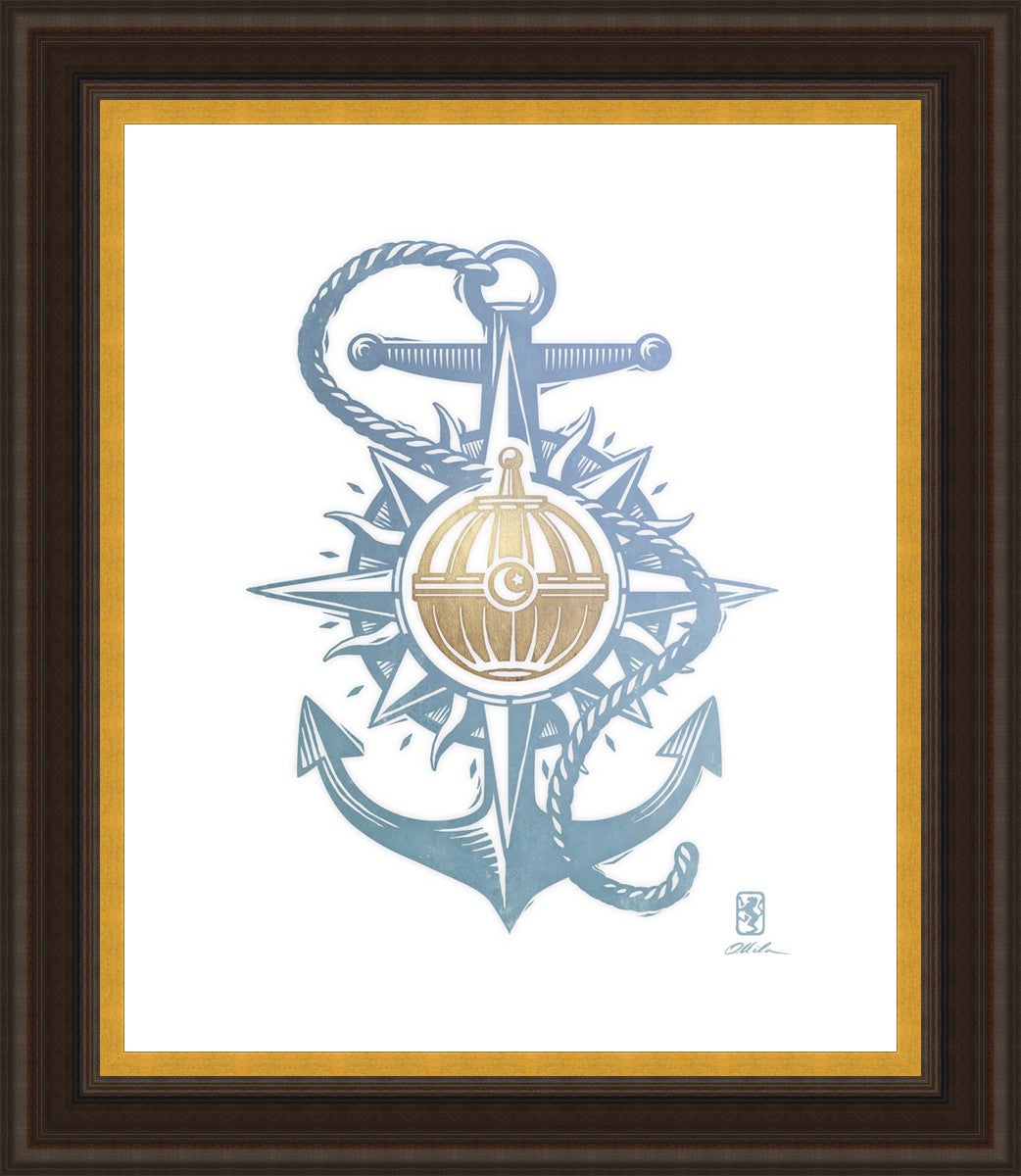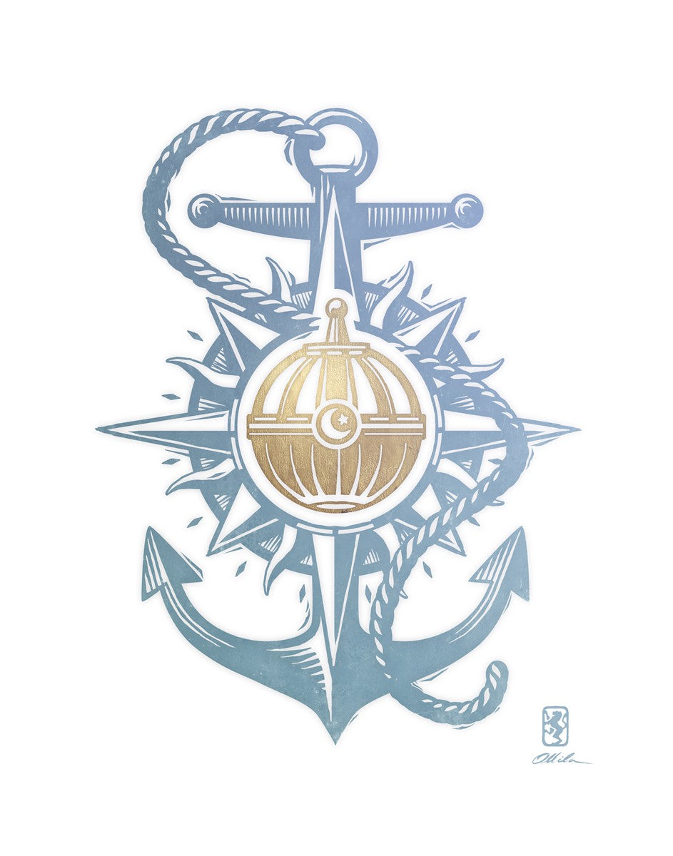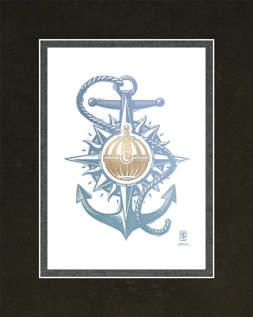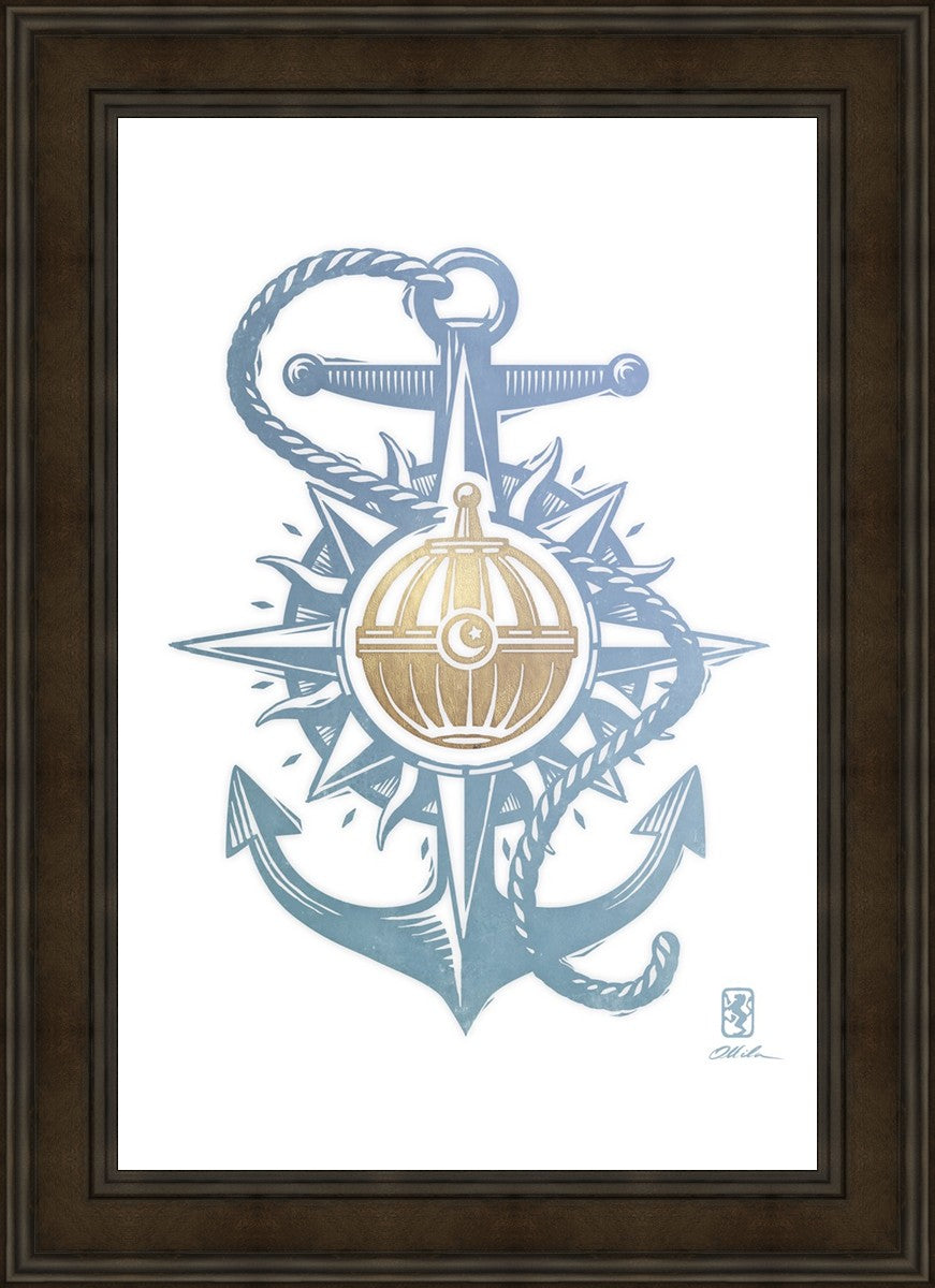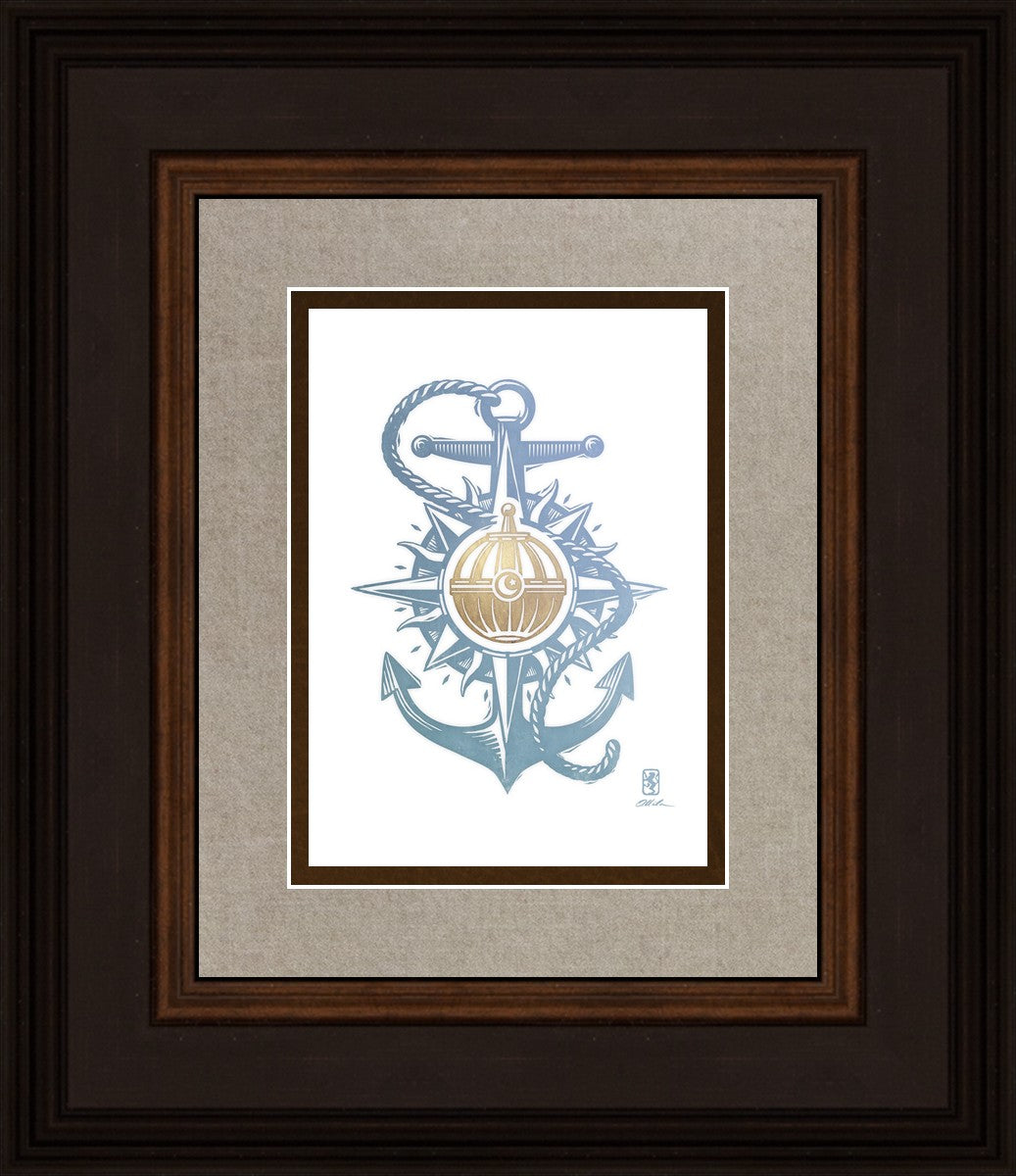 This piece is a hand carved woodcut relief print. The artist was inspired to create this piece by the story of Lehi's journey across the sea. The Liahona represents the word of Christ, which can act as a compass to guide us, and an anchor to which we may hold.