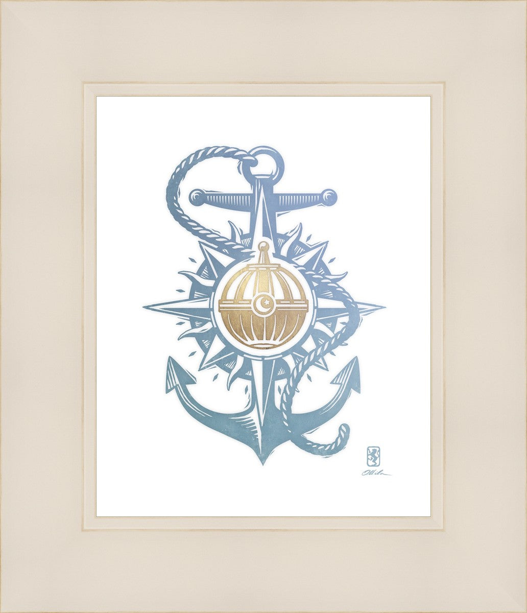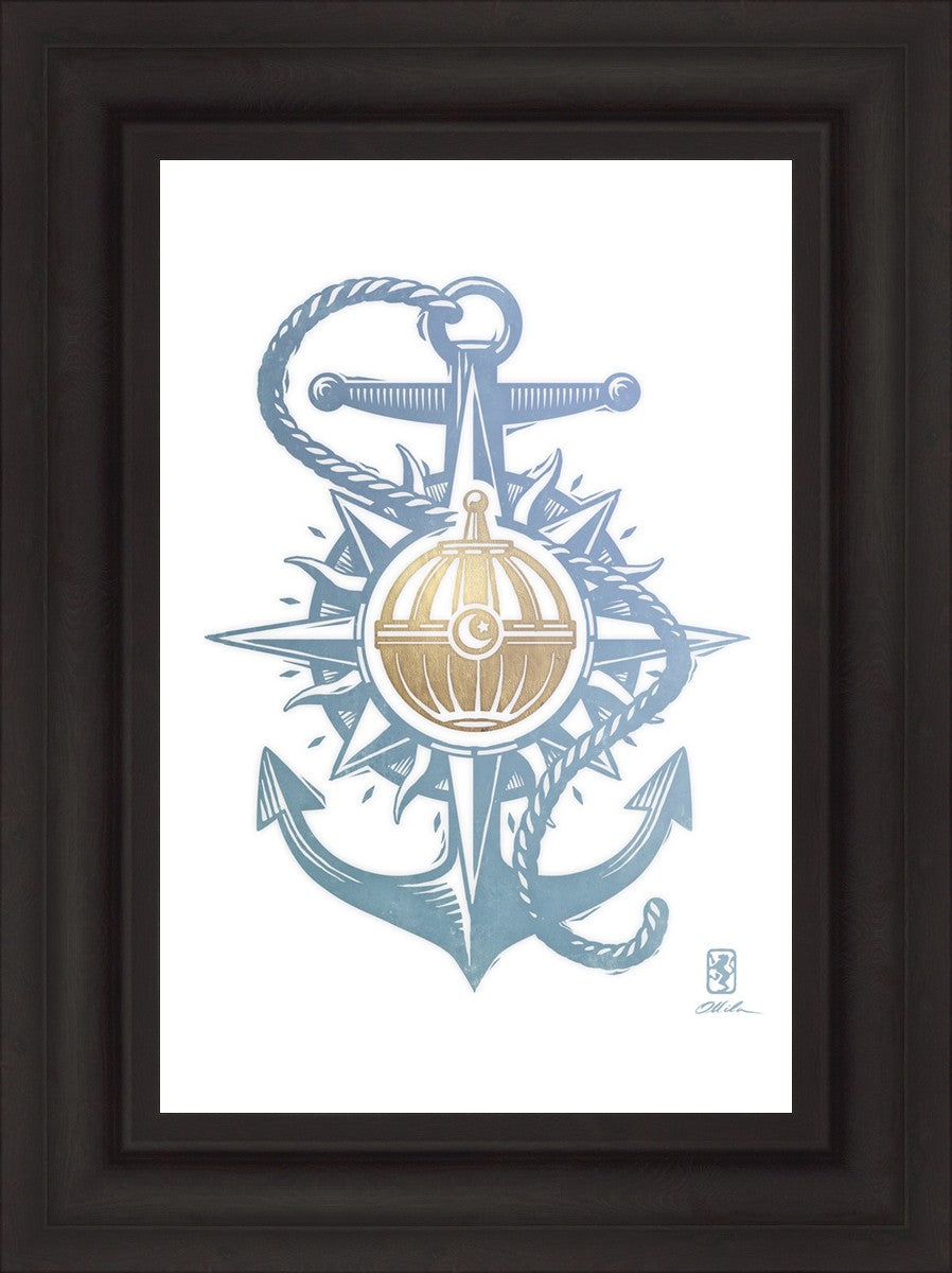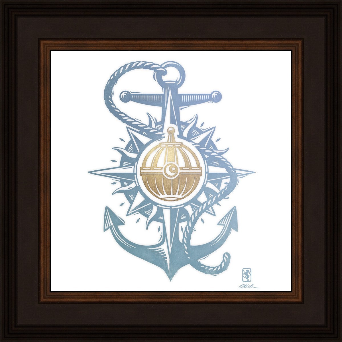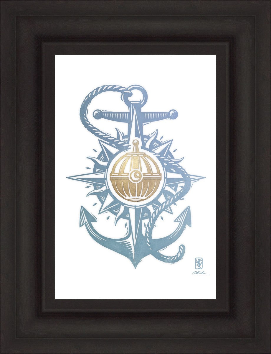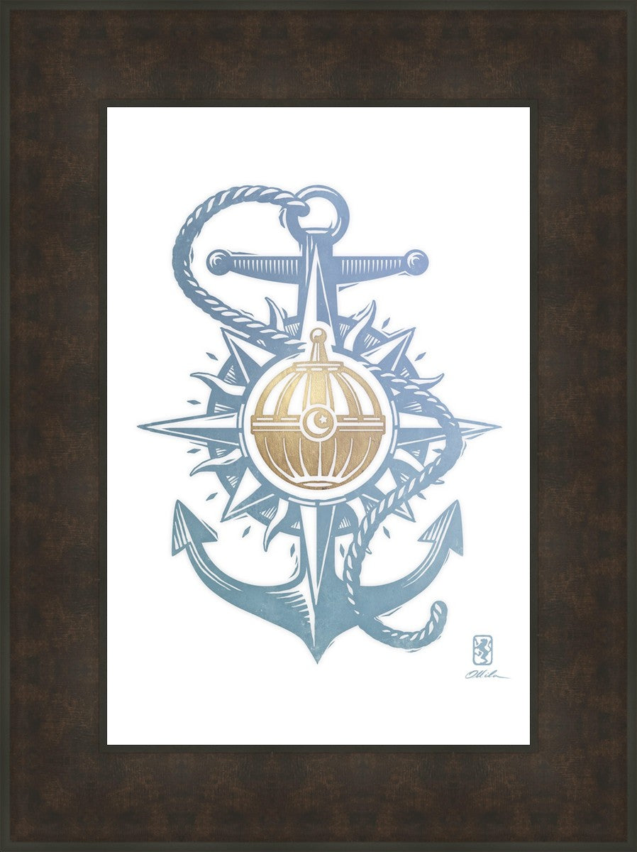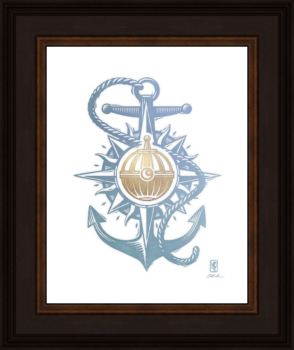 This piece is a hand carved woodcut relief print. The artist was inspired to create this piece by the story of Lehi's journey across the sea. The Liahona represents the word of Christ, which can act as a compass to guide us, and an anchor to which we may hold.