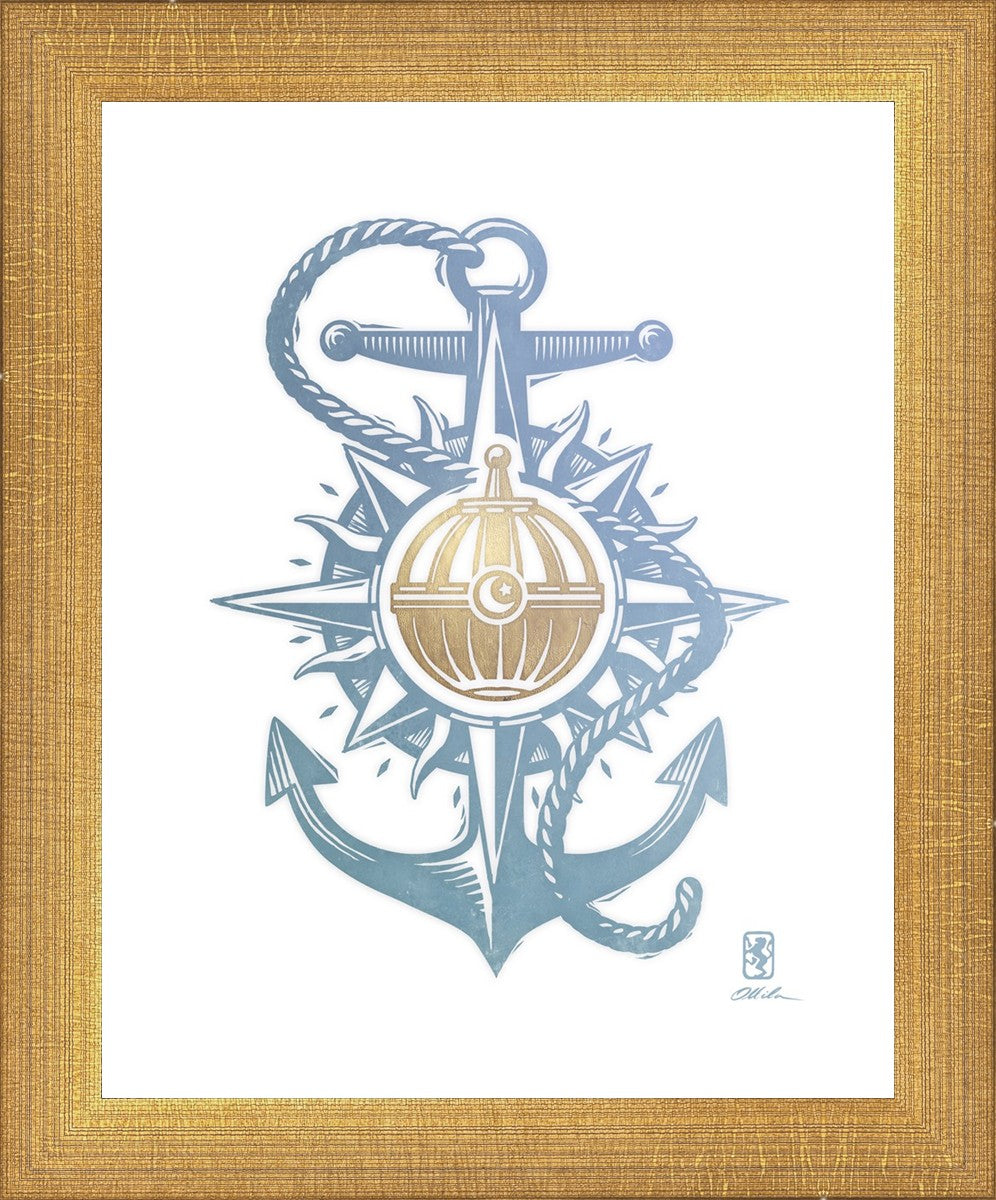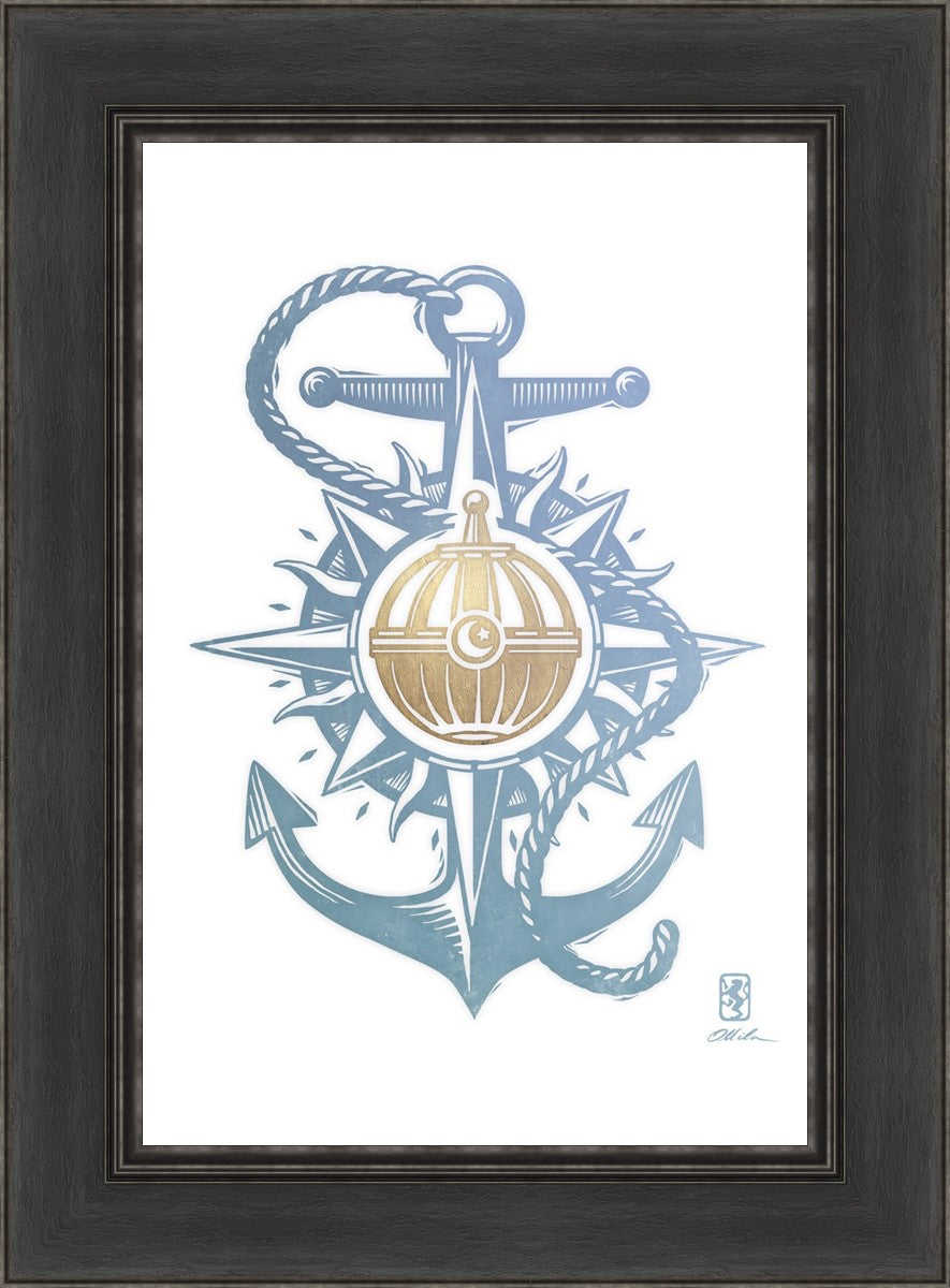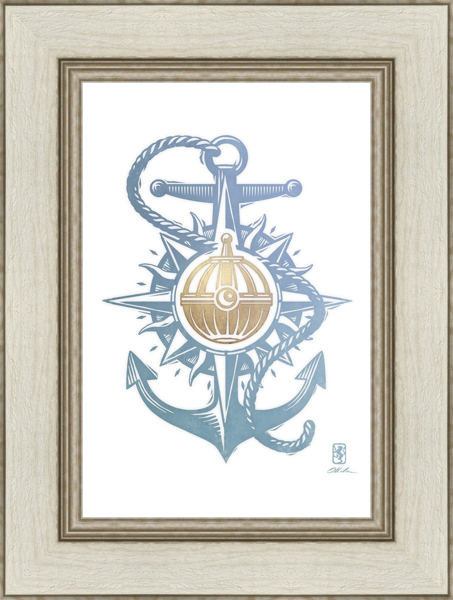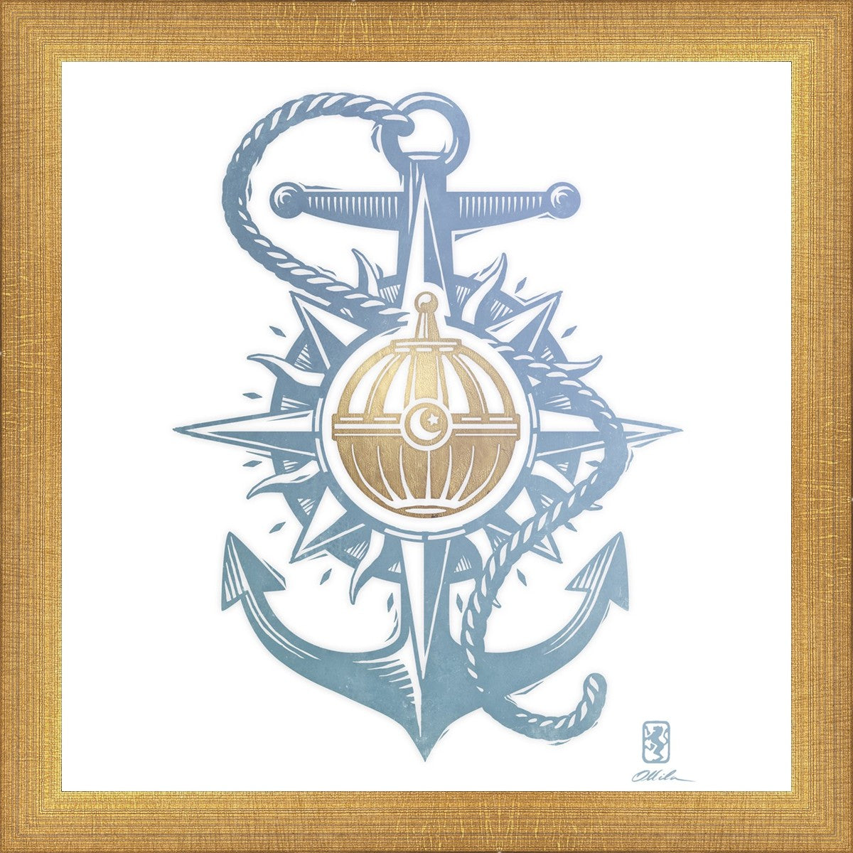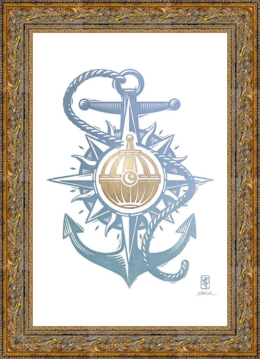 This piece is a hand carved woodcut relief print. The artist was inspired to create this piece by the story of Lehi's journey across the sea. The Liahona represents the word of Christ, which can act as a compass to guide us, and an anchor to which we may hold.