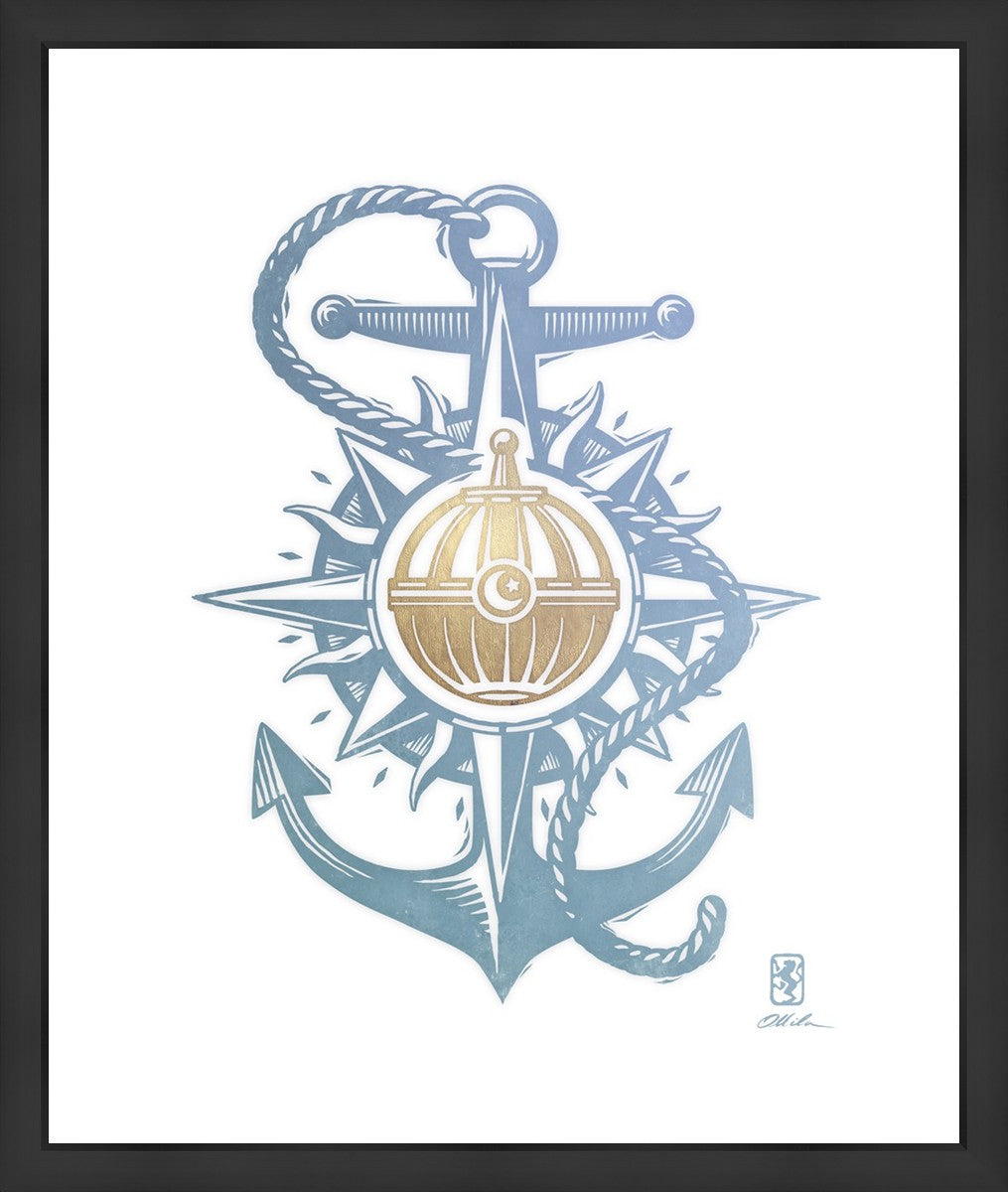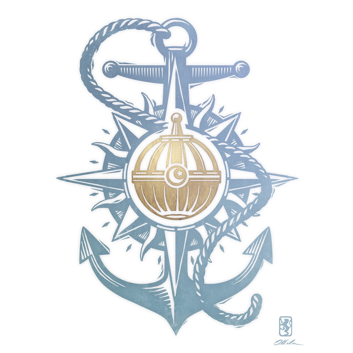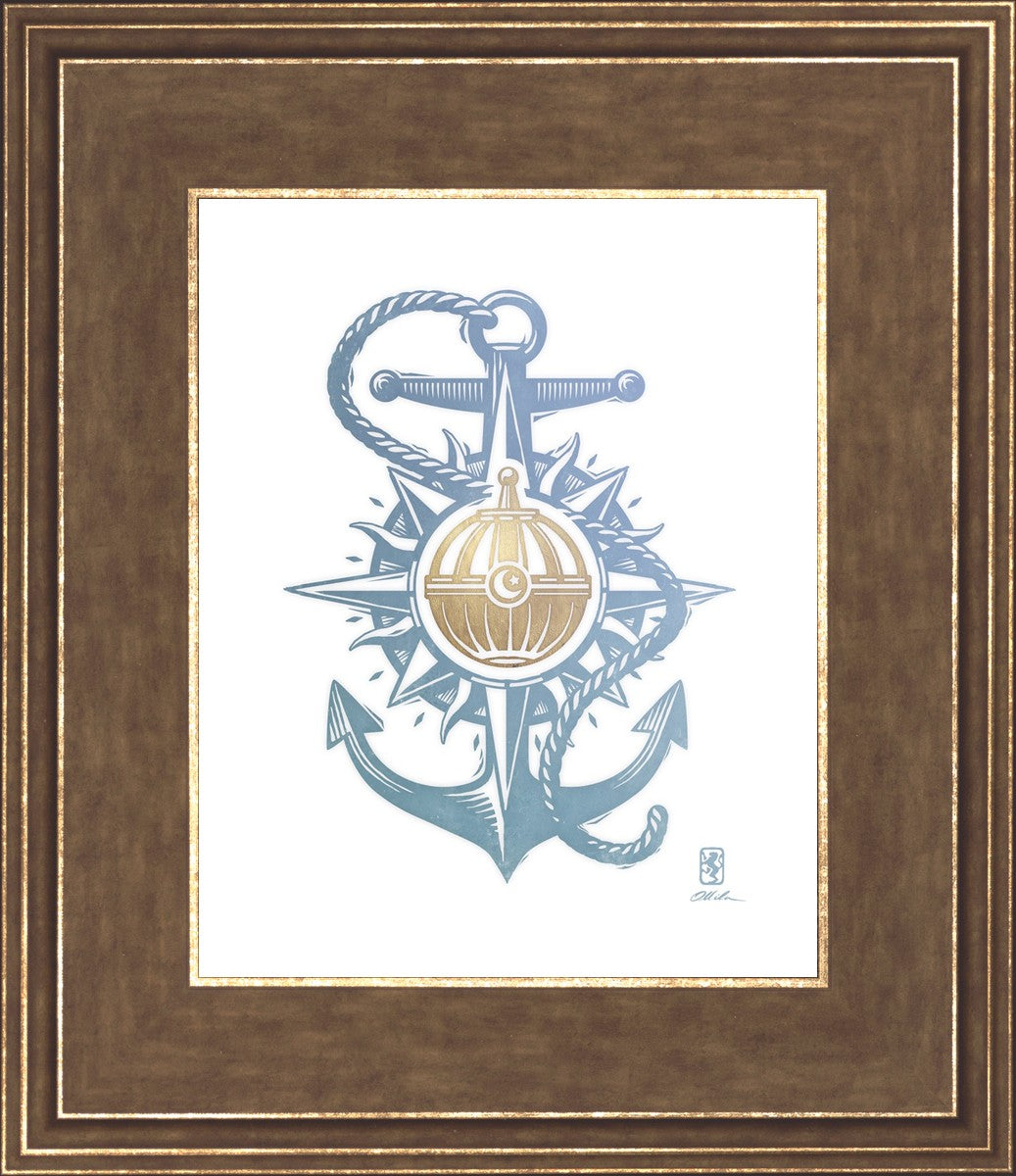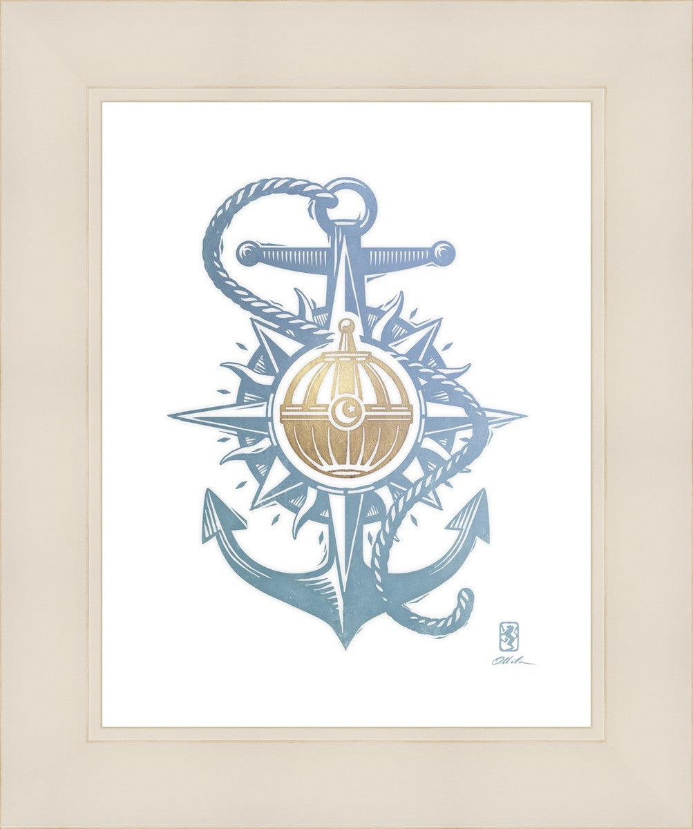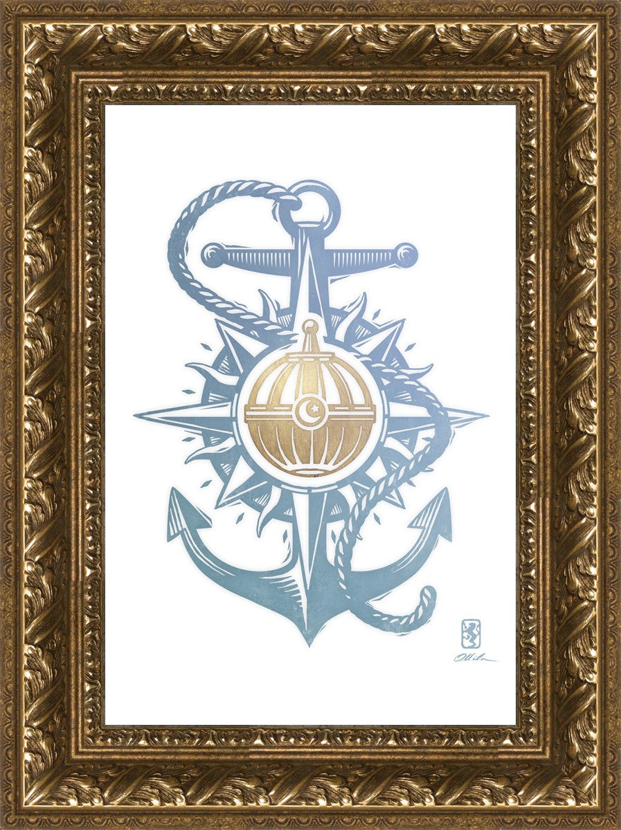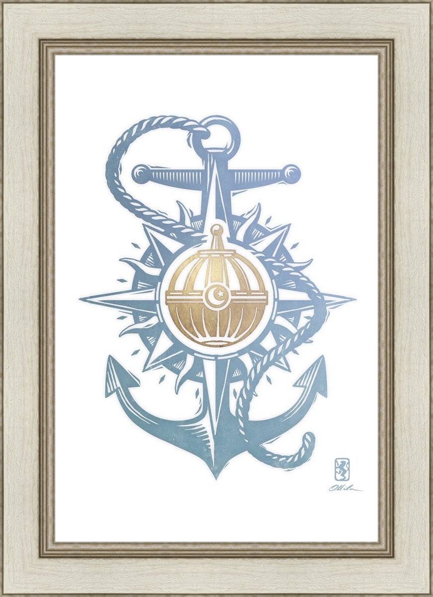 This piece is a hand carved woodcut relief print. The artist was inspired to create this piece by the story of Lehi's journey across the sea. The Liahona represents the word of Christ, which can act as a compass to guide us, and an anchor to which we may hold.