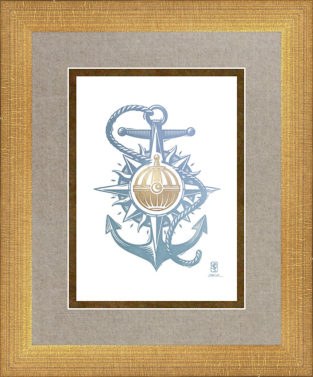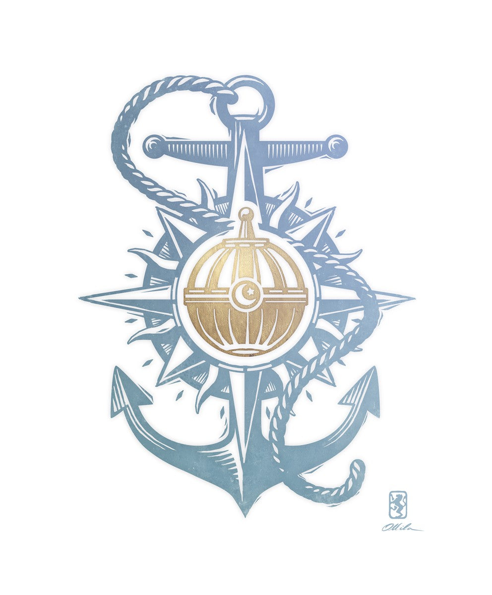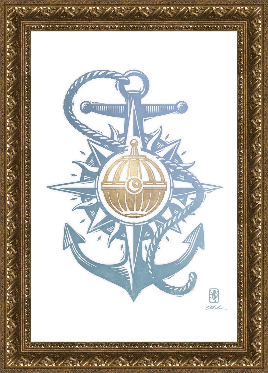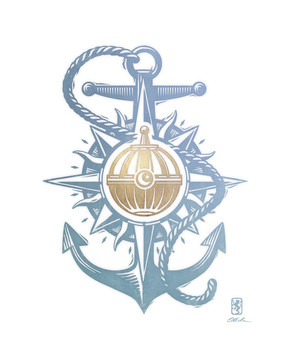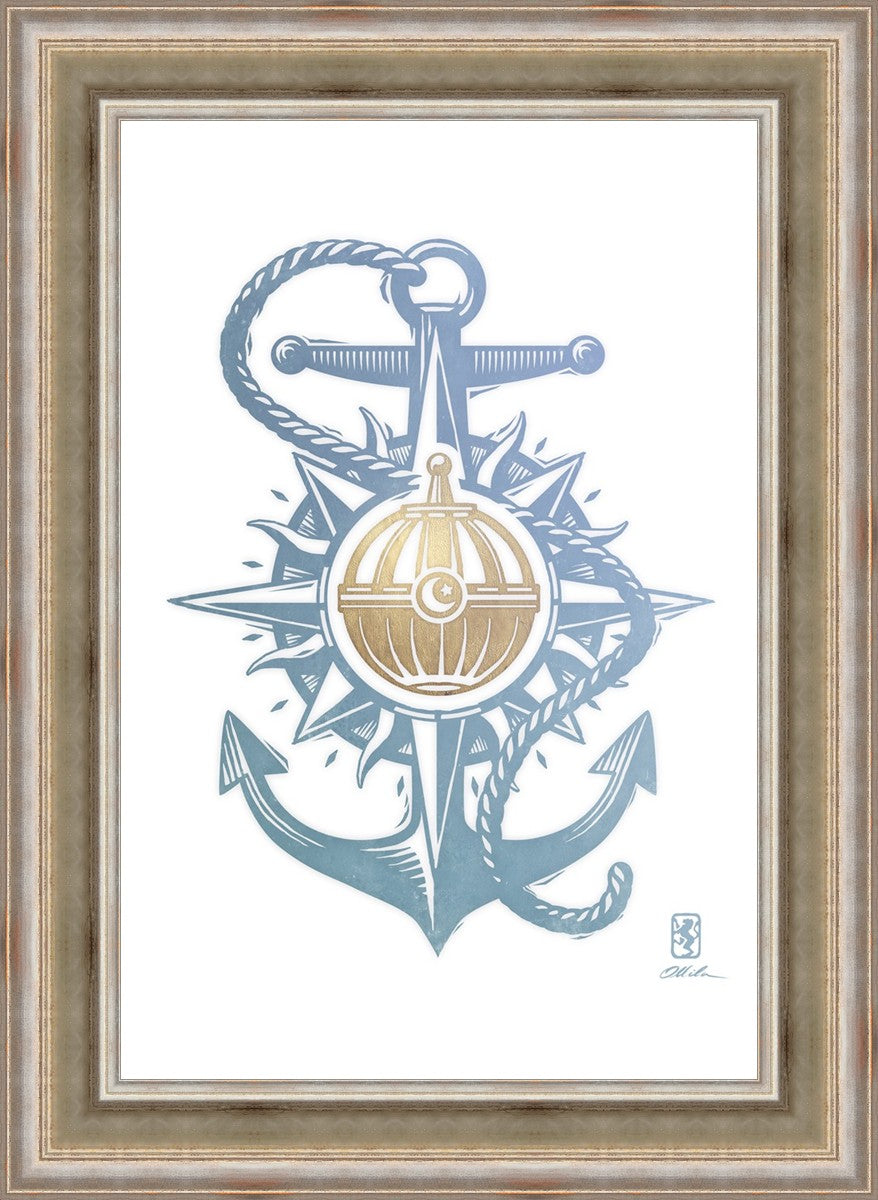 This piece is a hand carved woodcut relief print. The artist was inspired to create this piece by the story of Lehi's journey across the sea. The Liahona represents the word of Christ, which can act as a compass to guide us, and an anchor to which we may hold.