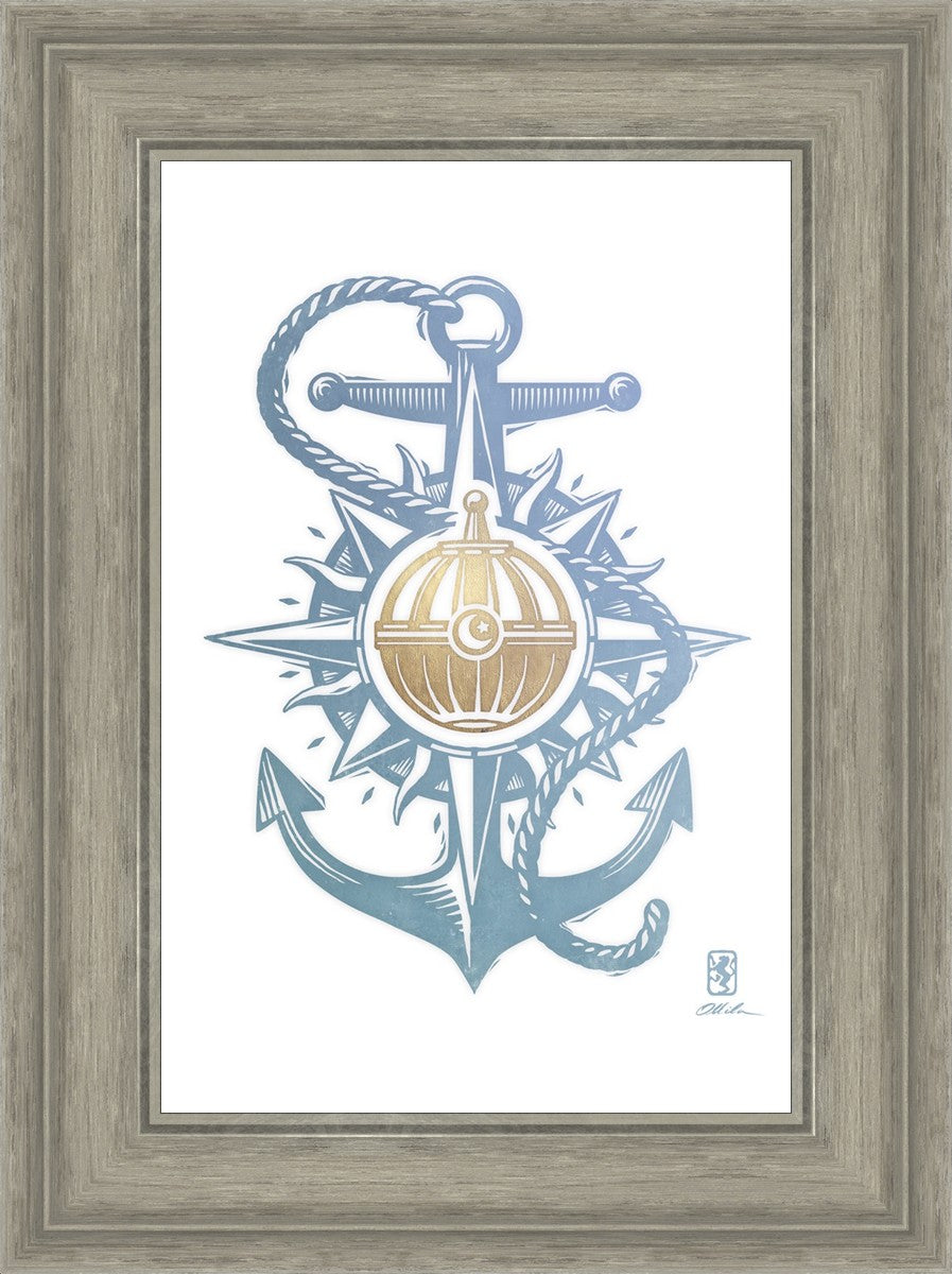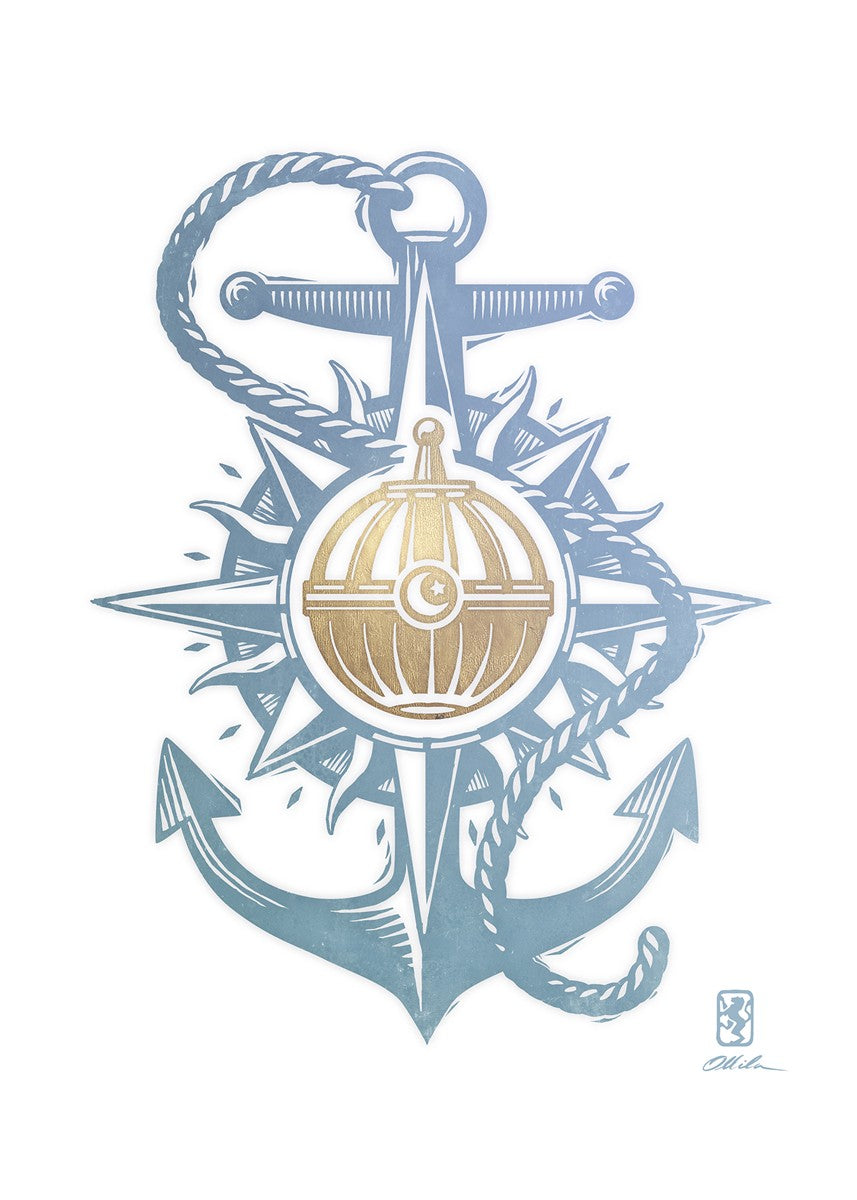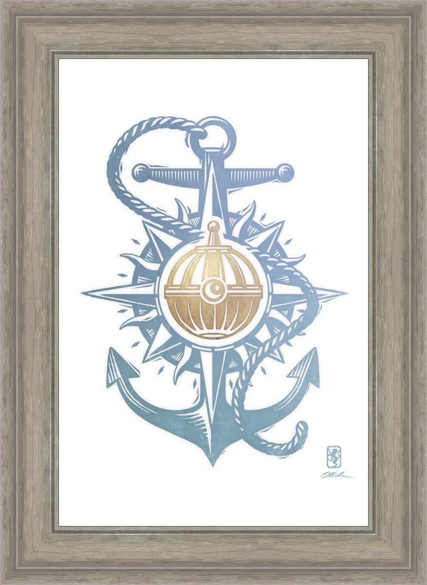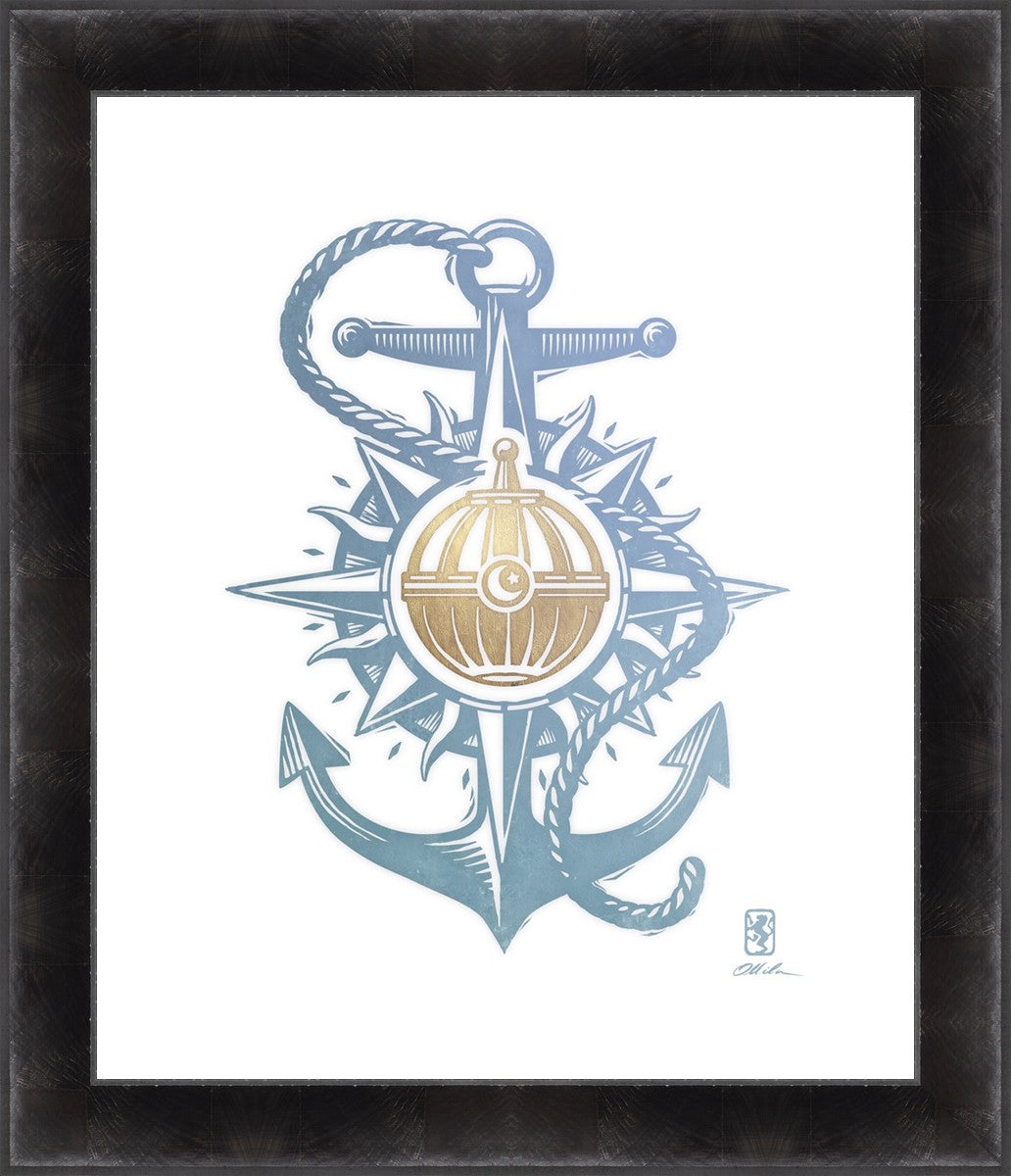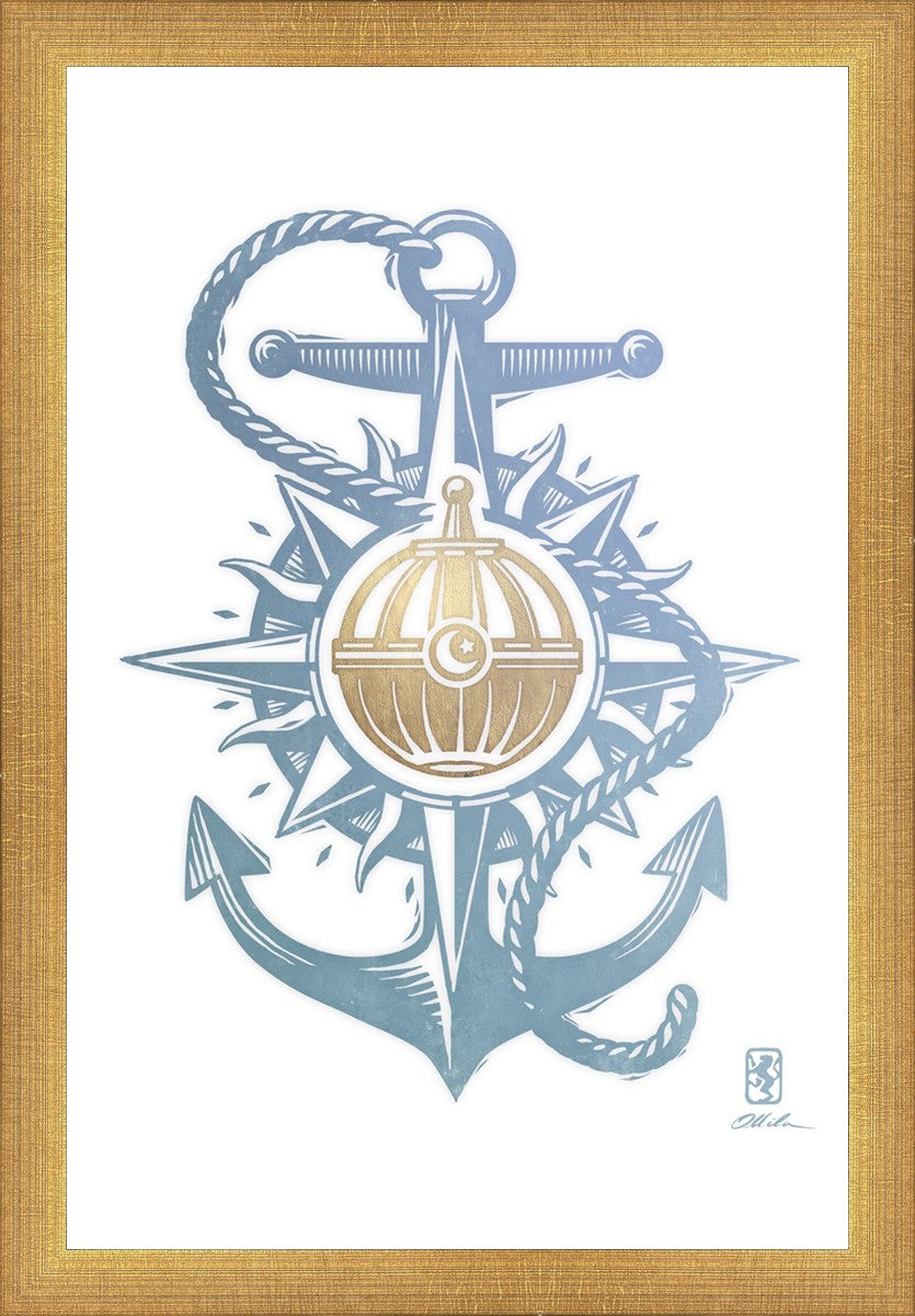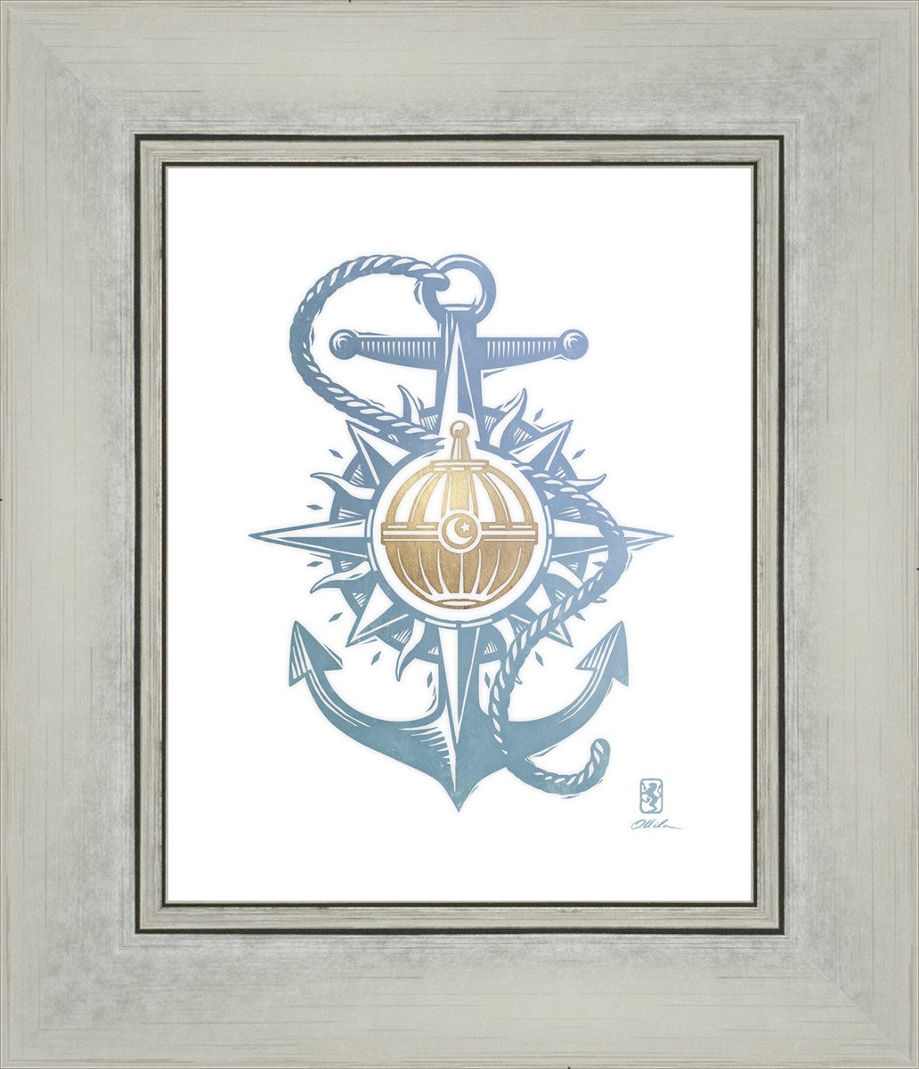 This piece is a hand carved woodcut relief print. The artist was inspired to create this piece by the story of Lehi's journey across the sea. The Liahona represents the word of Christ, which can act as a compass to guide us, and an anchor to which we may hold.