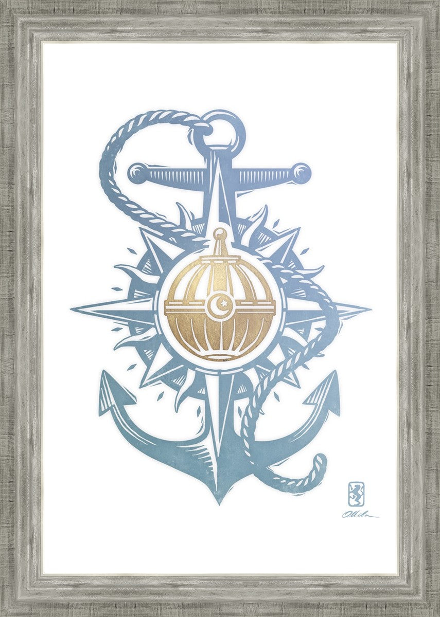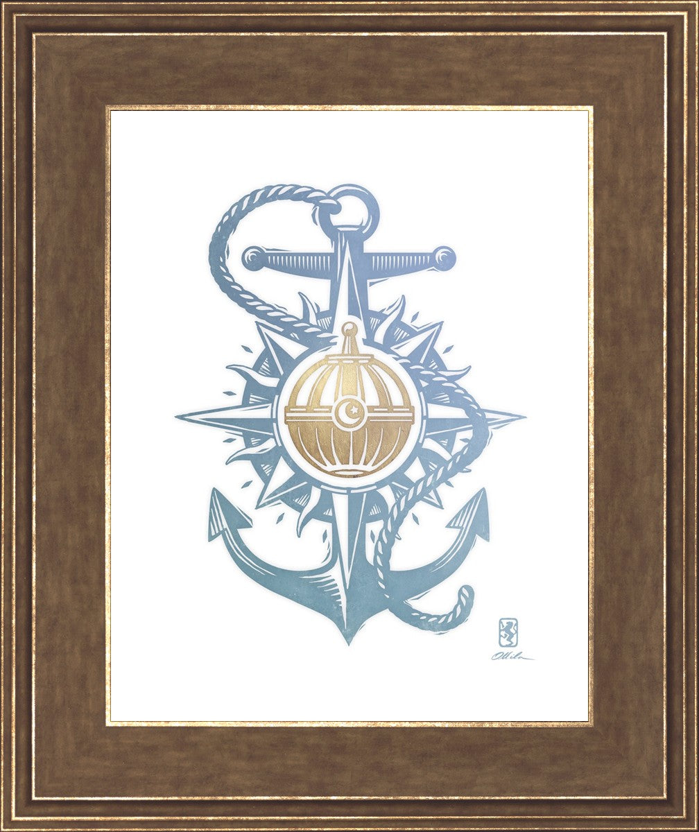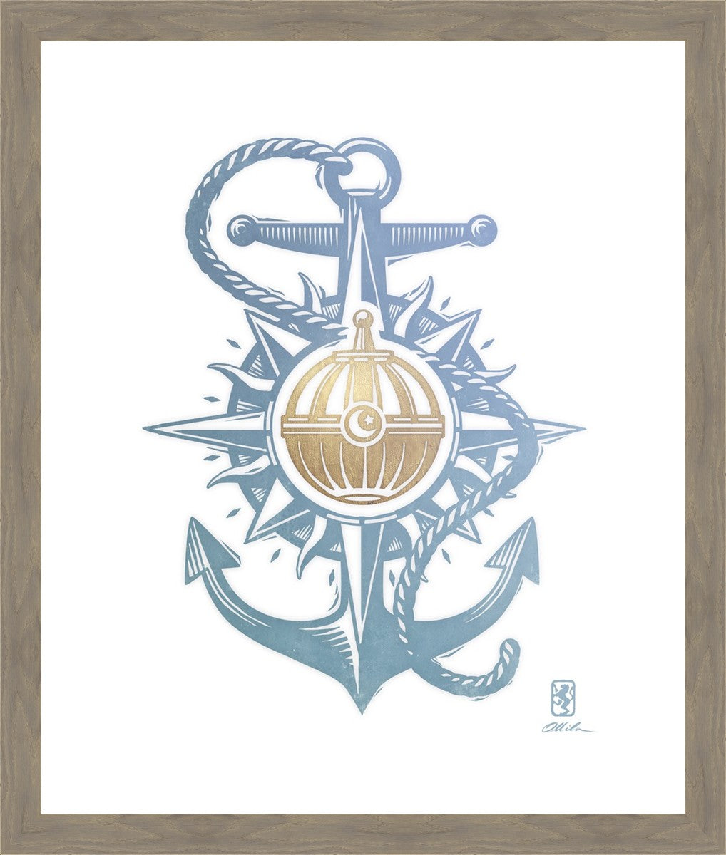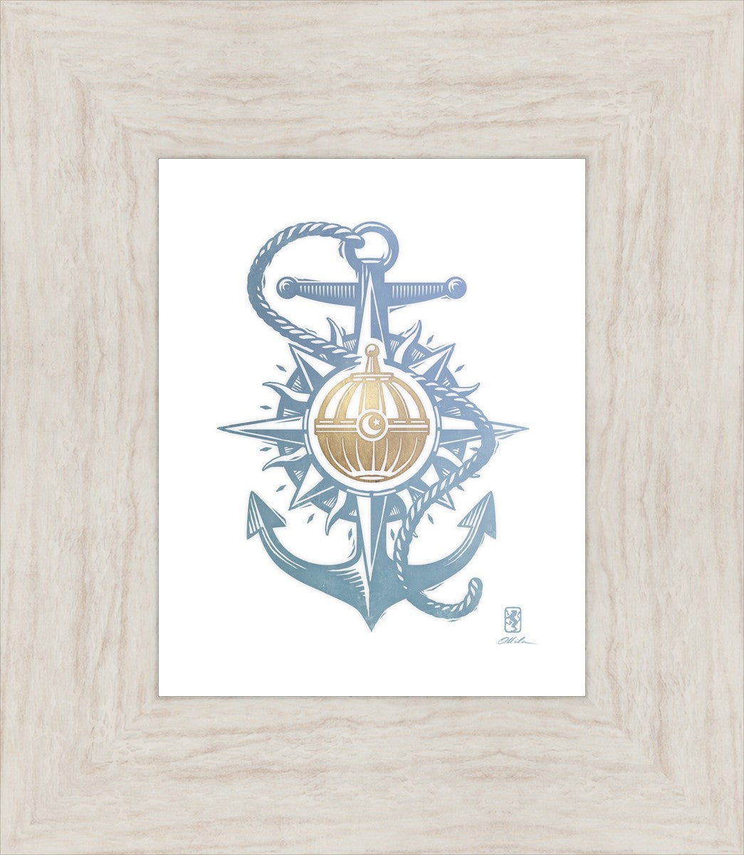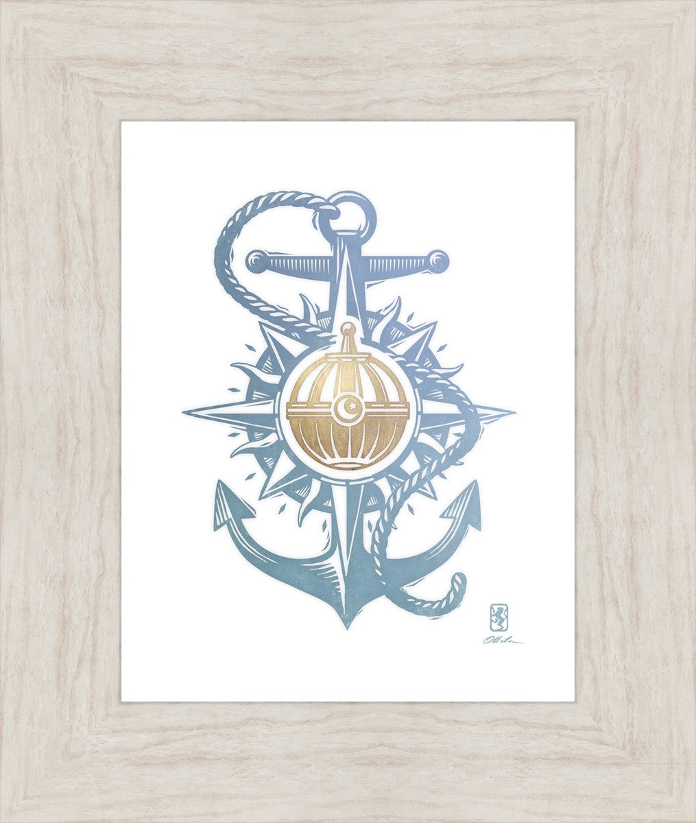 This piece is a hand carved woodcut relief print. The artist was inspired to create this piece by the story of Lehi's journey across the sea. The Liahona represents the word of Christ, which can act as a compass to guide us, and an anchor to which we may hold.