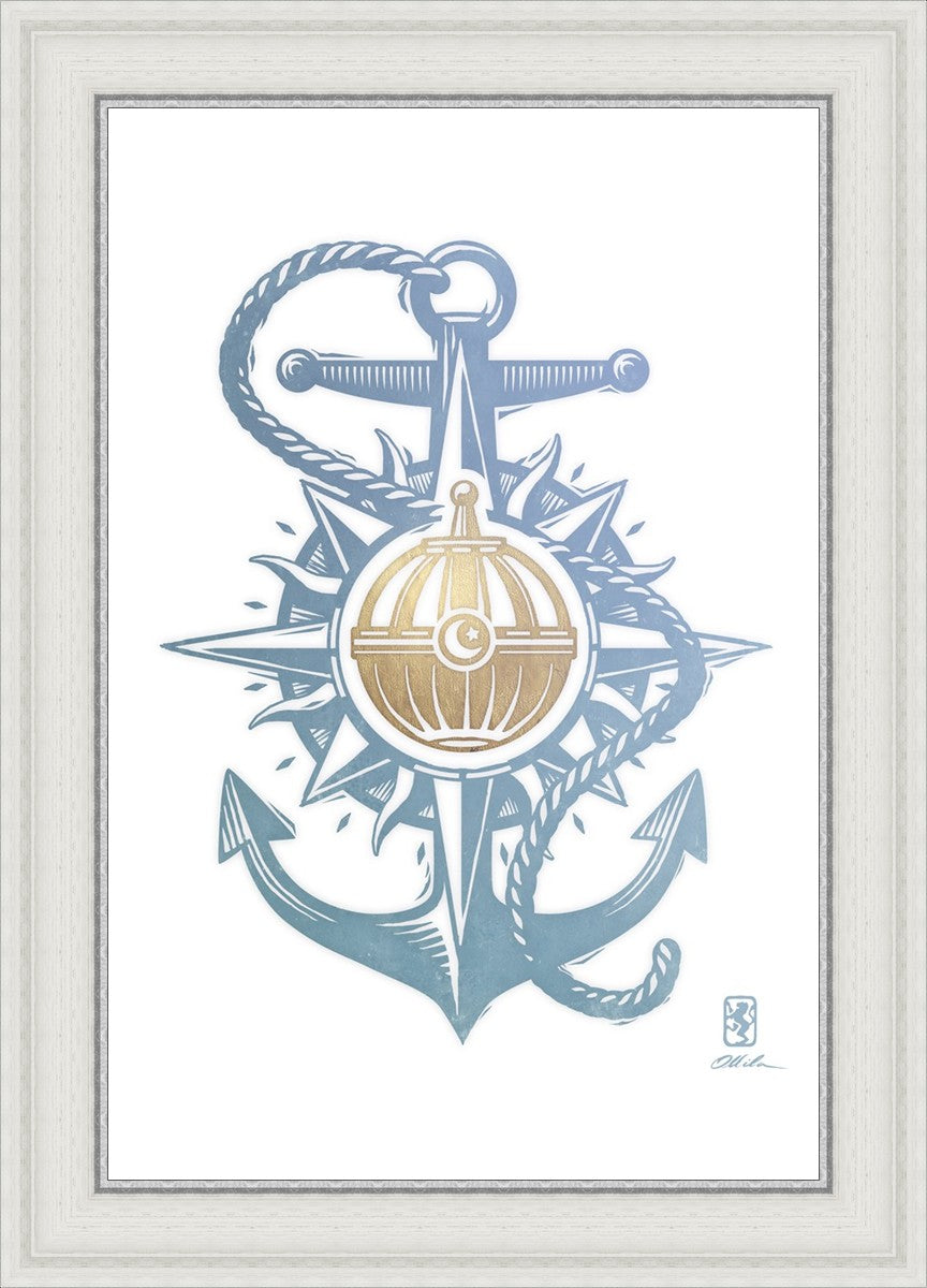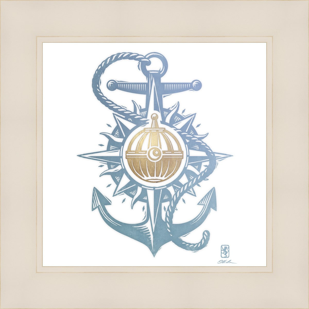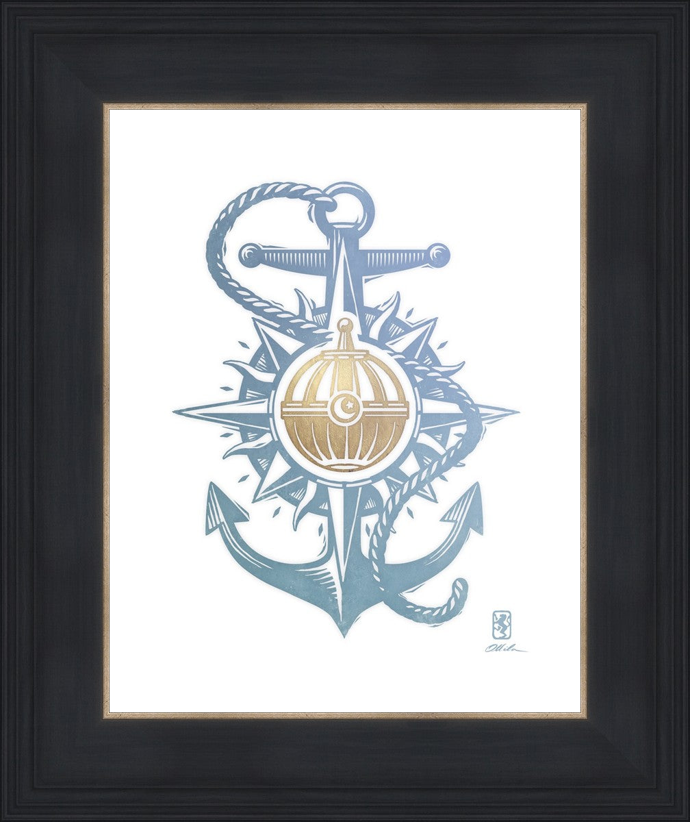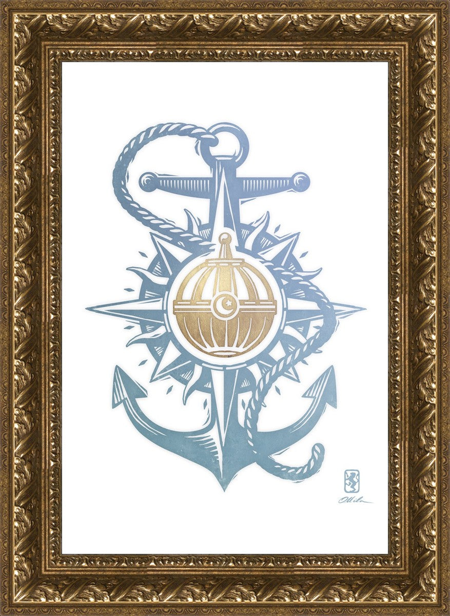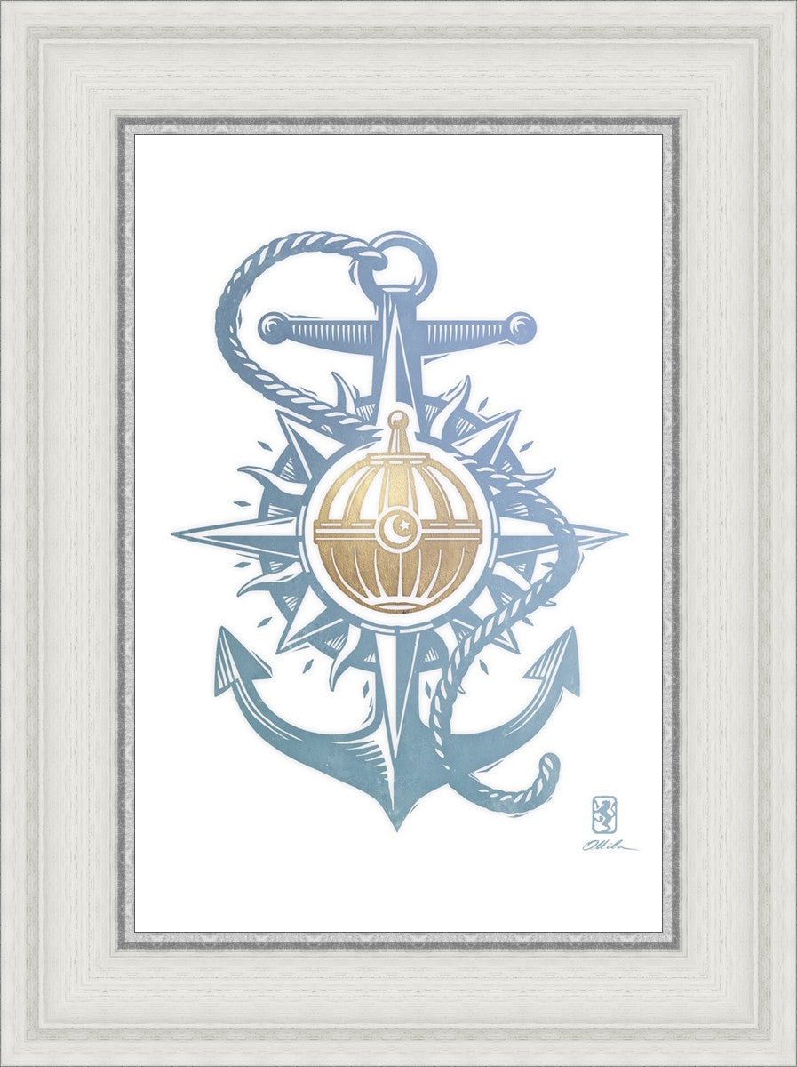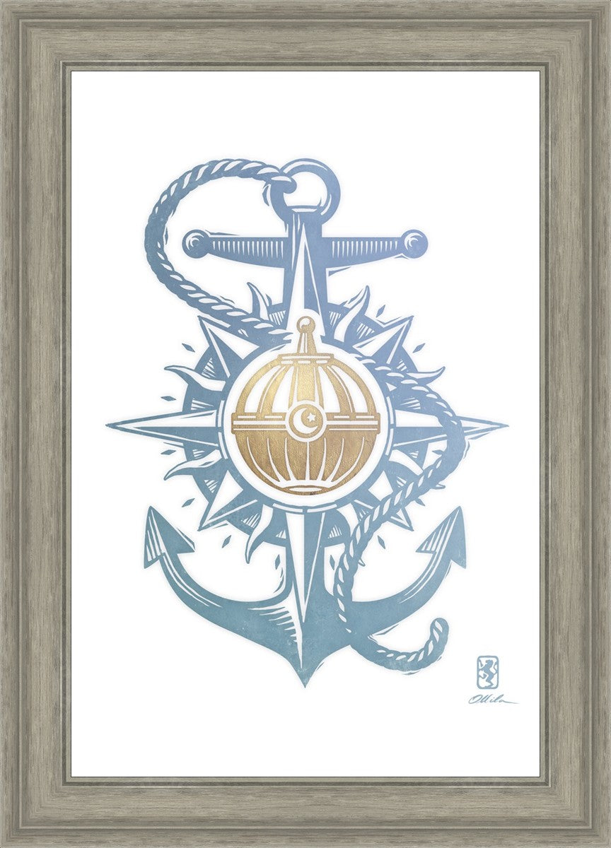 This piece is a hand carved woodcut relief print. The artist was inspired to create this piece by the story of Lehi's journey across the sea. The Liahona represents the word of Christ, which can act as a compass to guide us, and an anchor to which we may hold.