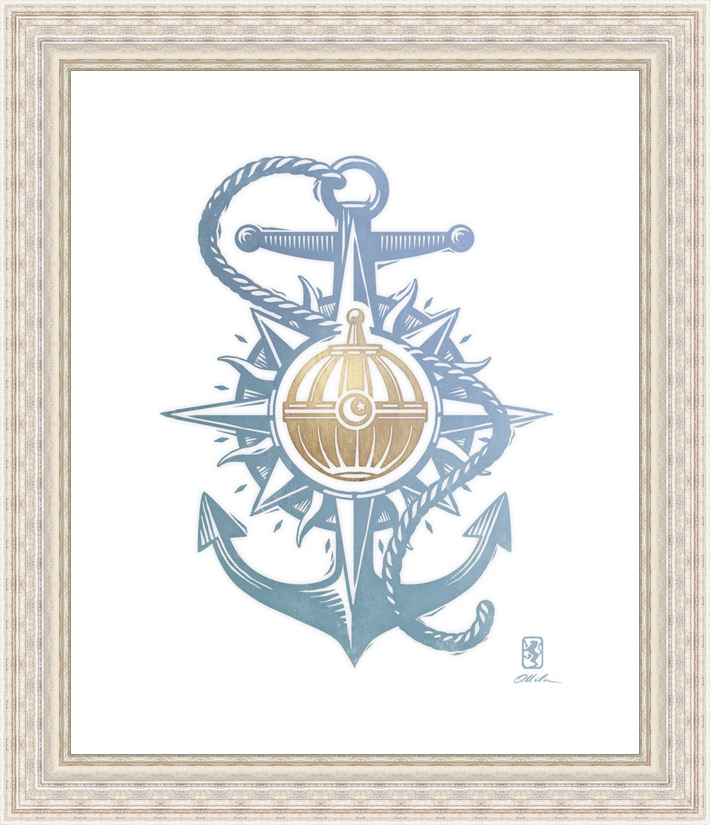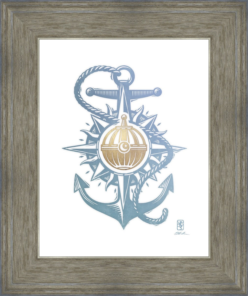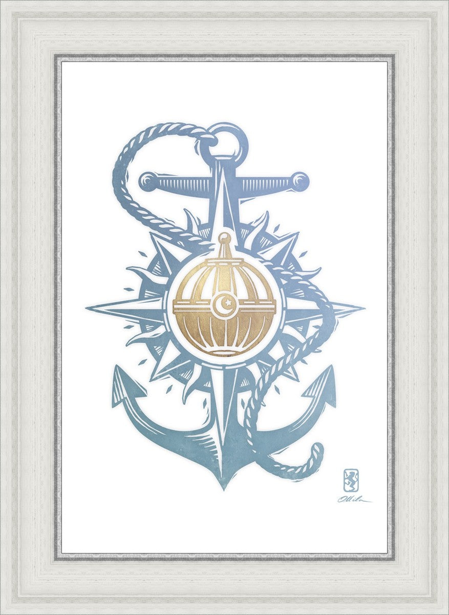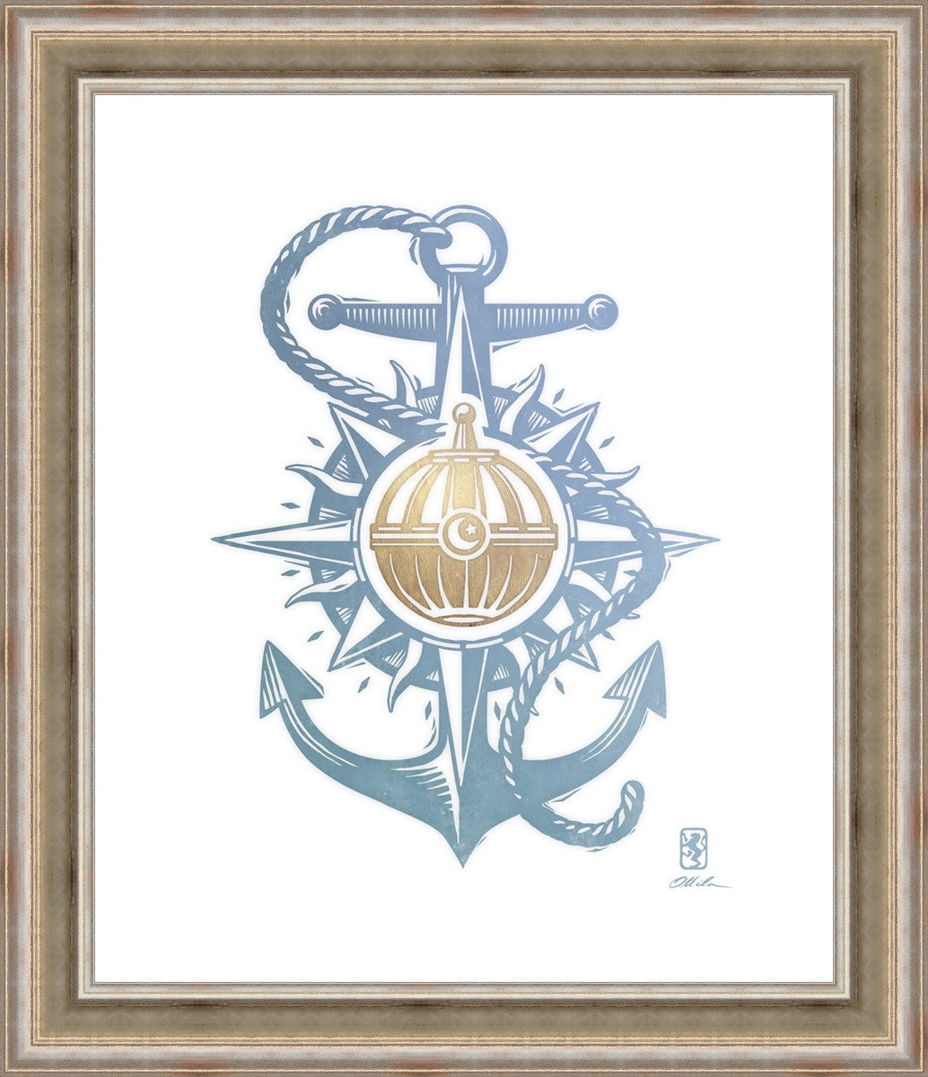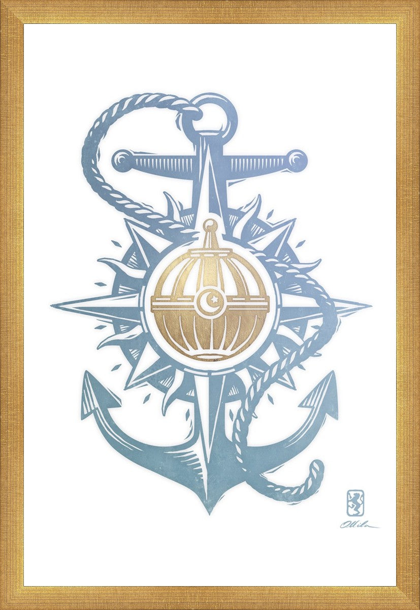 This piece is a hand carved woodcut relief print. The artist was inspired to create this piece by the story of Lehi's journey across the sea. The Liahona represents the word of Christ, which can act as a compass to guide us, and an anchor to which we may hold.
