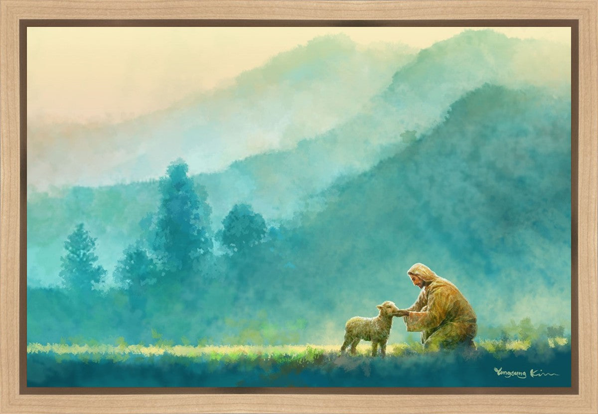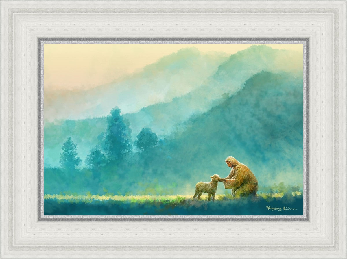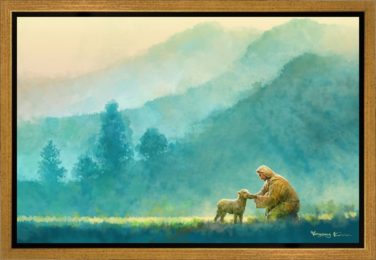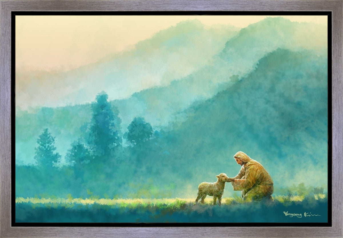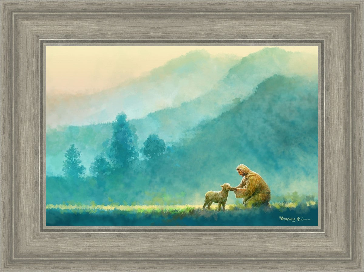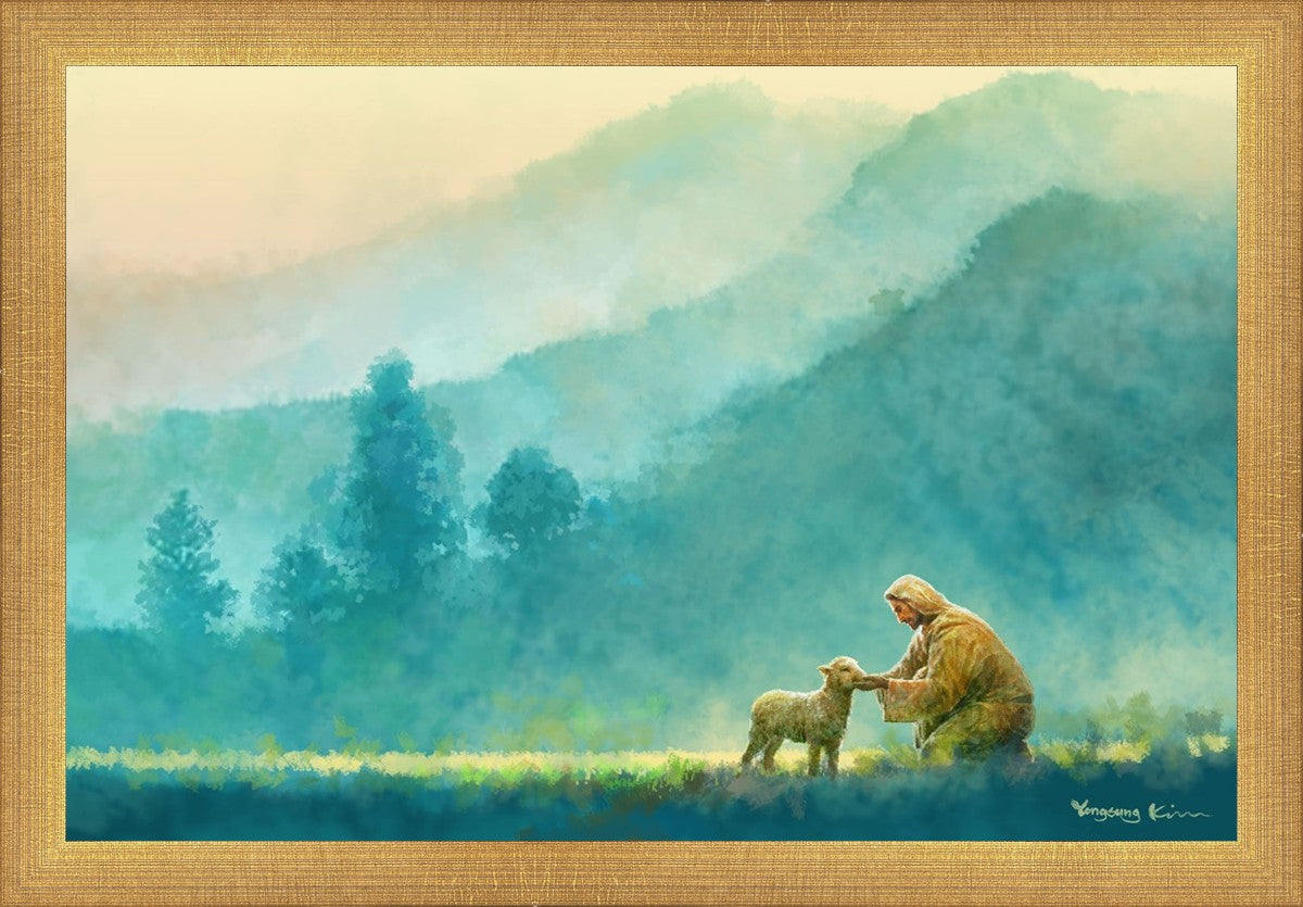 "Little One" by Yongsung Kim is a painting showcasing Jesus Christ tenderly caring for a lost lamb in a vast field, symbolizing His role as the Good Shepherd. This captivating artwork by Yongsung Kim captures the essence of divine care and compassion, for each and every member of His flock.