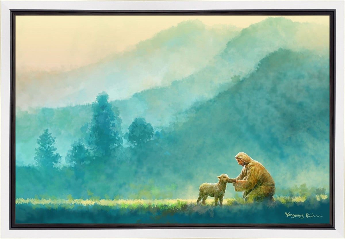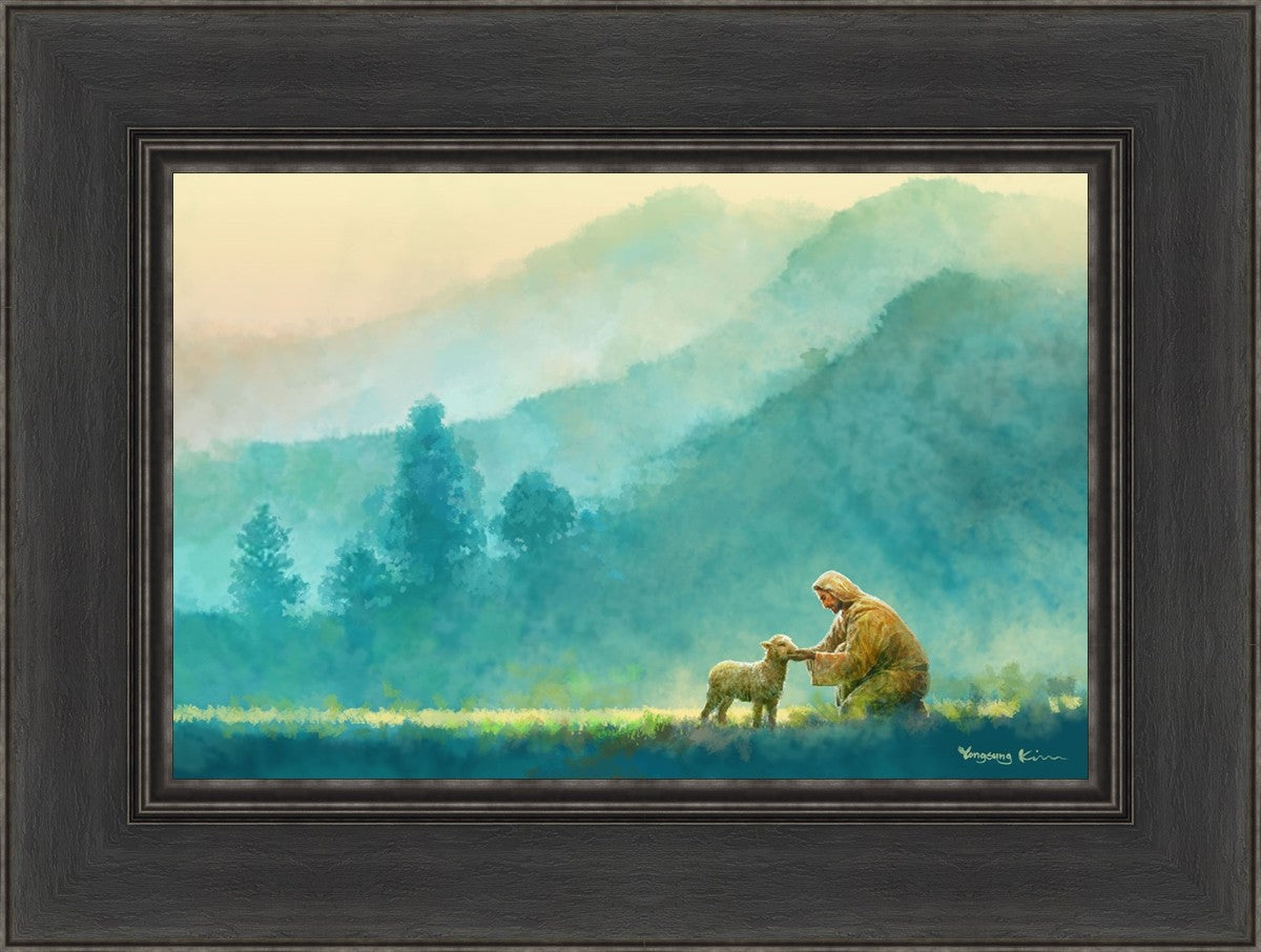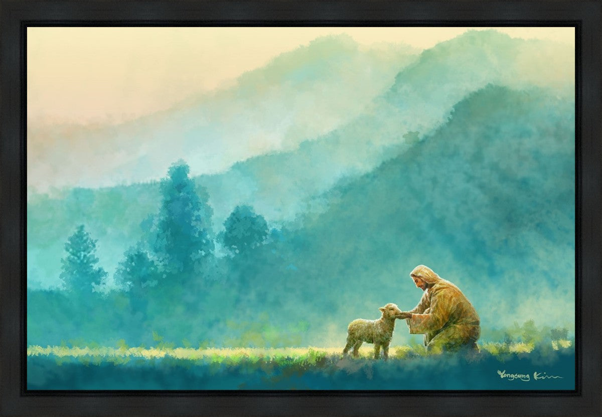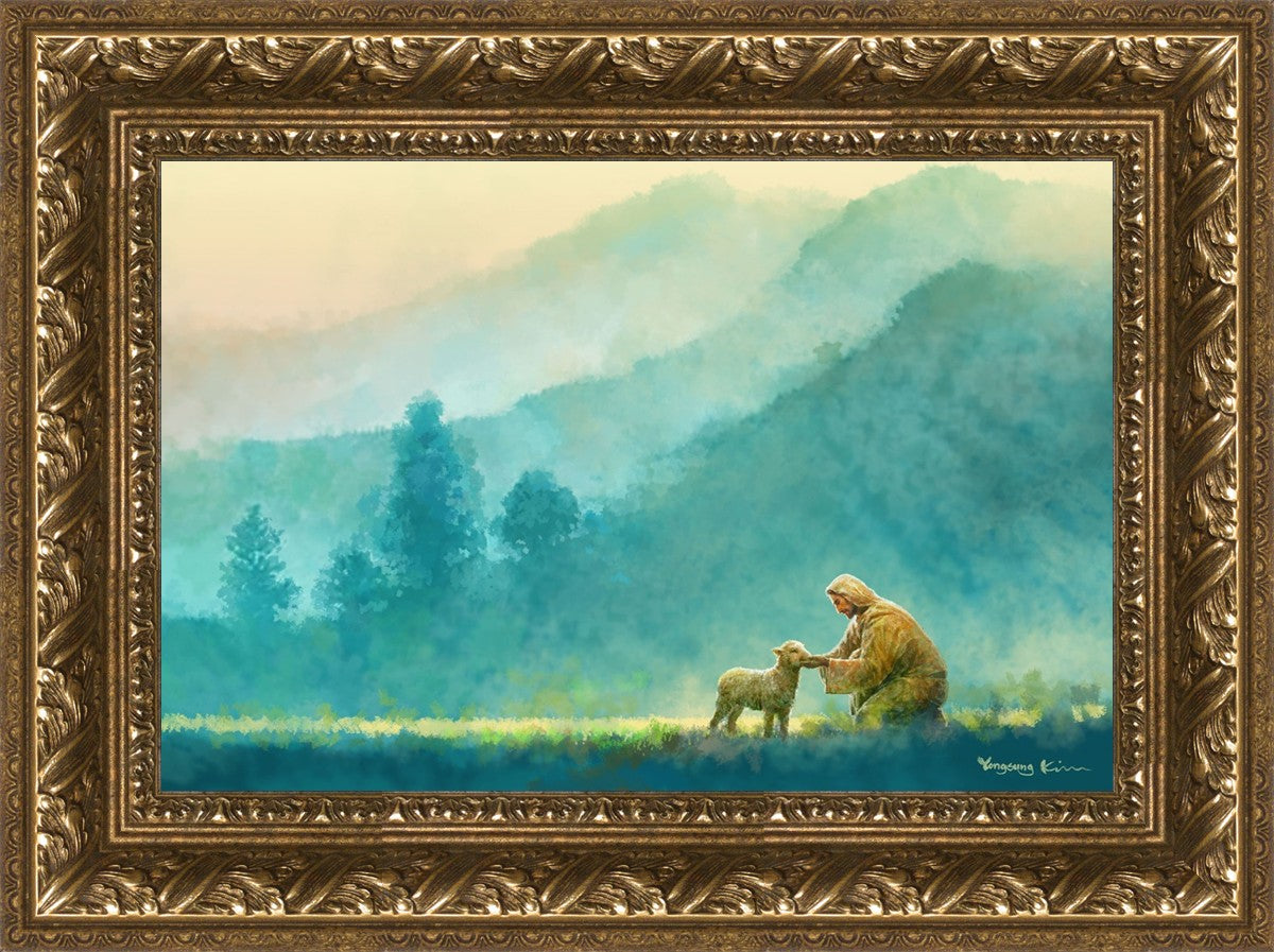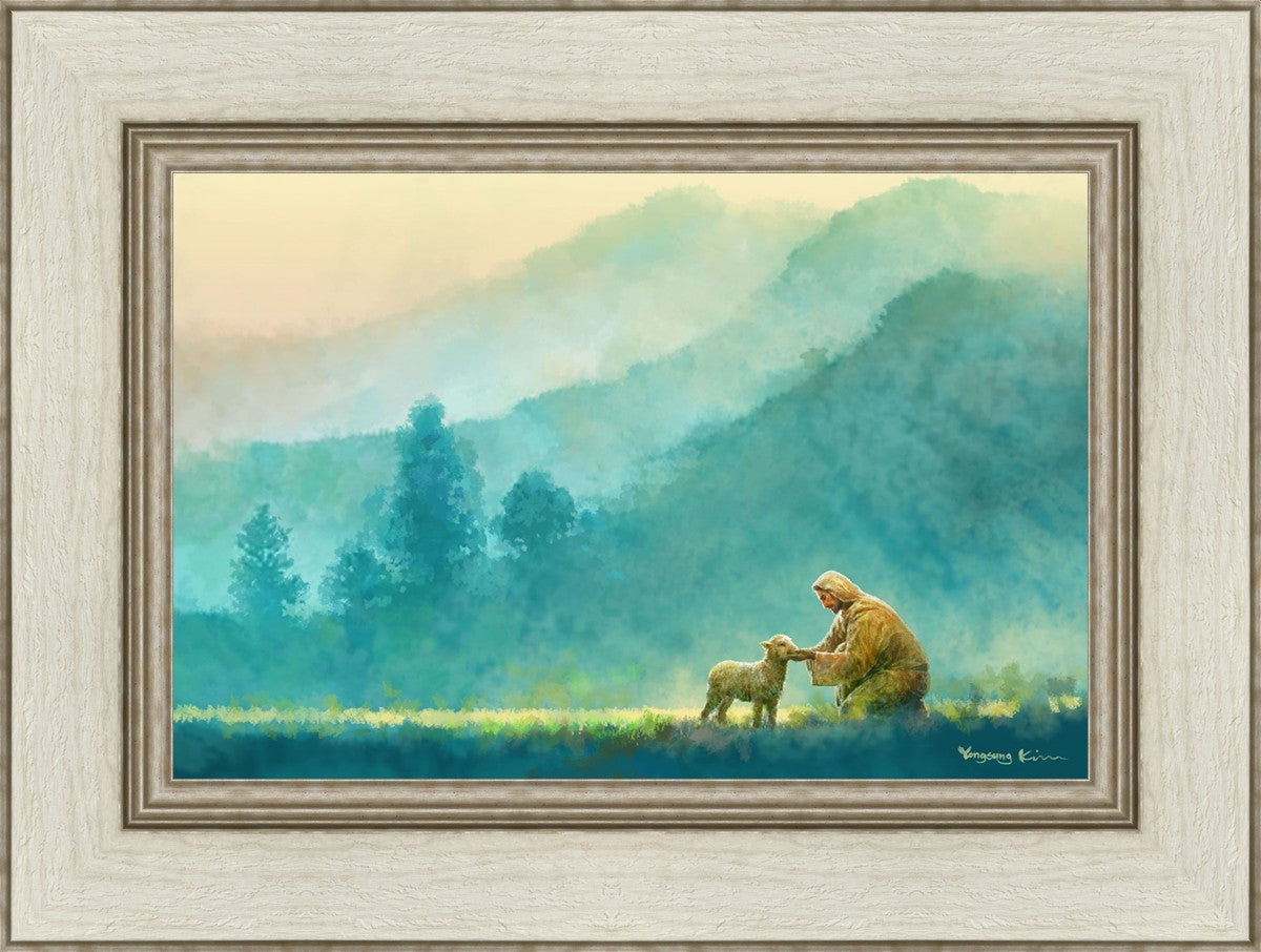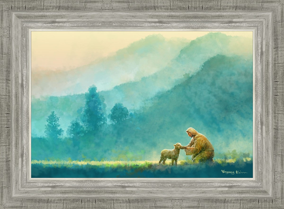 "Little One" by Yongsung Kim is a painting showcasing Jesus Christ tenderly caring for a lost lamb in a vast field, symbolizing His role as the Good Shepherd. This captivating artwork by Yongsung Kim captures the essence of divine care and compassion, for each and every member of His flock.