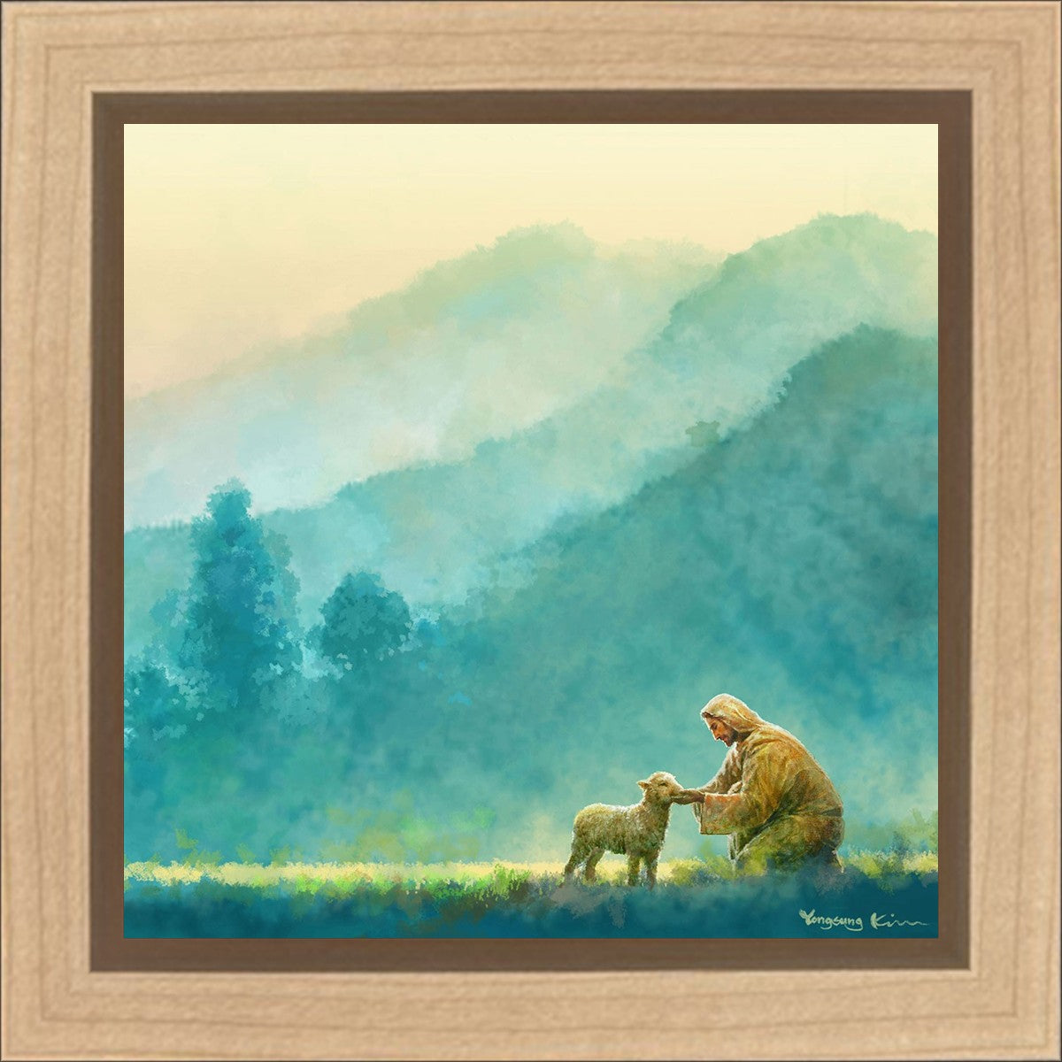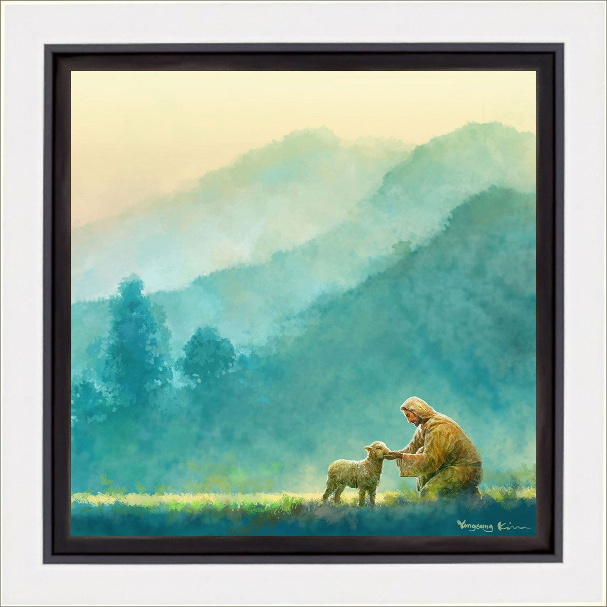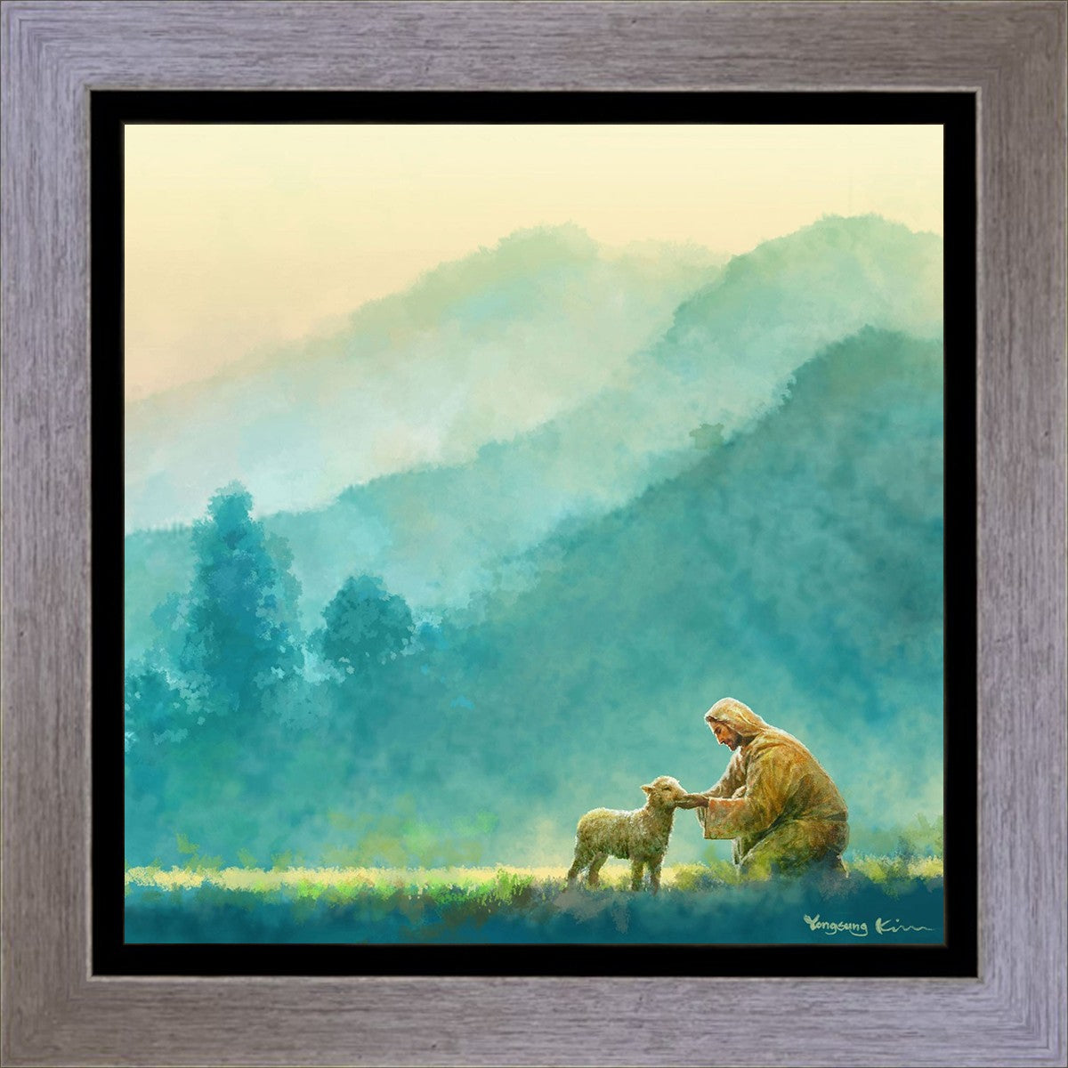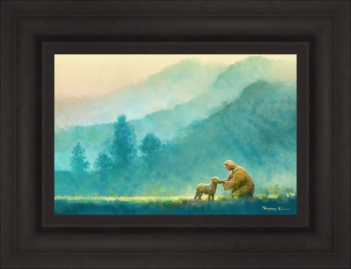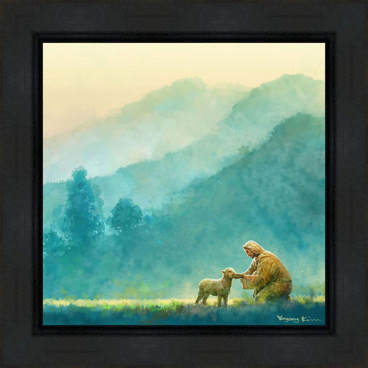 "Little One" by Yongsung Kim is a painting showcasing Jesus Christ tenderly caring for a lost lamb in a vast field, symbolizing His role as the Good Shepherd. This captivating artwork by Yongsung Kim captures the essence of divine care and compassion, for each and every member of His flock.