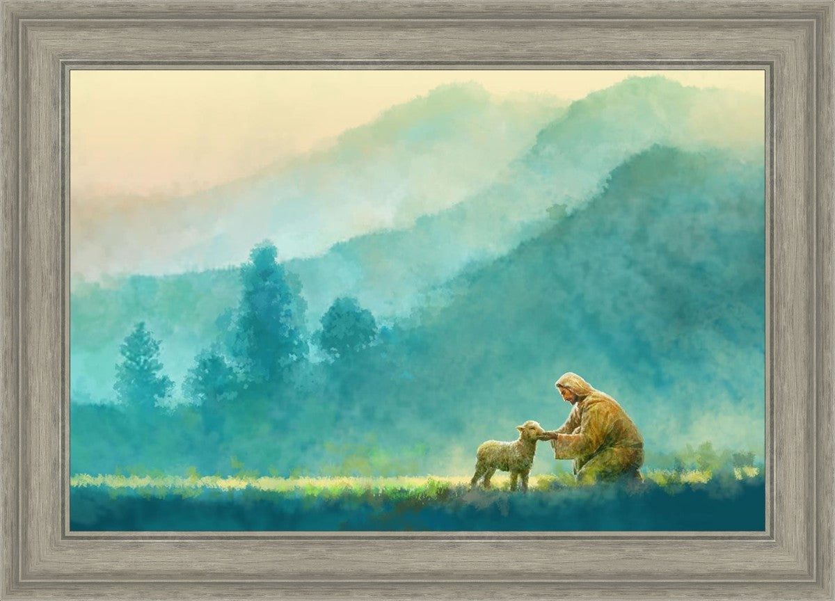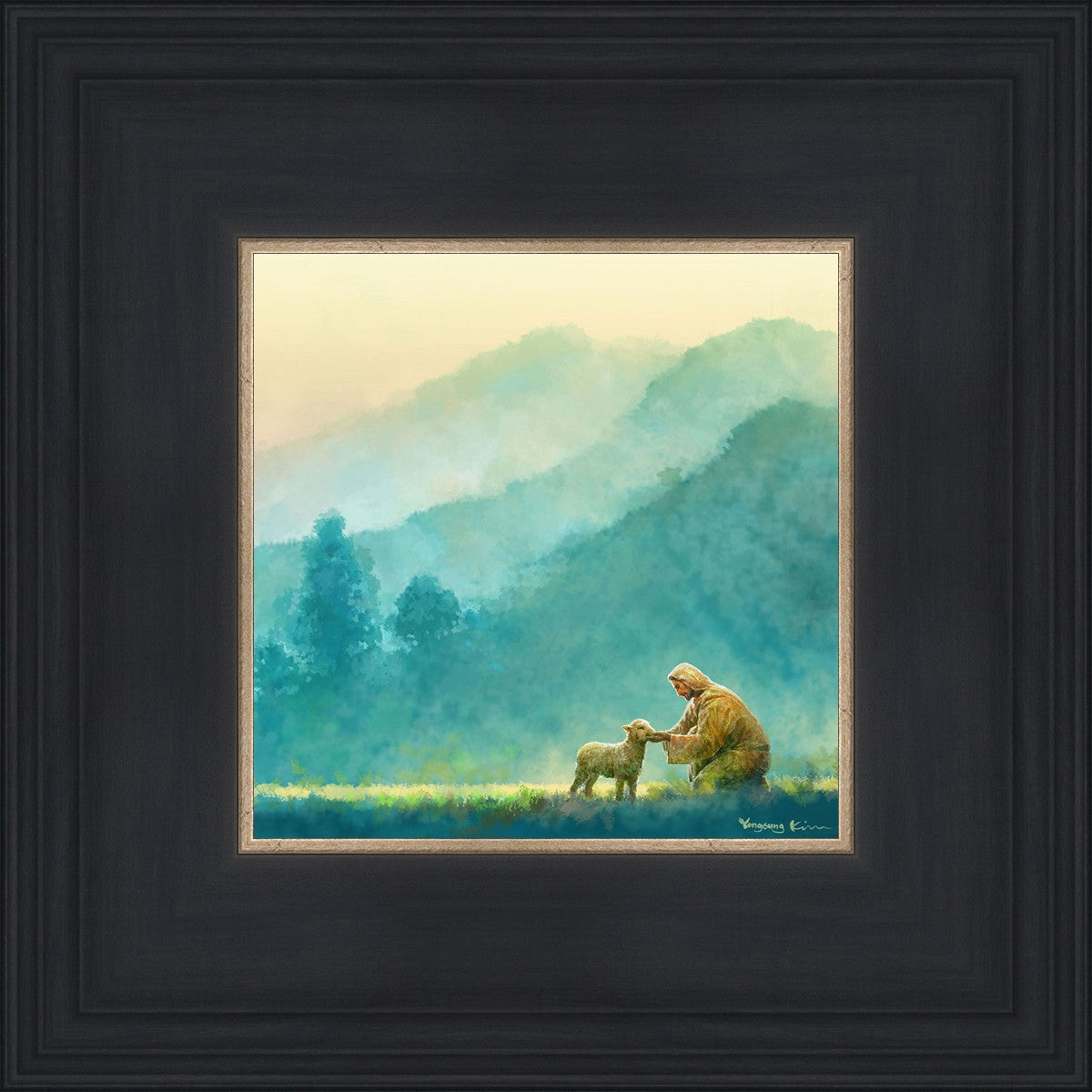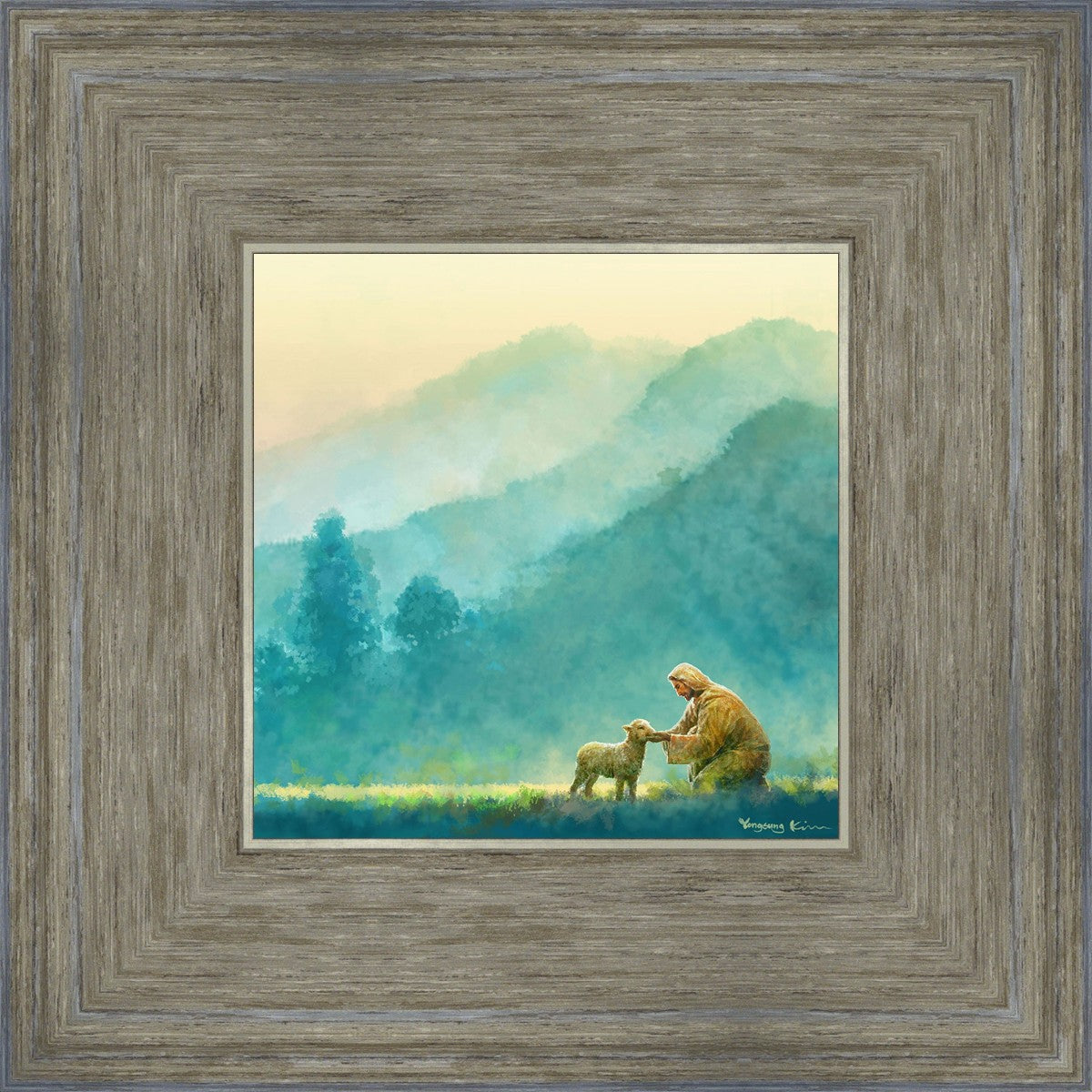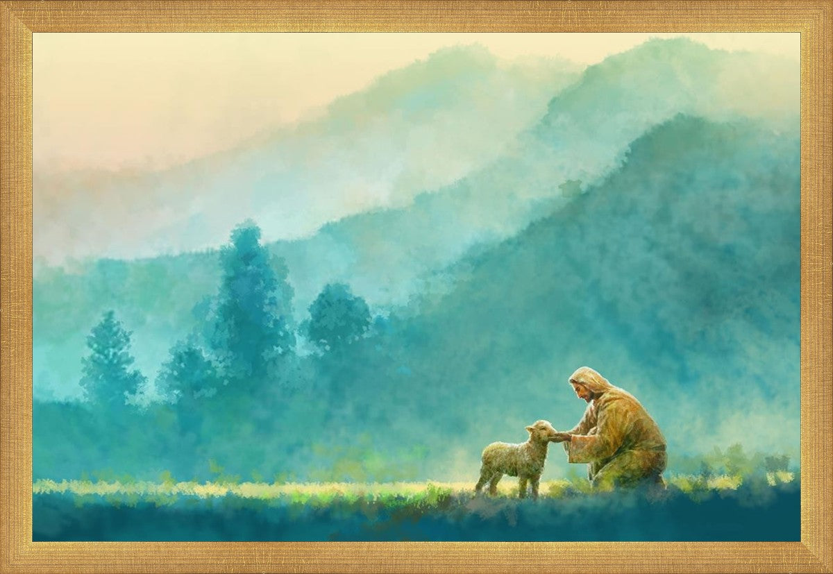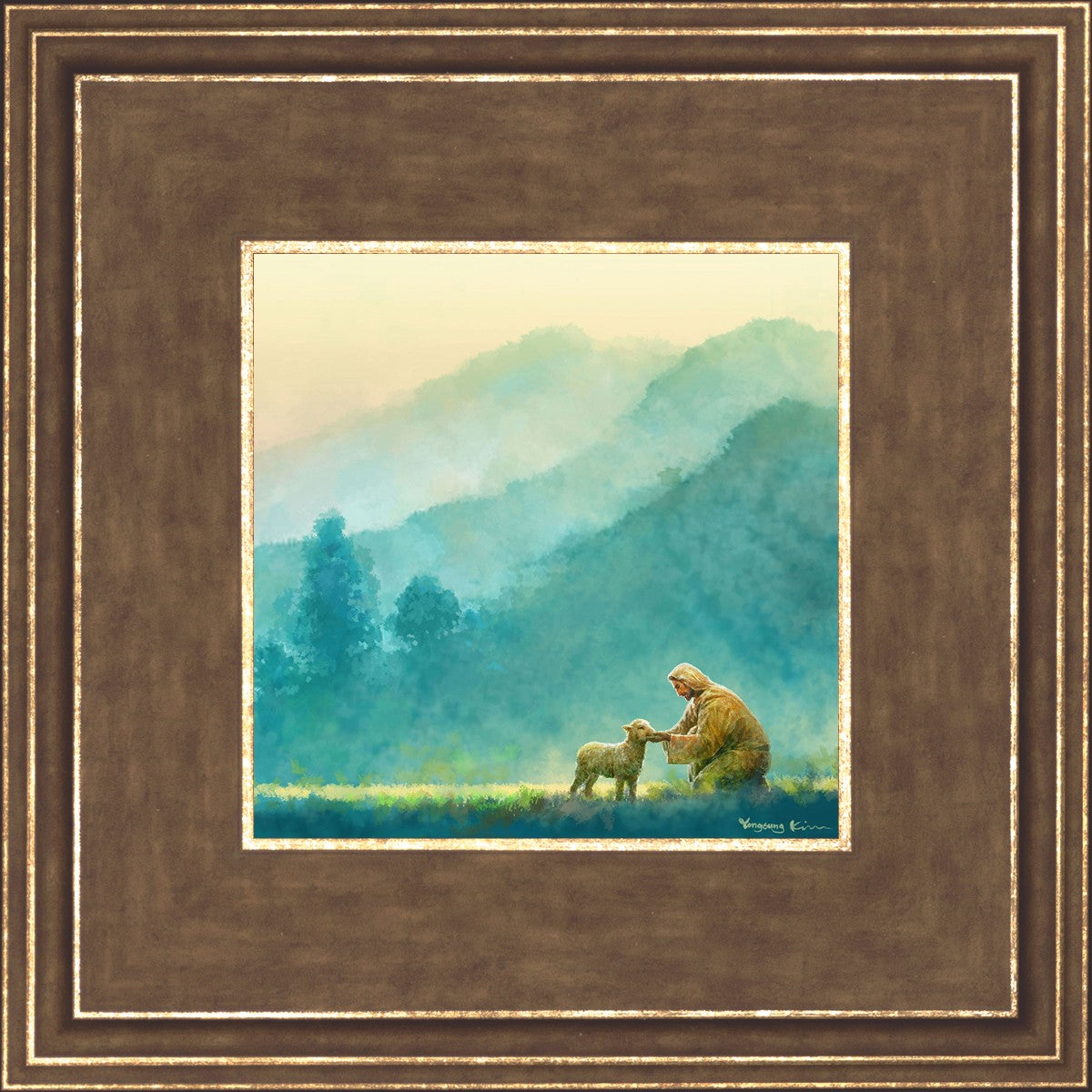 "Little One" by Yongsung Kim is a painting showcasing Jesus Christ tenderly caring for a lost lamb in a vast field, symbolizing His role as the Good Shepherd. This captivating artwork by Yongsung Kim captures the essence of divine care and compassion, for each and every member of His flock.