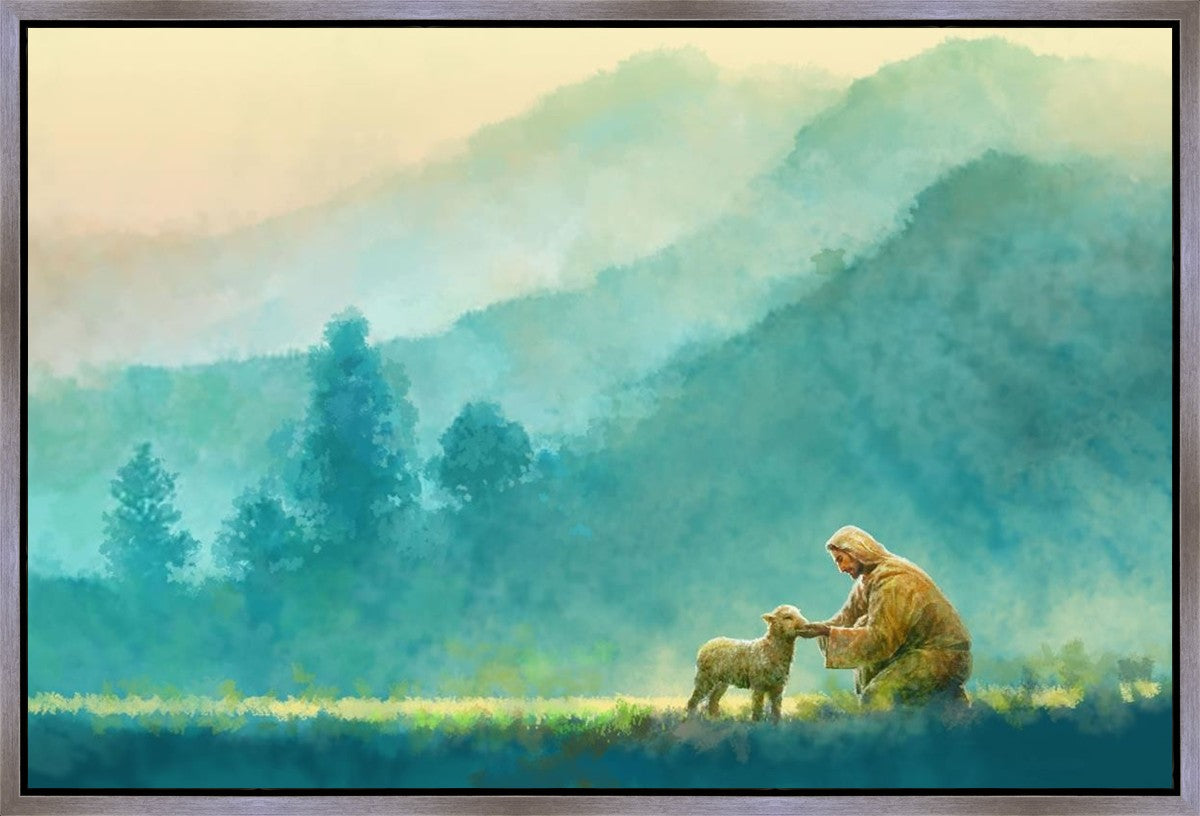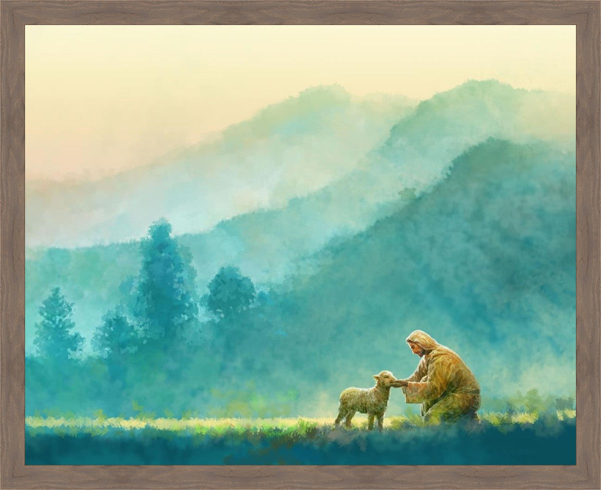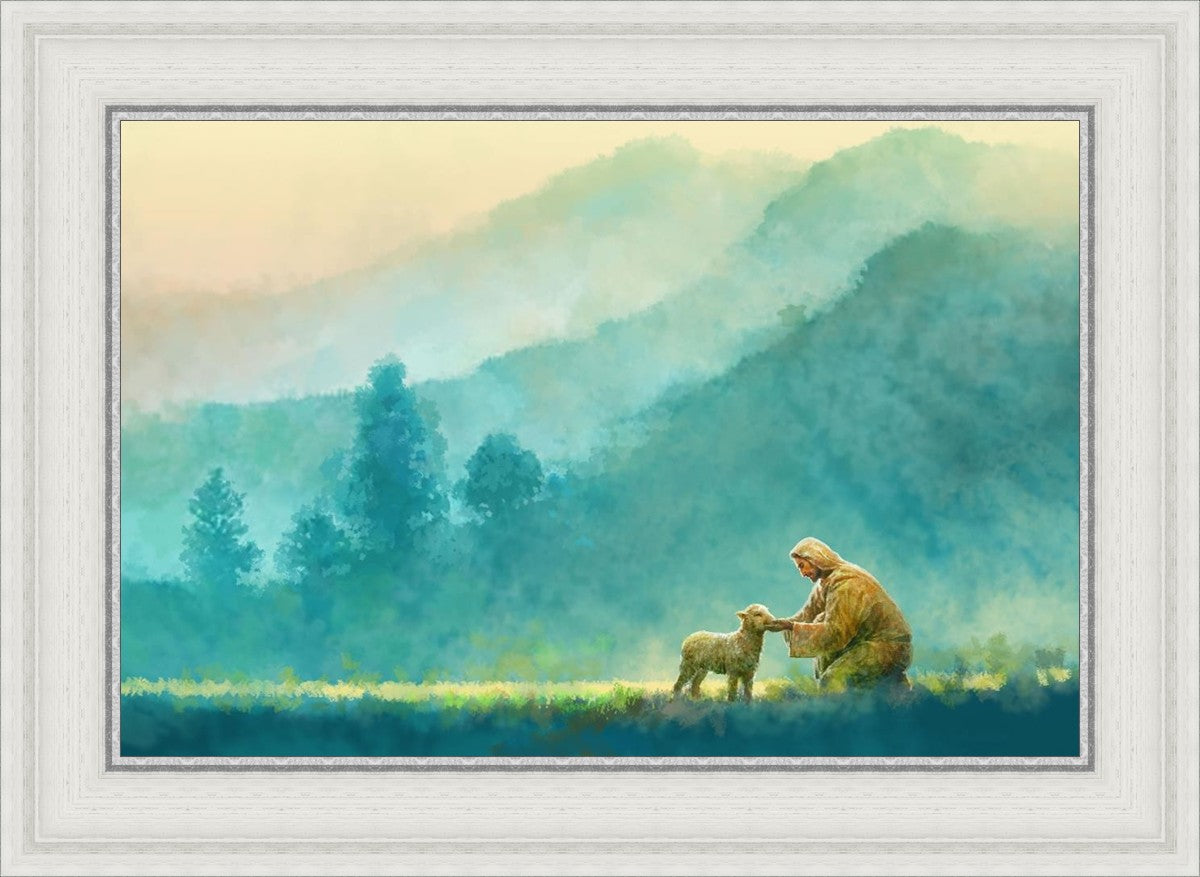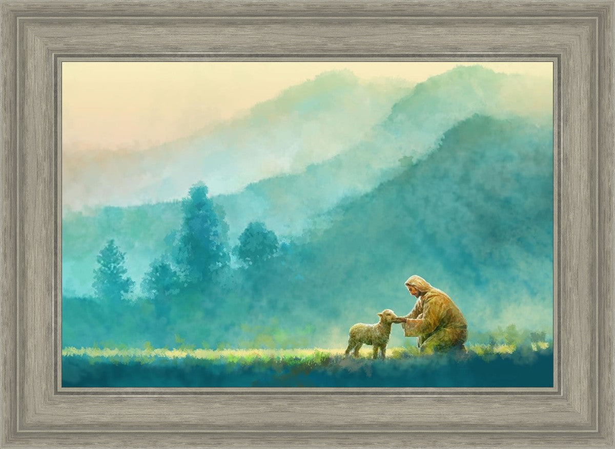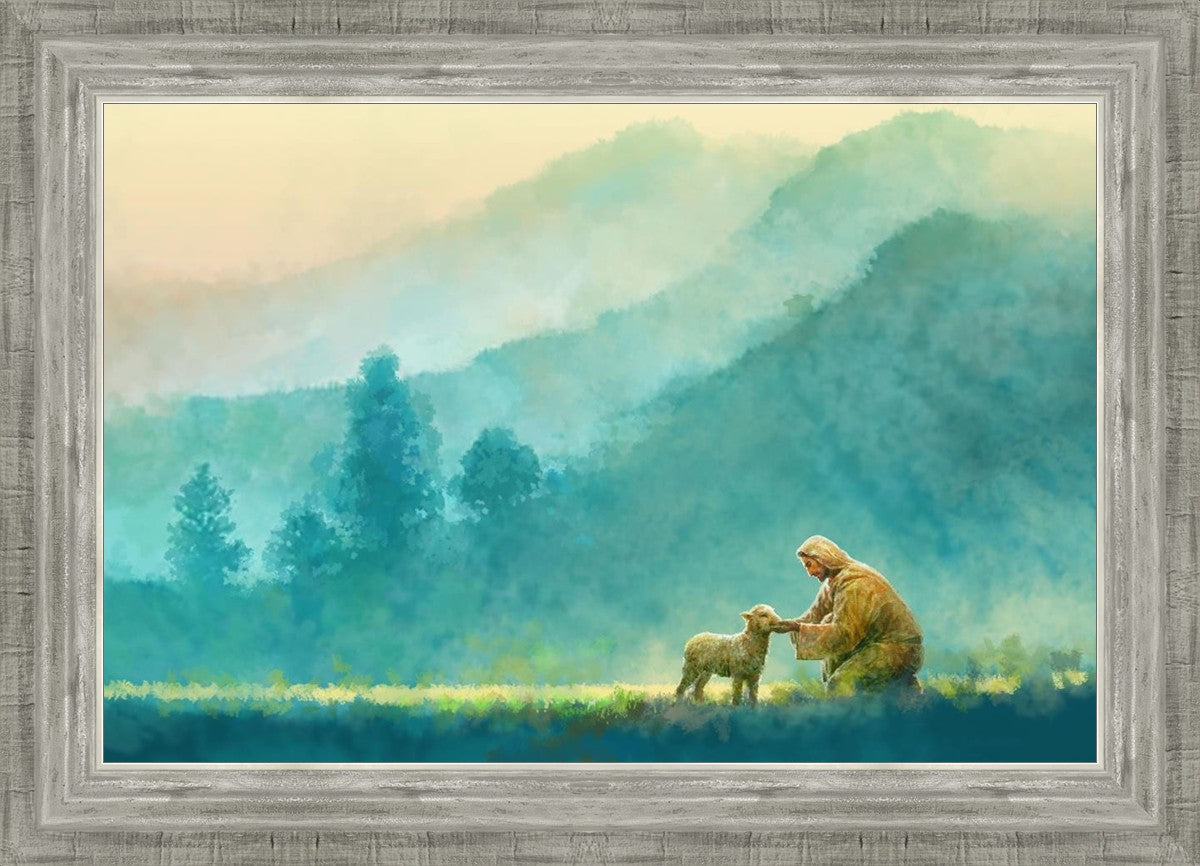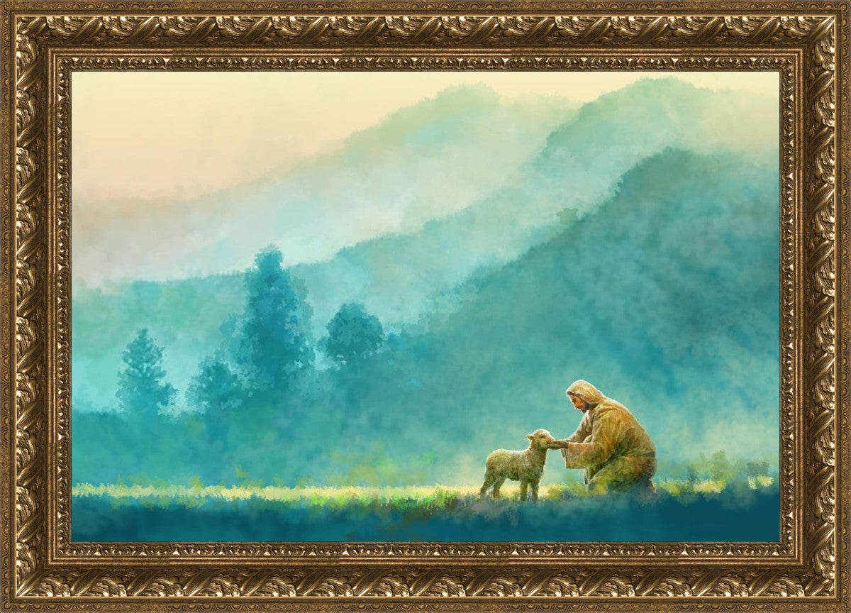 "Little One" by Yongsung Kim is a painting showcasing Jesus Christ tenderly caring for a lost lamb in a vast field, symbolizing His role as the Good Shepherd. This captivating artwork by Yongsung Kim captures the essence of divine care and compassion, for each and every member of His flock.