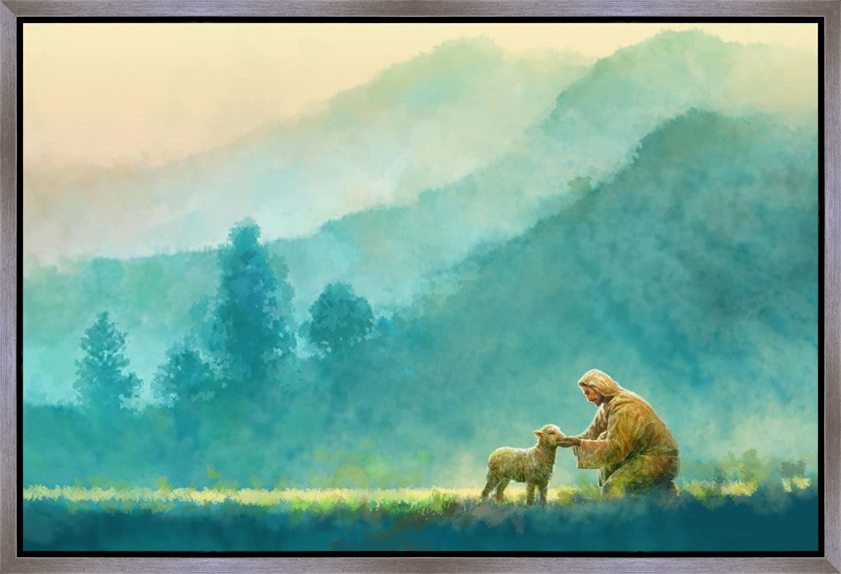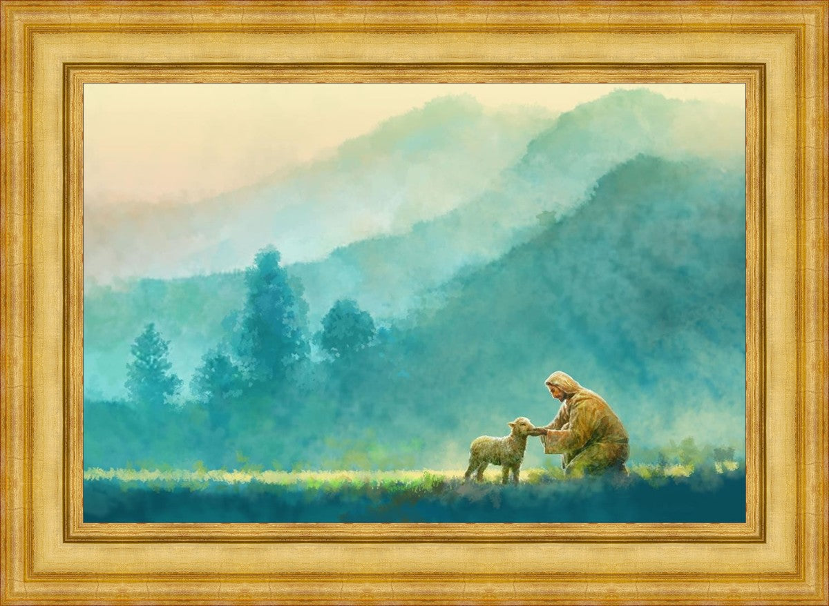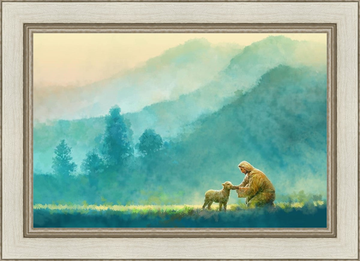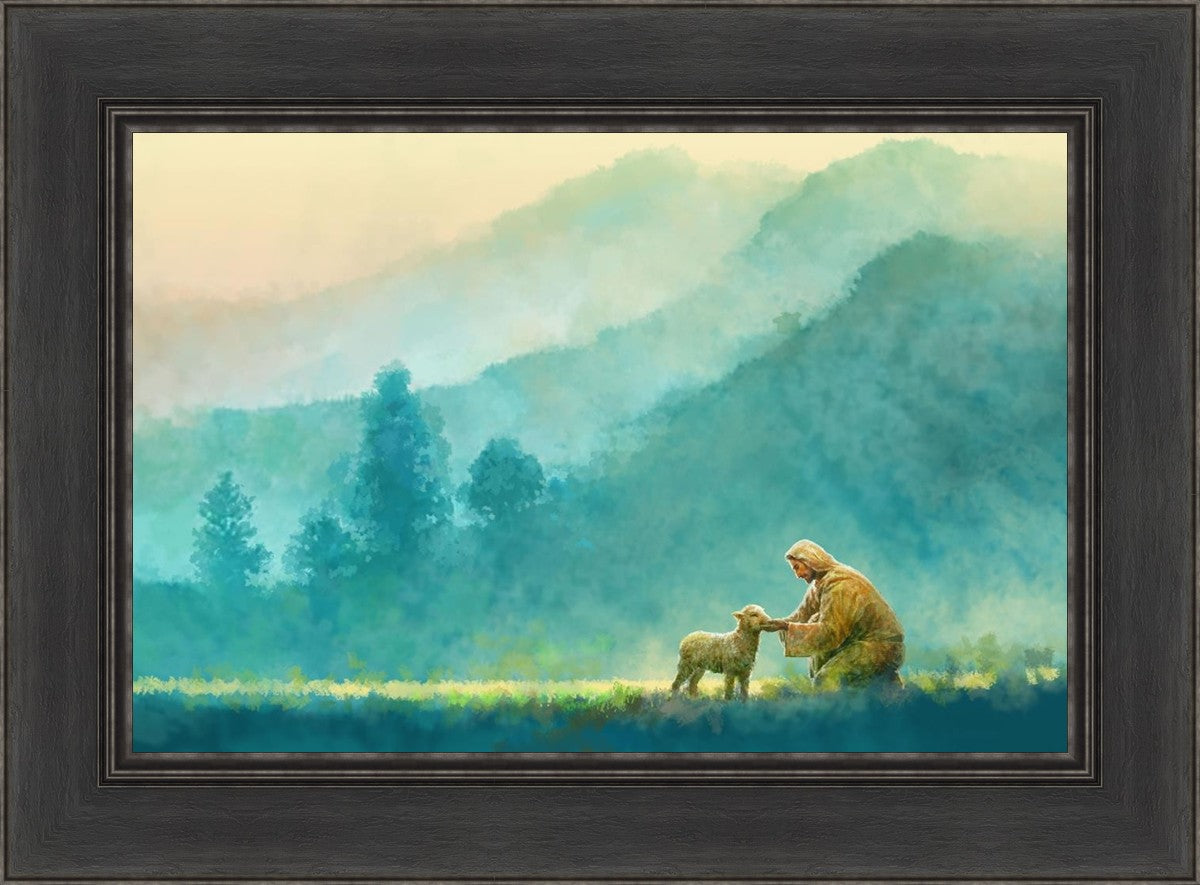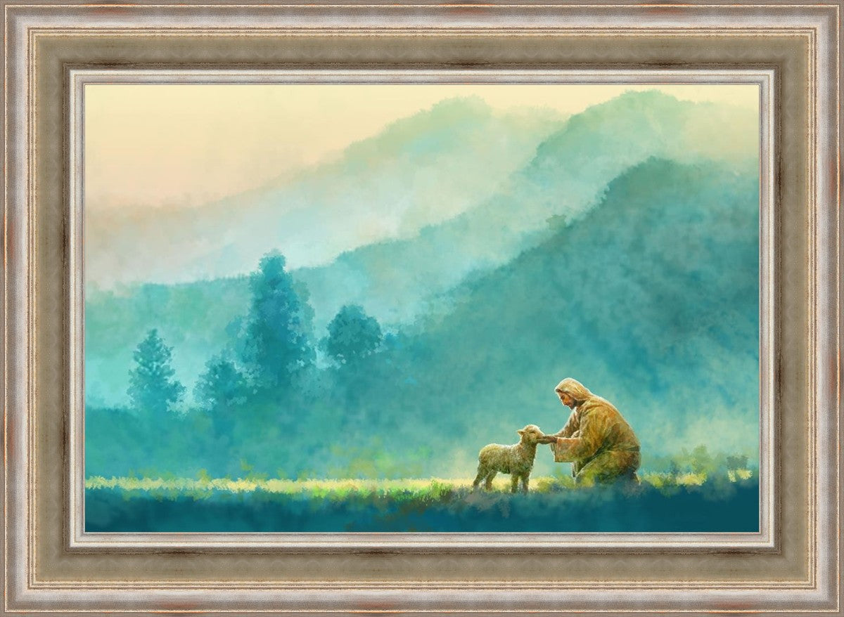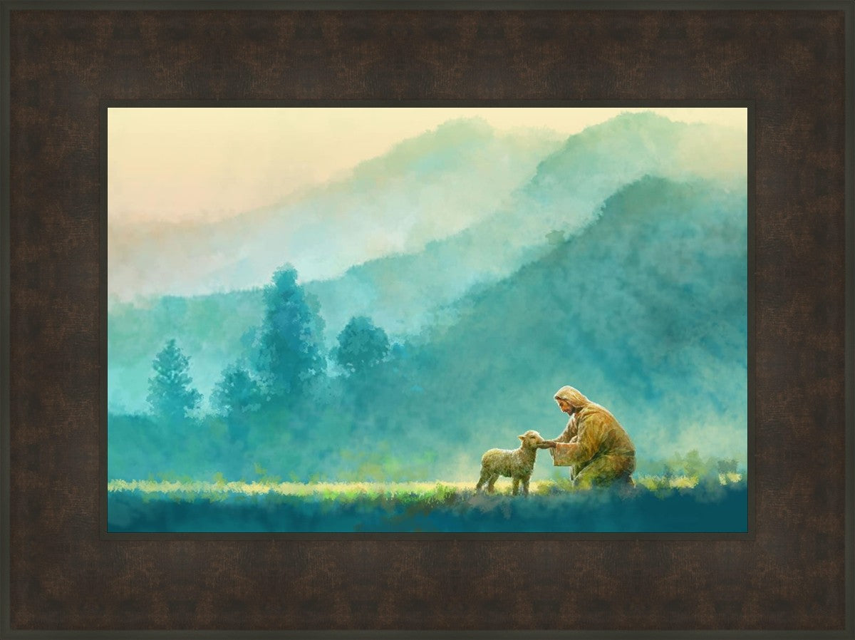 "Little One" by Yongsung Kim is a painting showcasing Jesus Christ tenderly caring for a lost lamb in a vast field, symbolizing His role as the Good Shepherd. This captivating artwork by Yongsung Kim captures the essence of divine care and compassion, for each and every member of His flock.