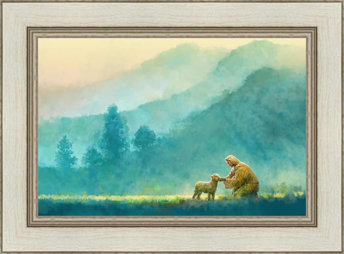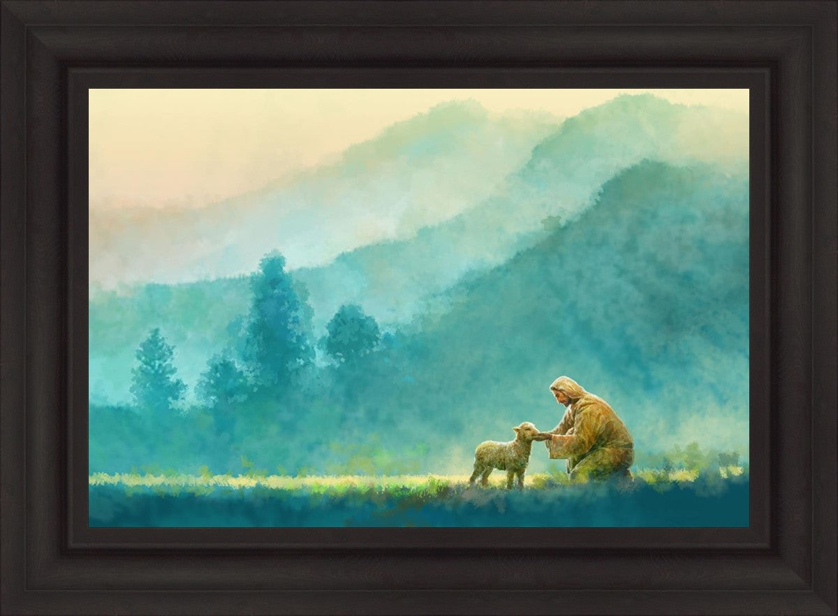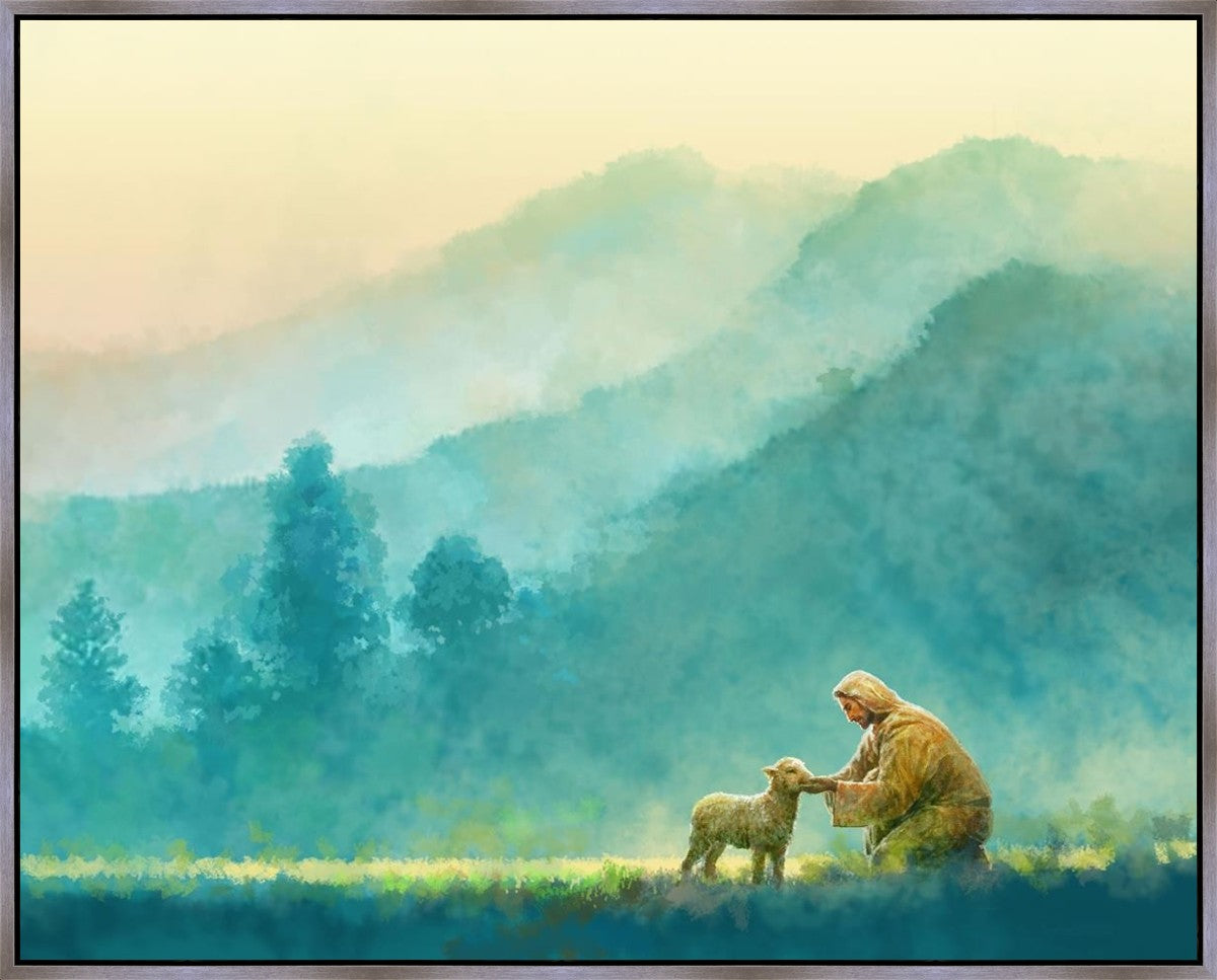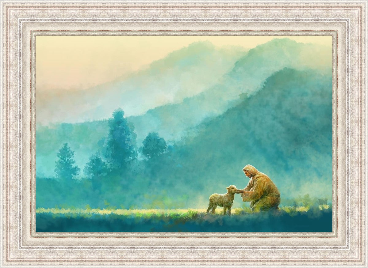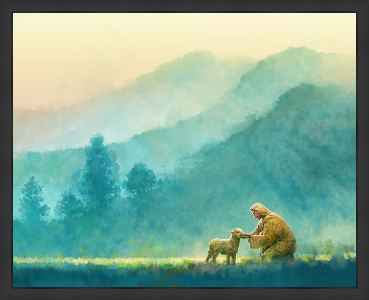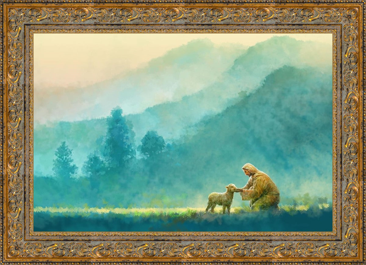 "Little One" by Yongsung Kim is a painting showcasing Jesus Christ tenderly caring for a lost lamb in a vast field, symbolizing His role as the Good Shepherd. This captivating artwork by Yongsung Kim captures the essence of divine care and compassion, for each and every member of His flock.