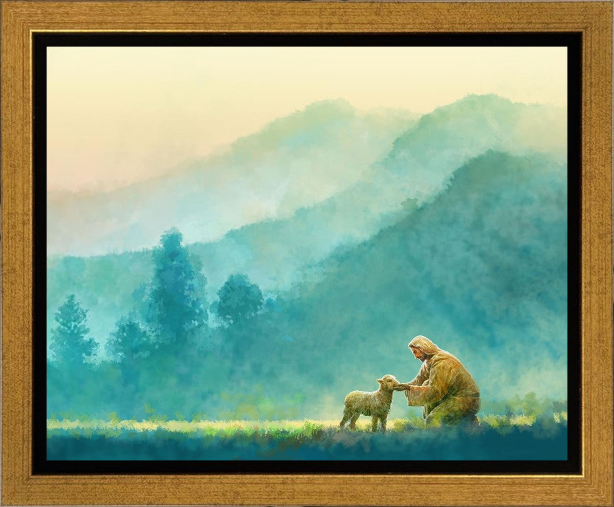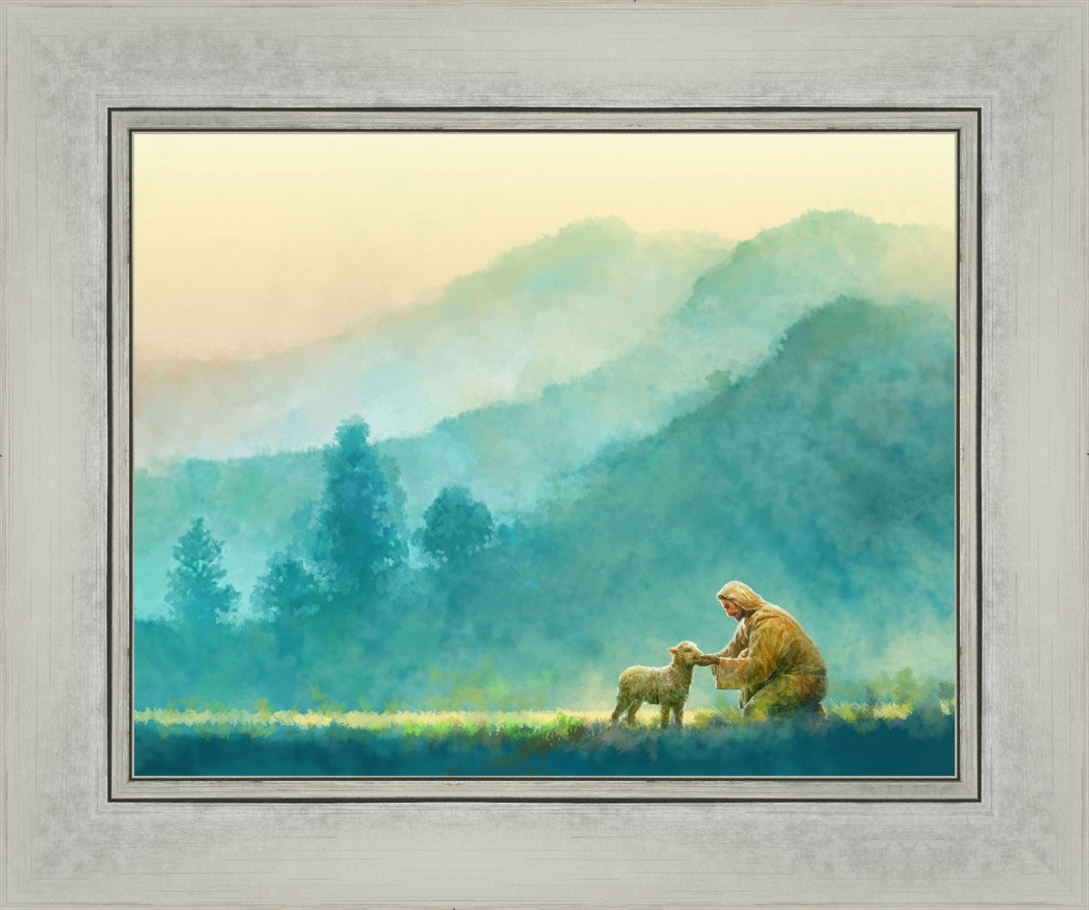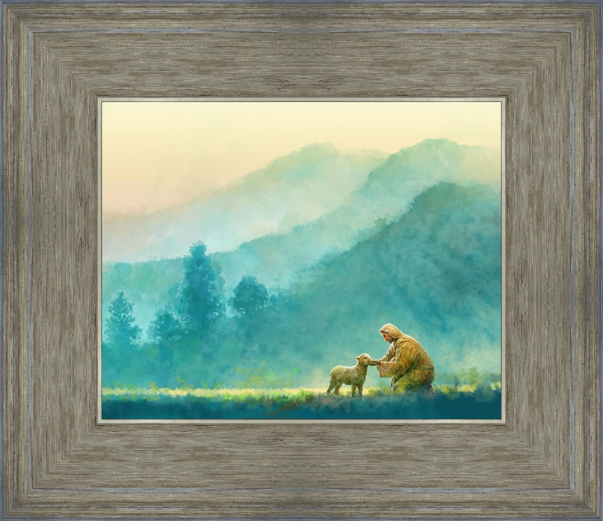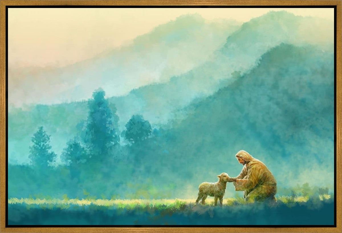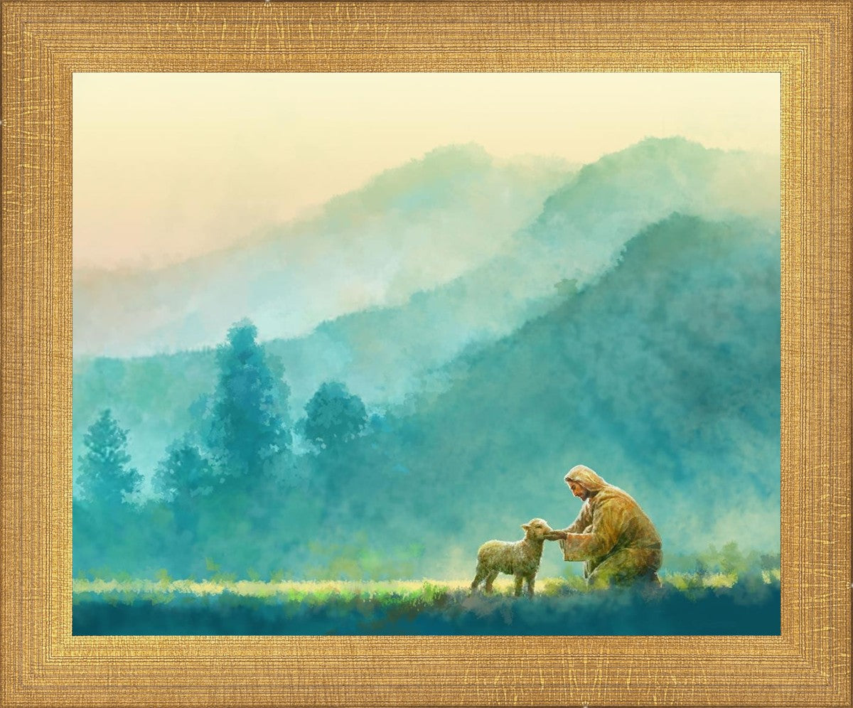 "Little One" by Yongsung Kim is a painting showcasing Jesus Christ tenderly caring for a lost lamb in a vast field, symbolizing His role as the Good Shepherd. This captivating artwork by Yongsung Kim captures the essence of divine care and compassion, for each and every member of His flock.