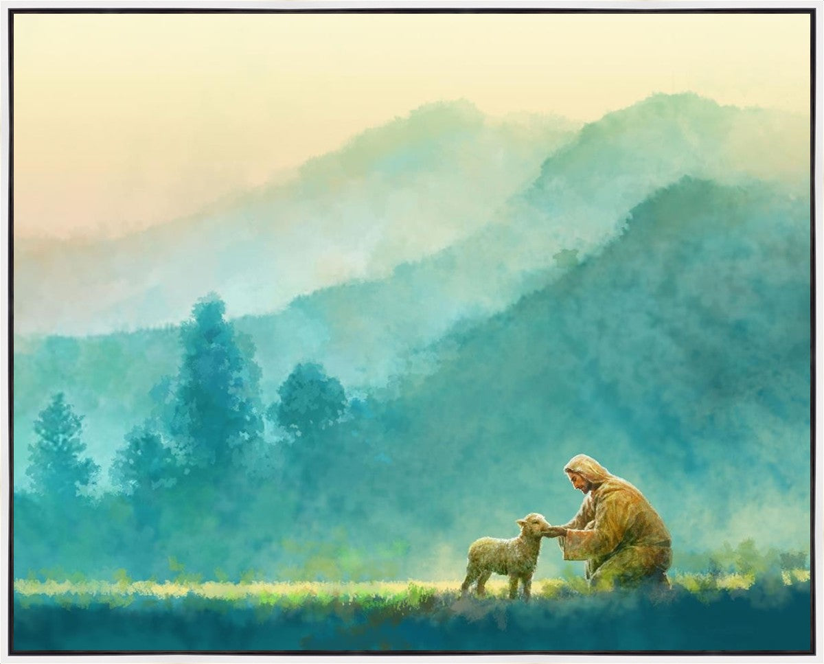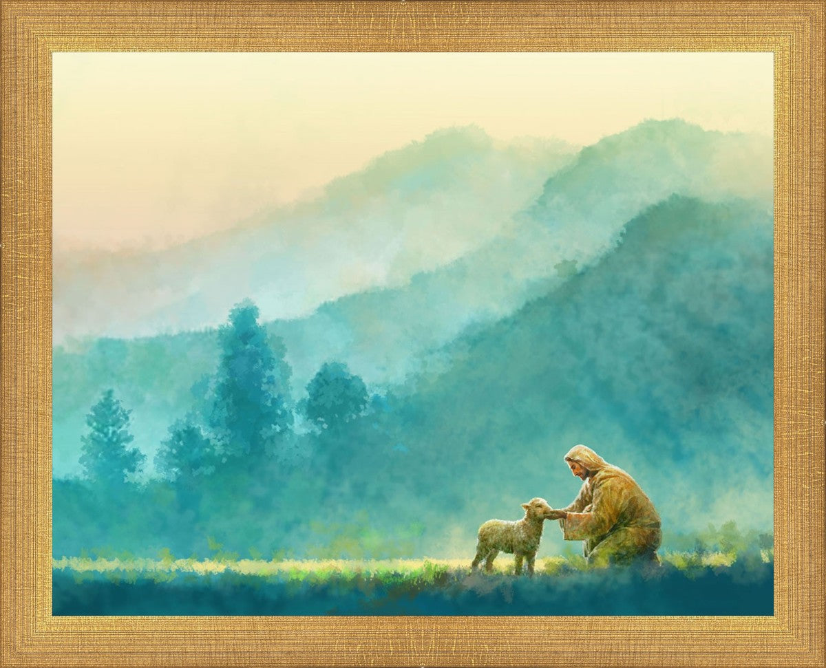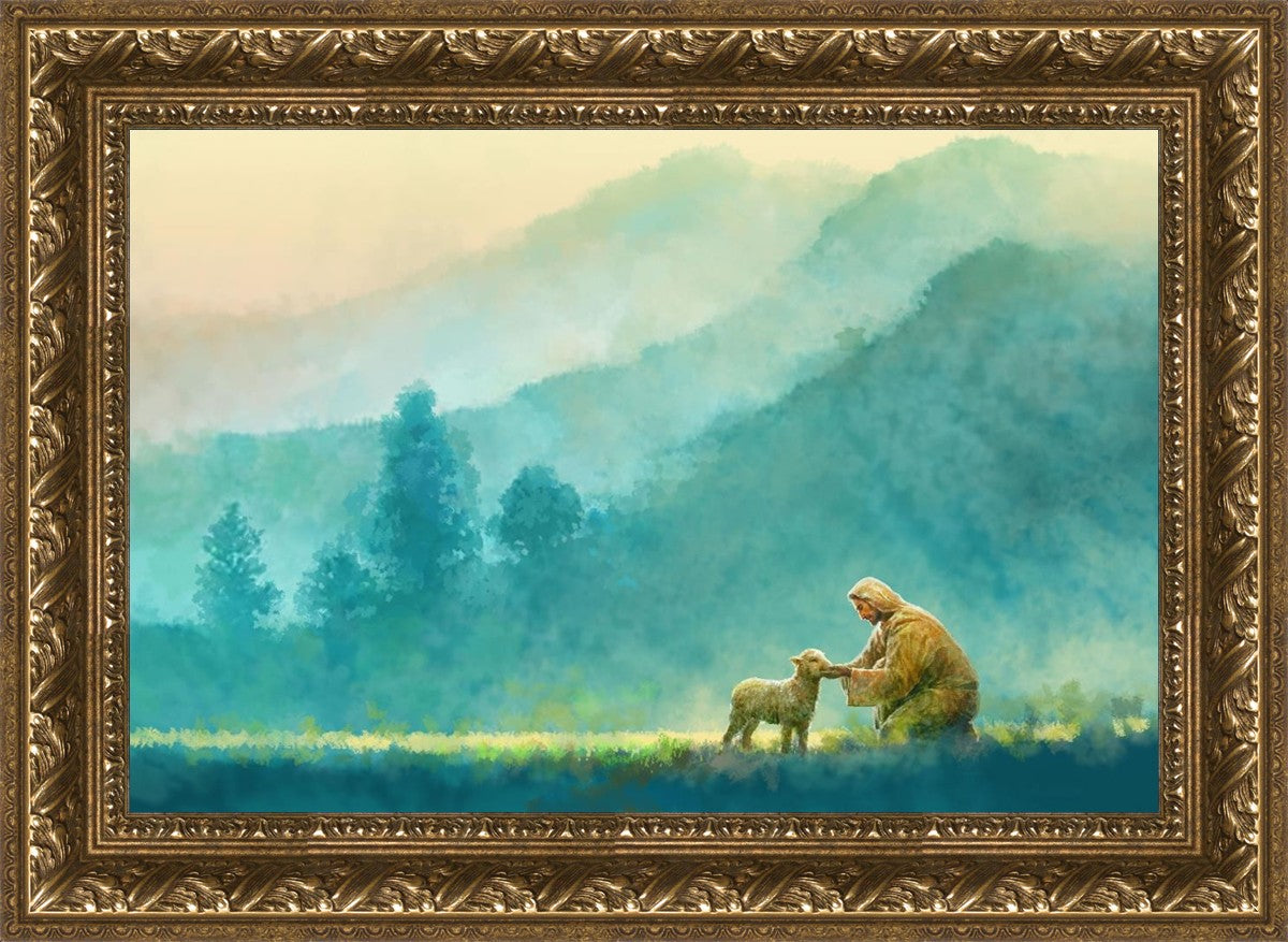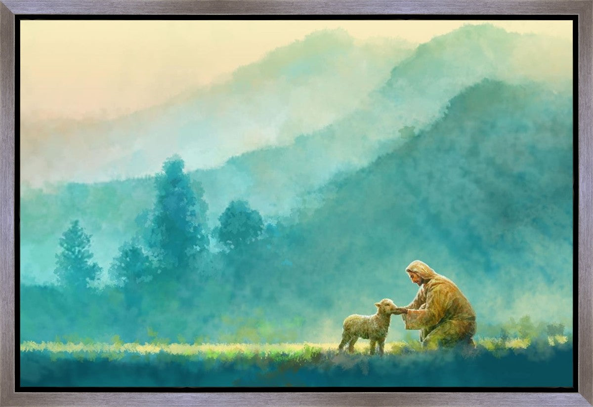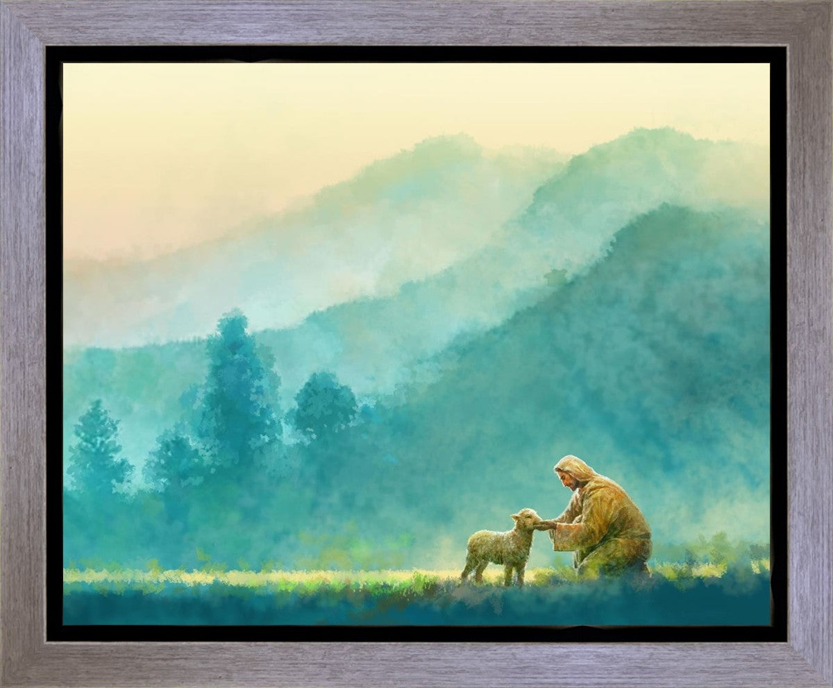"Little One" by Yongsung Kim is a painting showcasing Jesus Christ tenderly caring for a lost lamb in a vast field, symbolizing His role as the Good Shepherd. This captivating artwork by Yongsung Kim captures the essence of divine care and compassion, for each and every member of His flock.