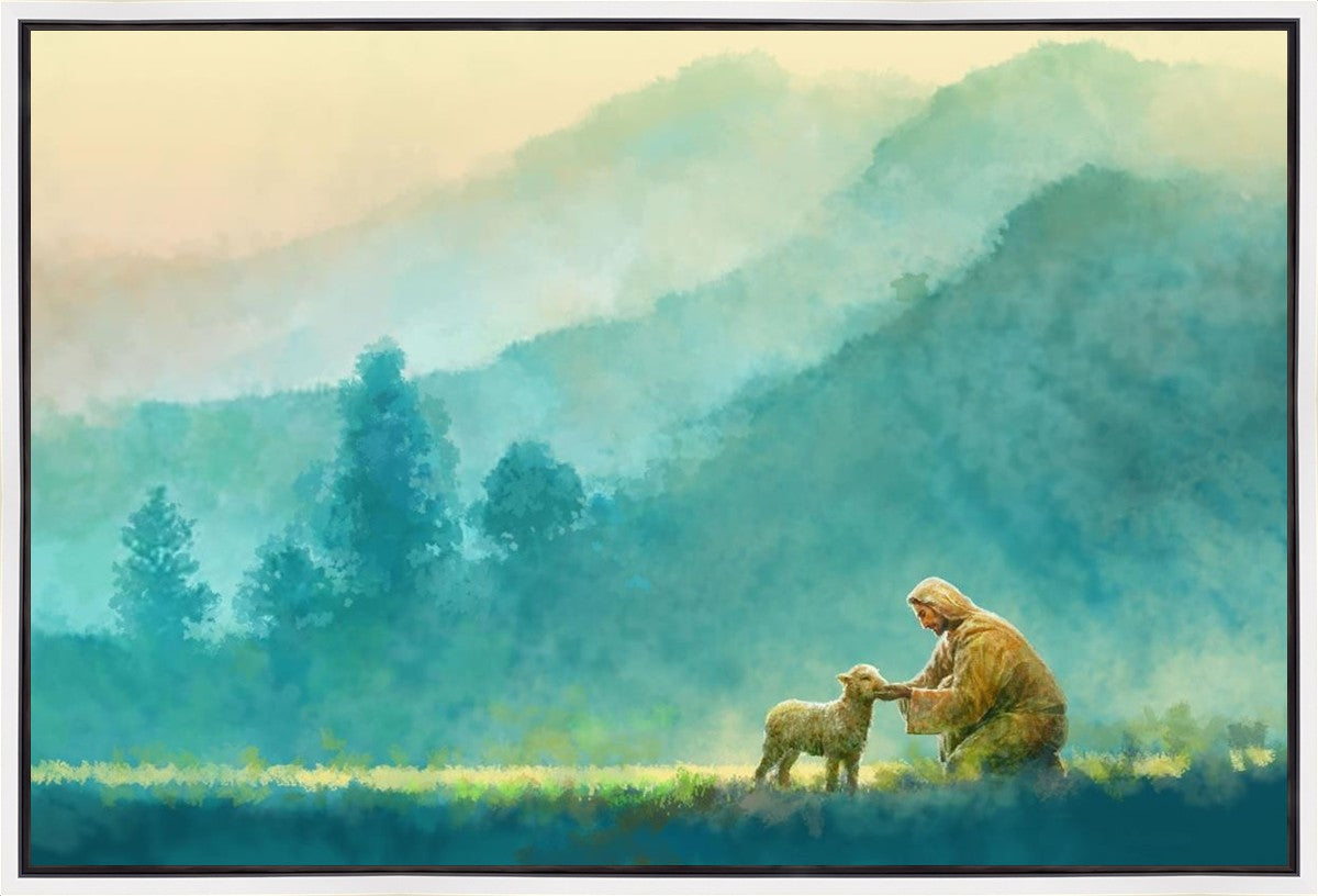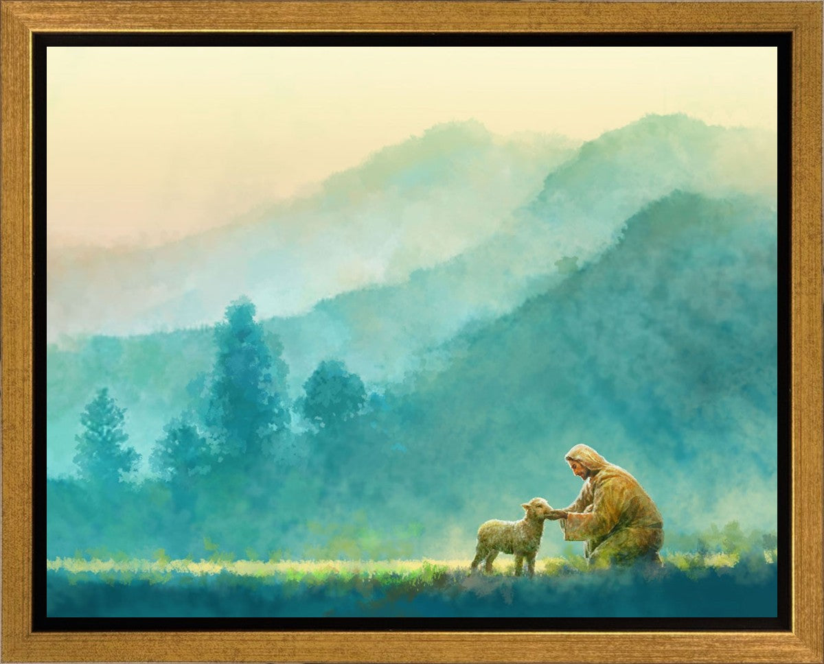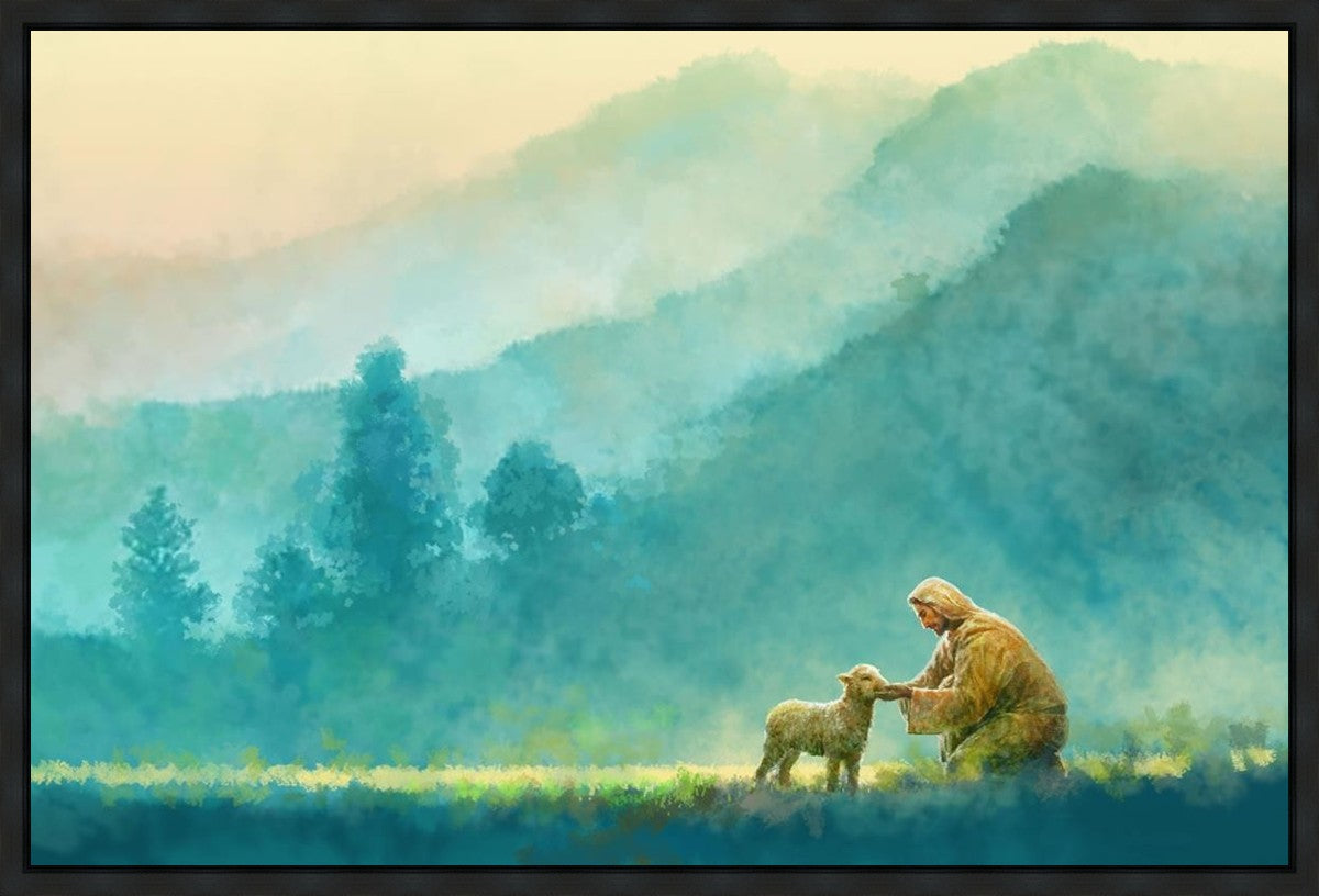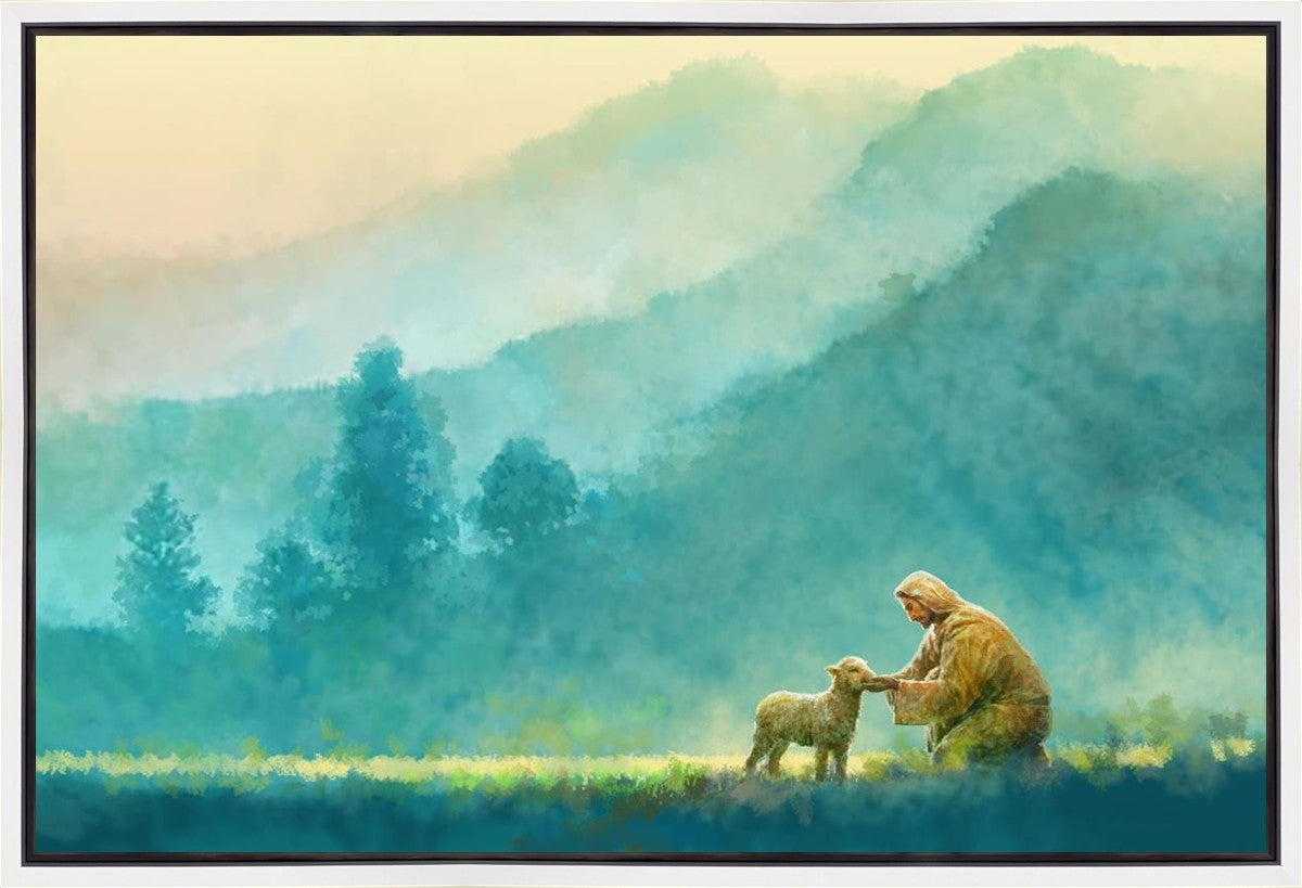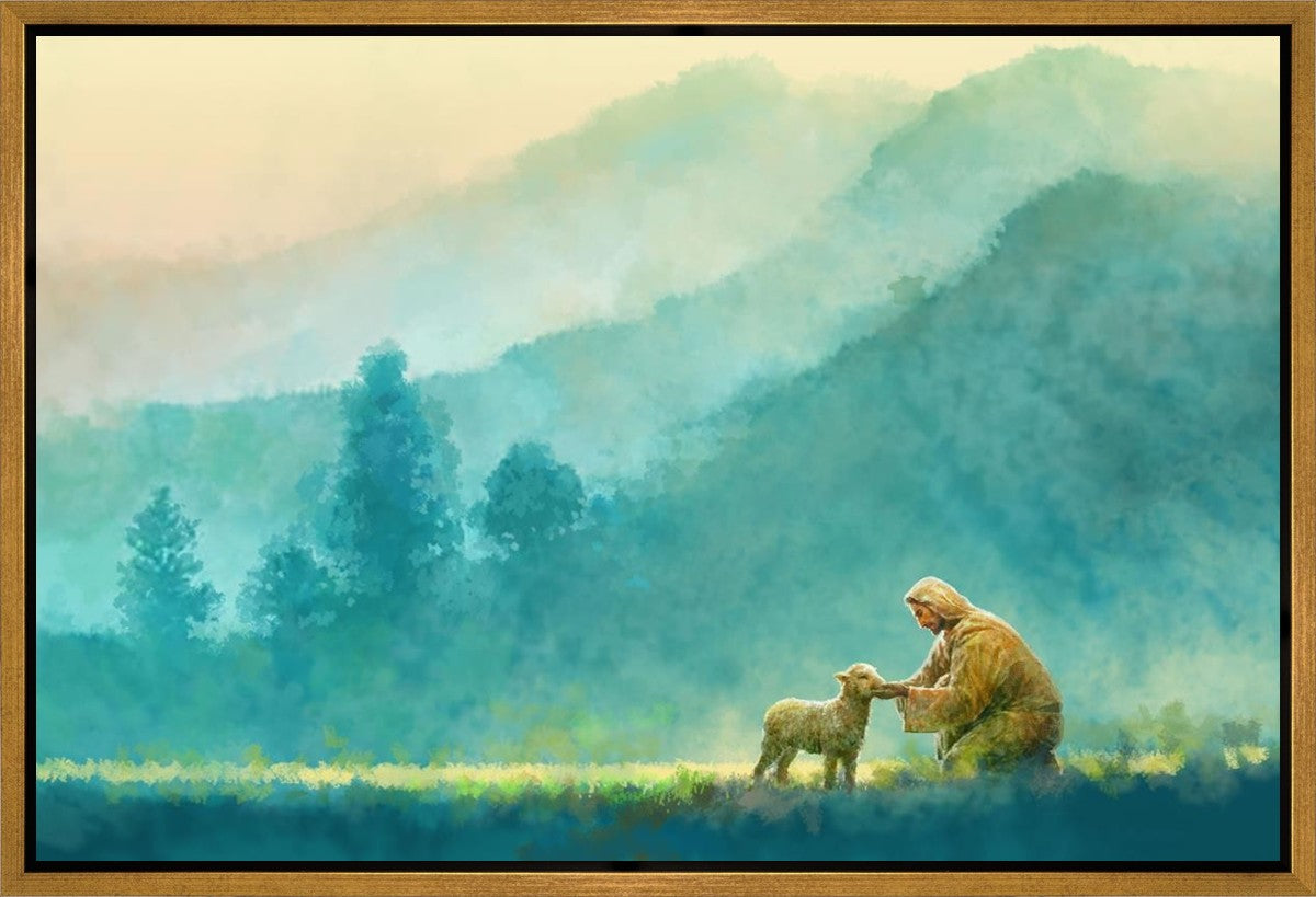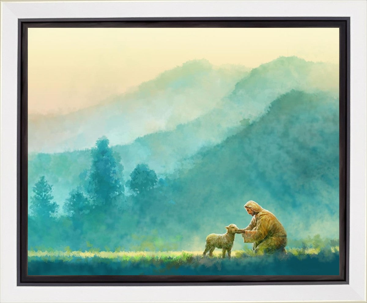 "Little One" by Yongsung Kim is a painting showcasing Jesus Christ tenderly caring for a lost lamb in a vast field, symbolizing His role as the Good Shepherd. This captivating artwork by Yongsung Kim captures the essence of divine care and compassion, for each and every member of His flock.