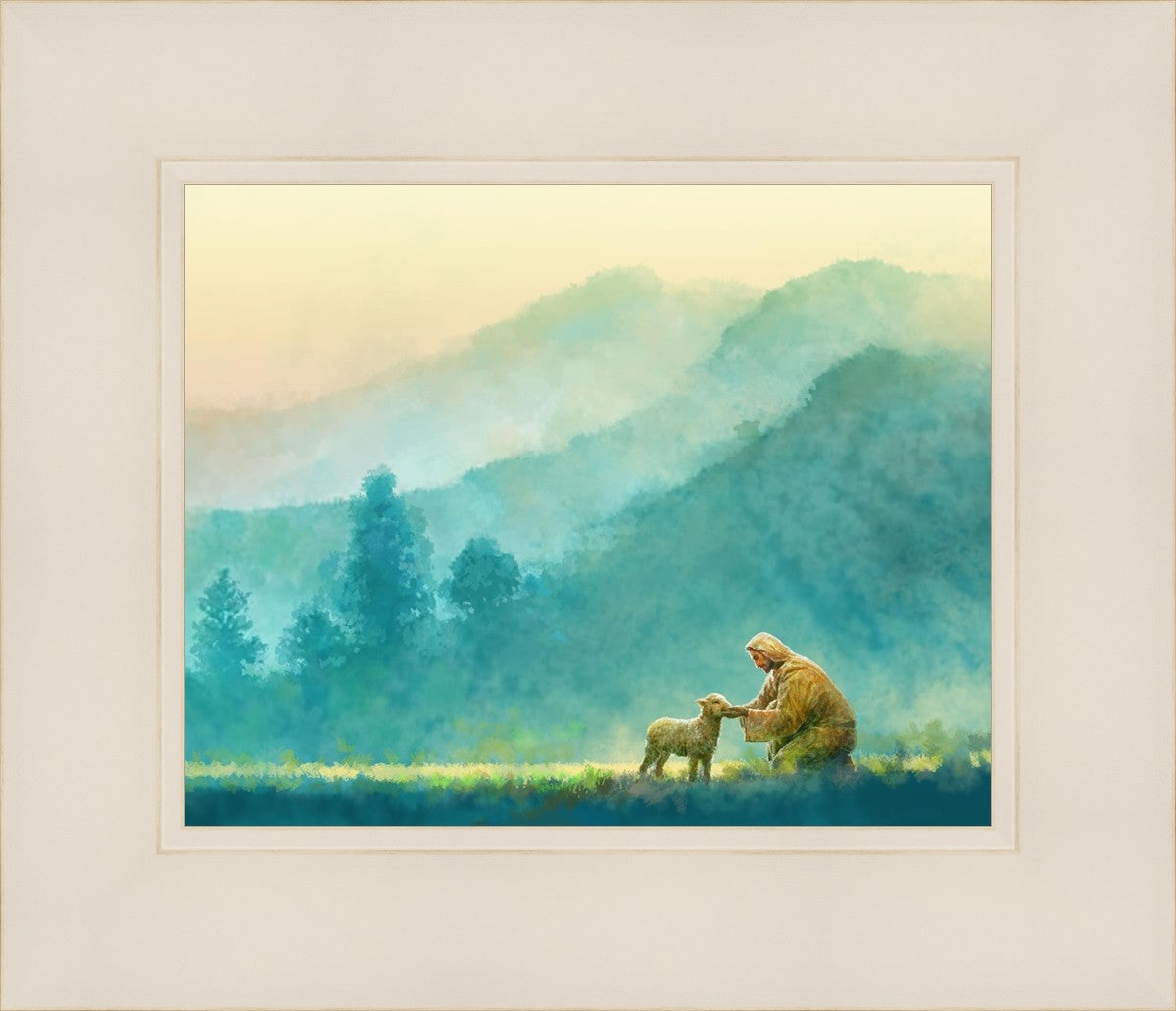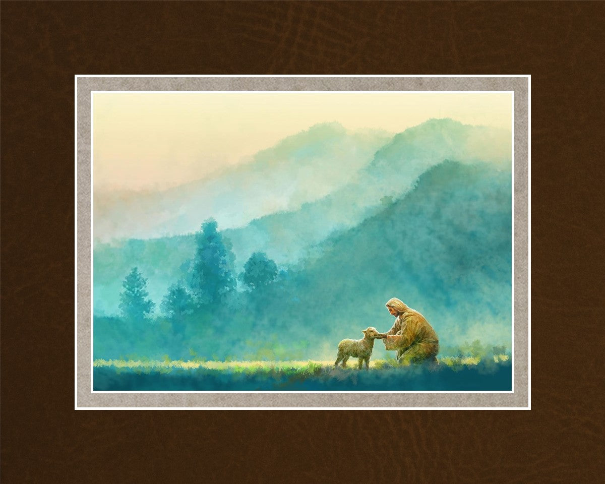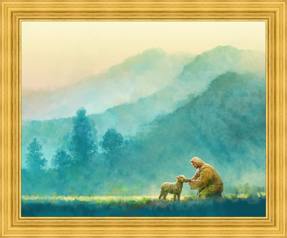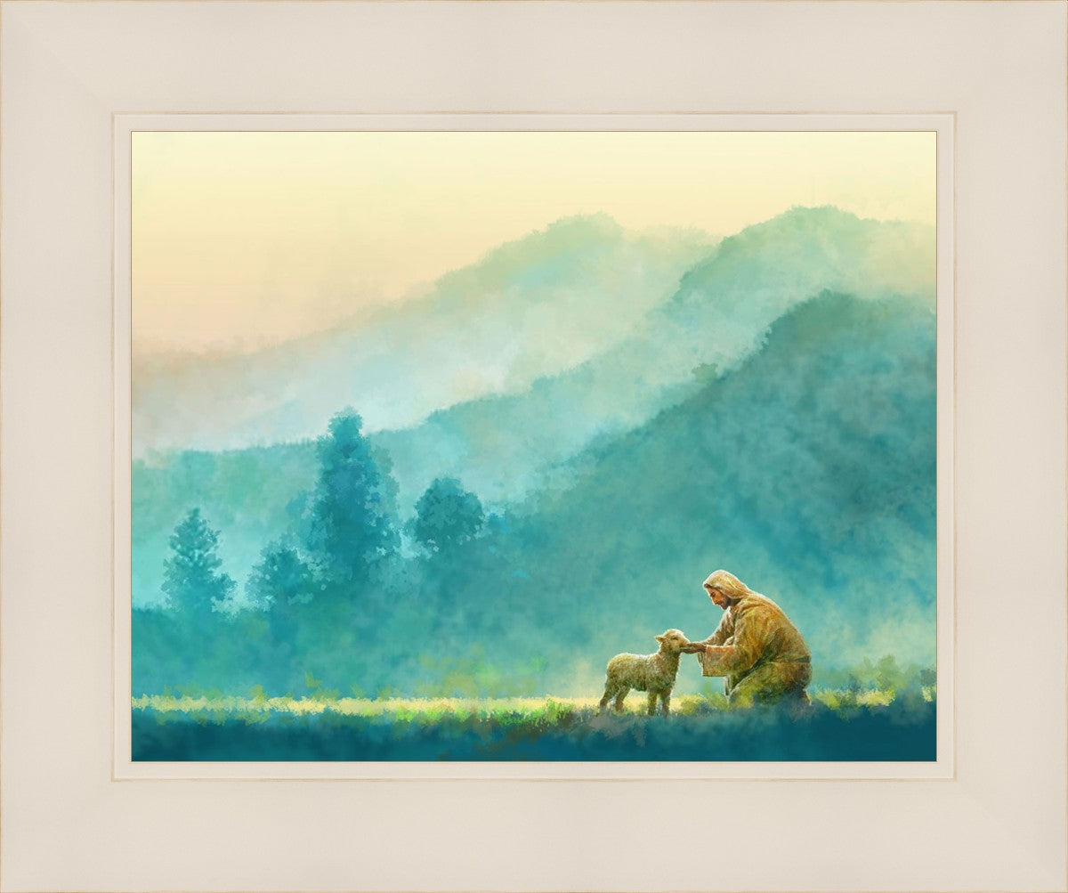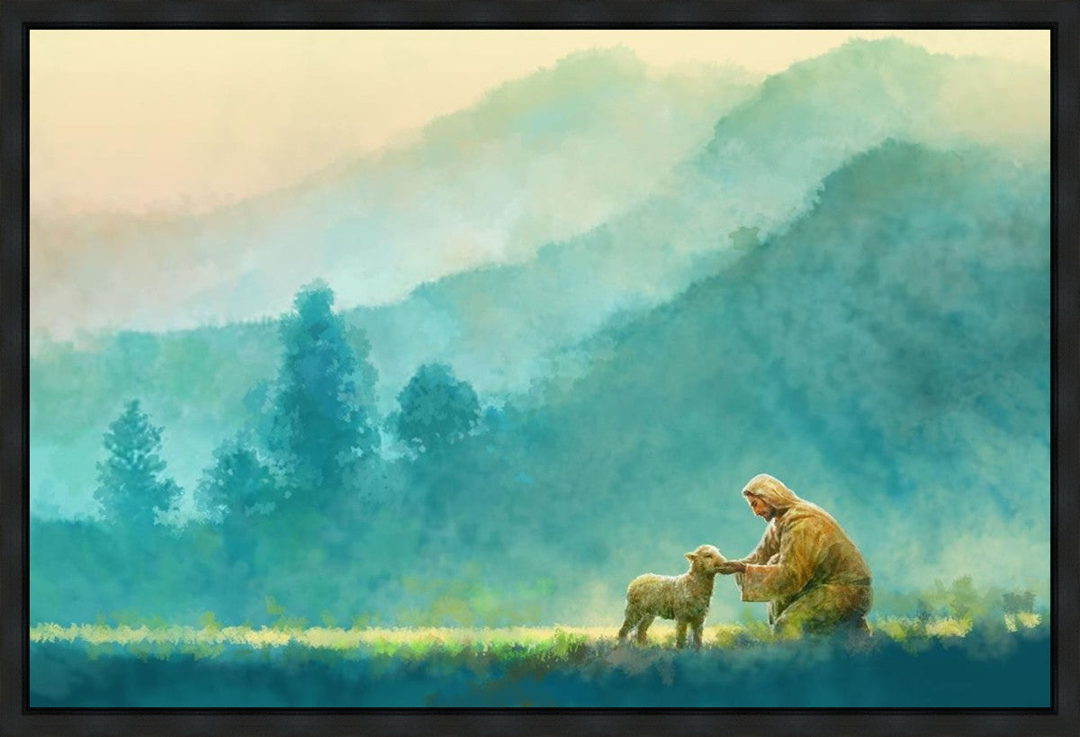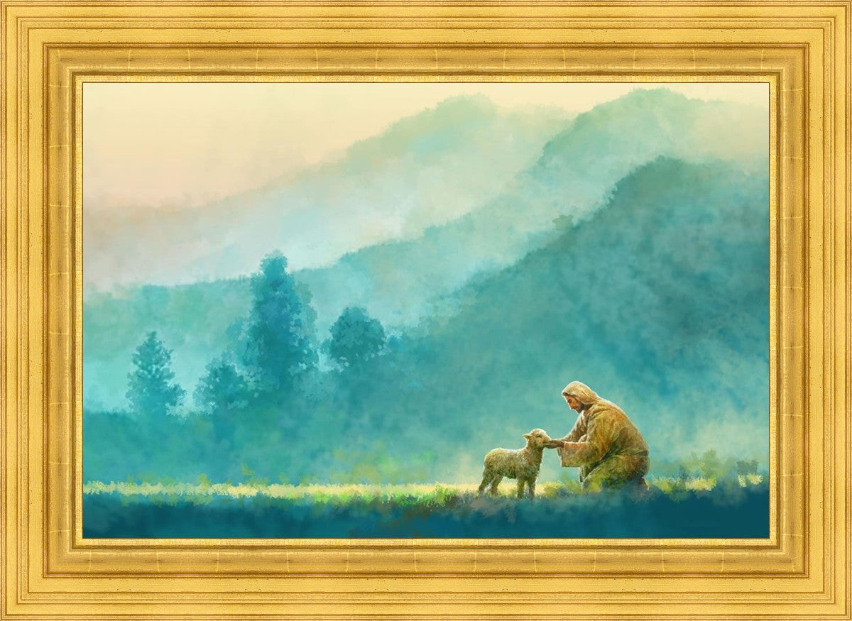 "Little One" by Yongsung Kim is a painting showcasing Jesus Christ tenderly caring for a lost lamb in a vast field, symbolizing His role as the Good Shepherd. This captivating artwork by Yongsung Kim captures the essence of divine care and compassion, for each and every member of His flock.