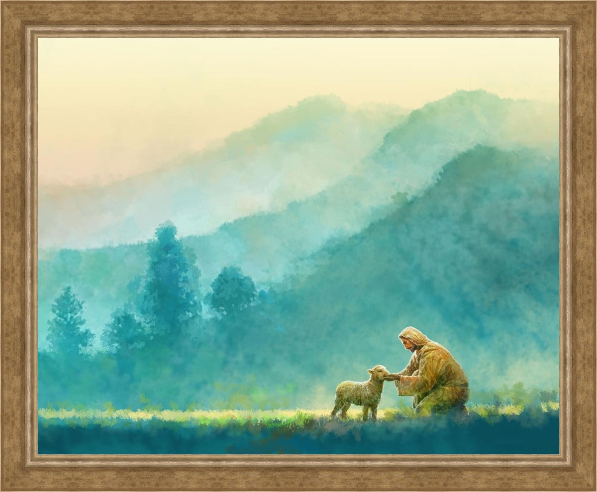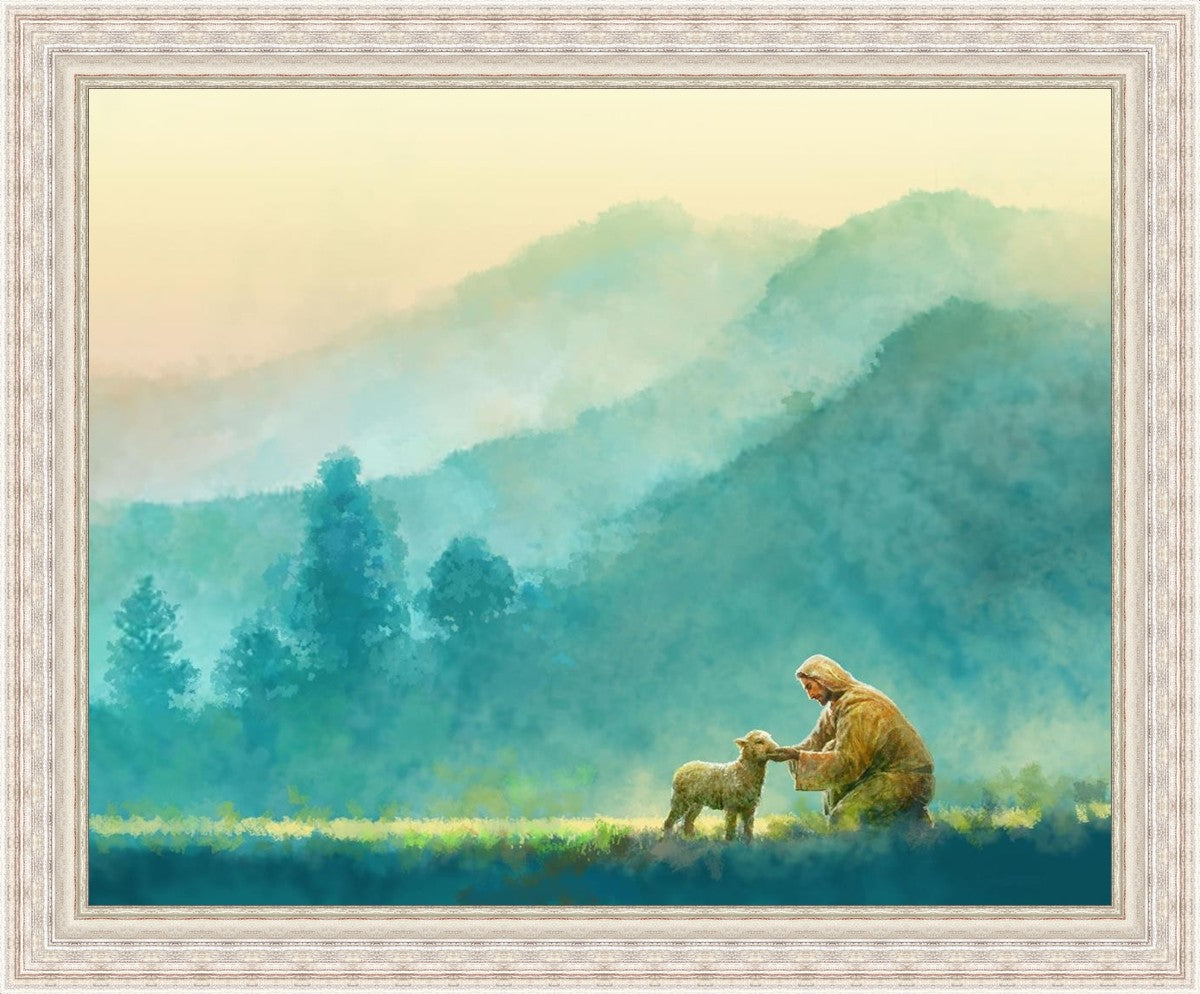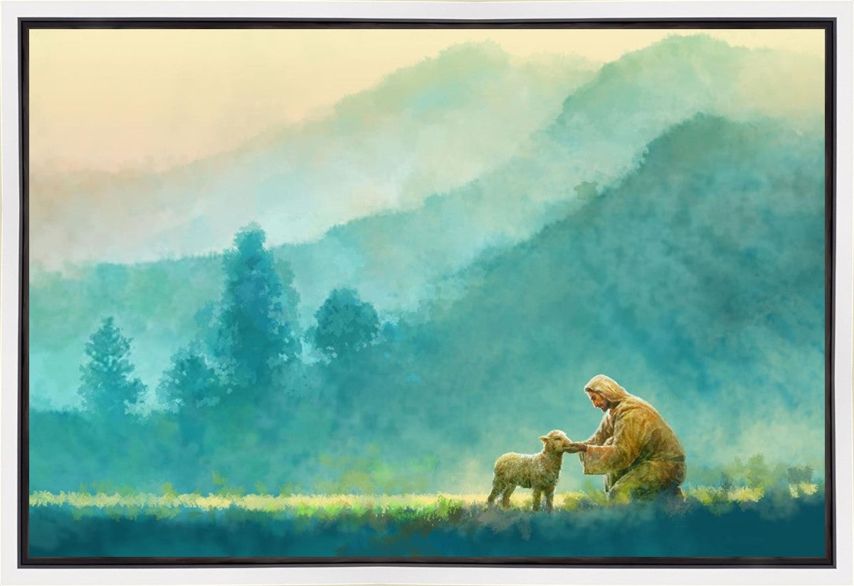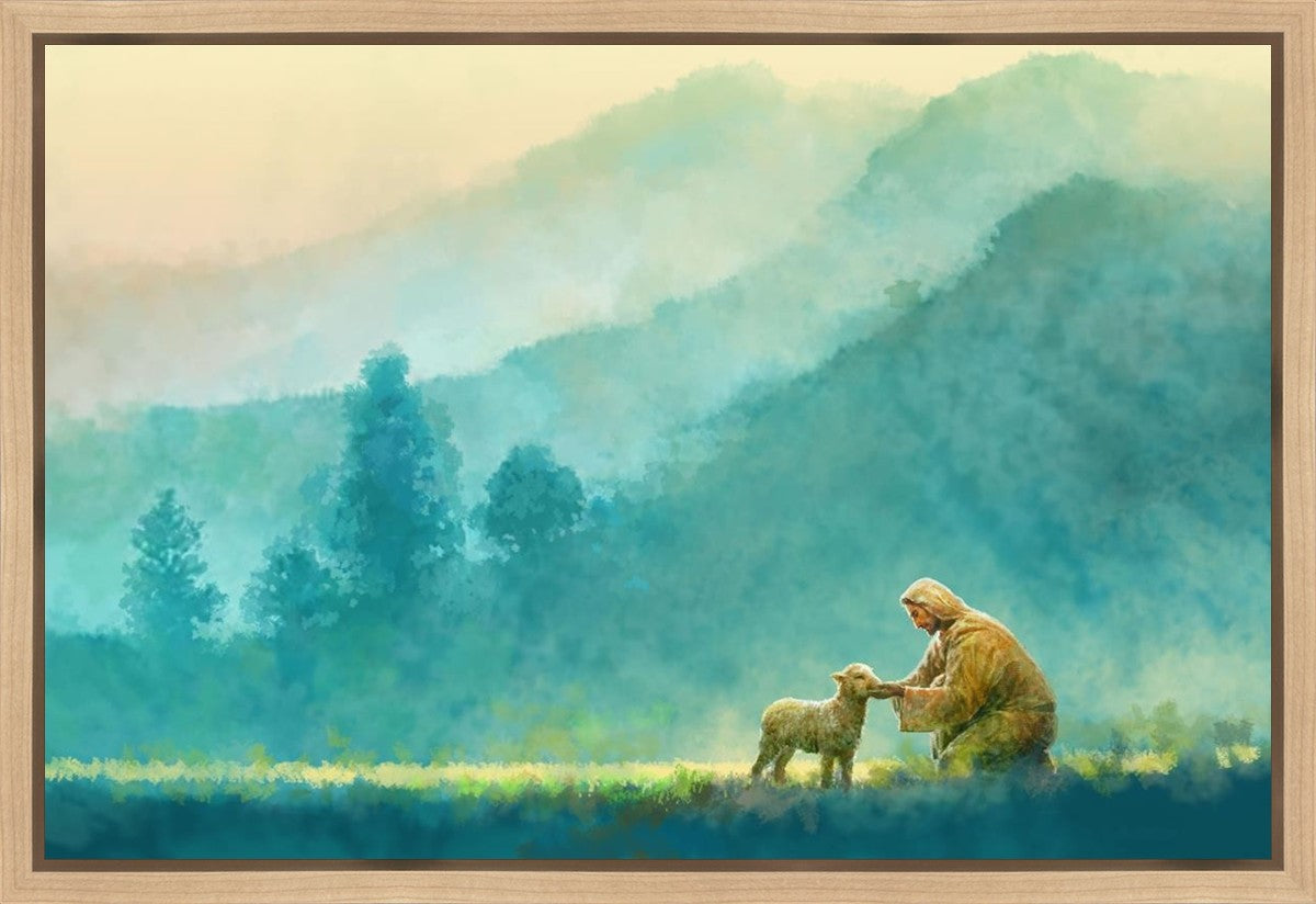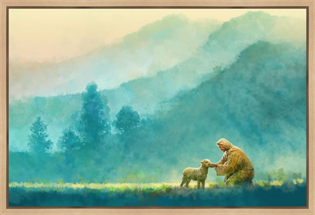 "Little One" by Yongsung Kim is a painting showcasing Jesus Christ tenderly caring for a lost lamb in a vast field, symbolizing His role as the Good Shepherd. This captivating artwork by Yongsung Kim captures the essence of divine care and compassion, for each and every member of His flock.