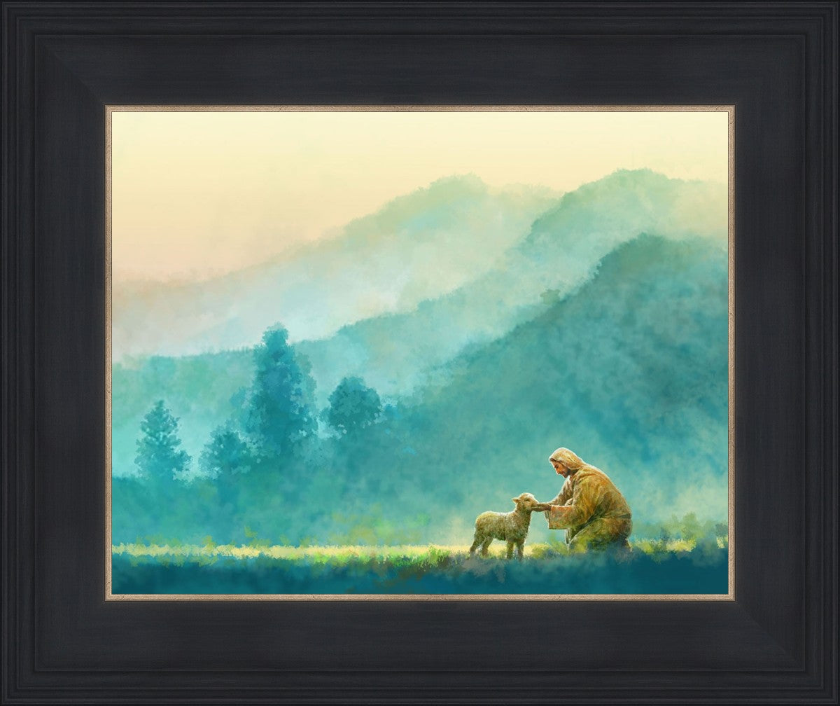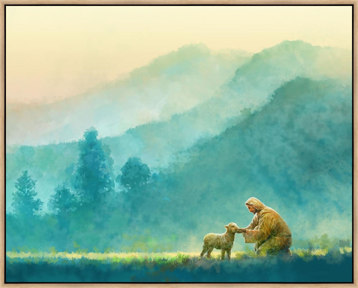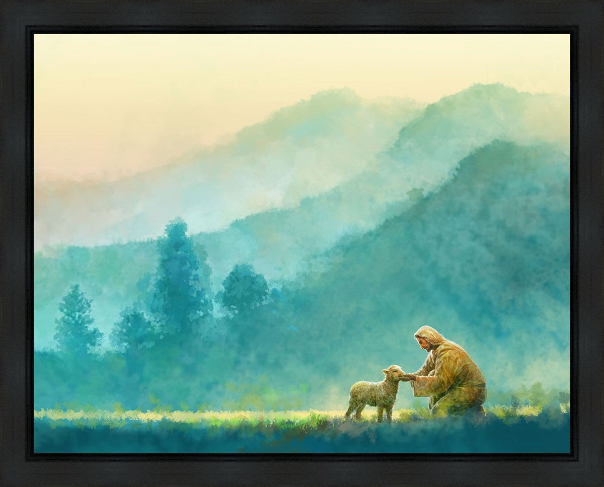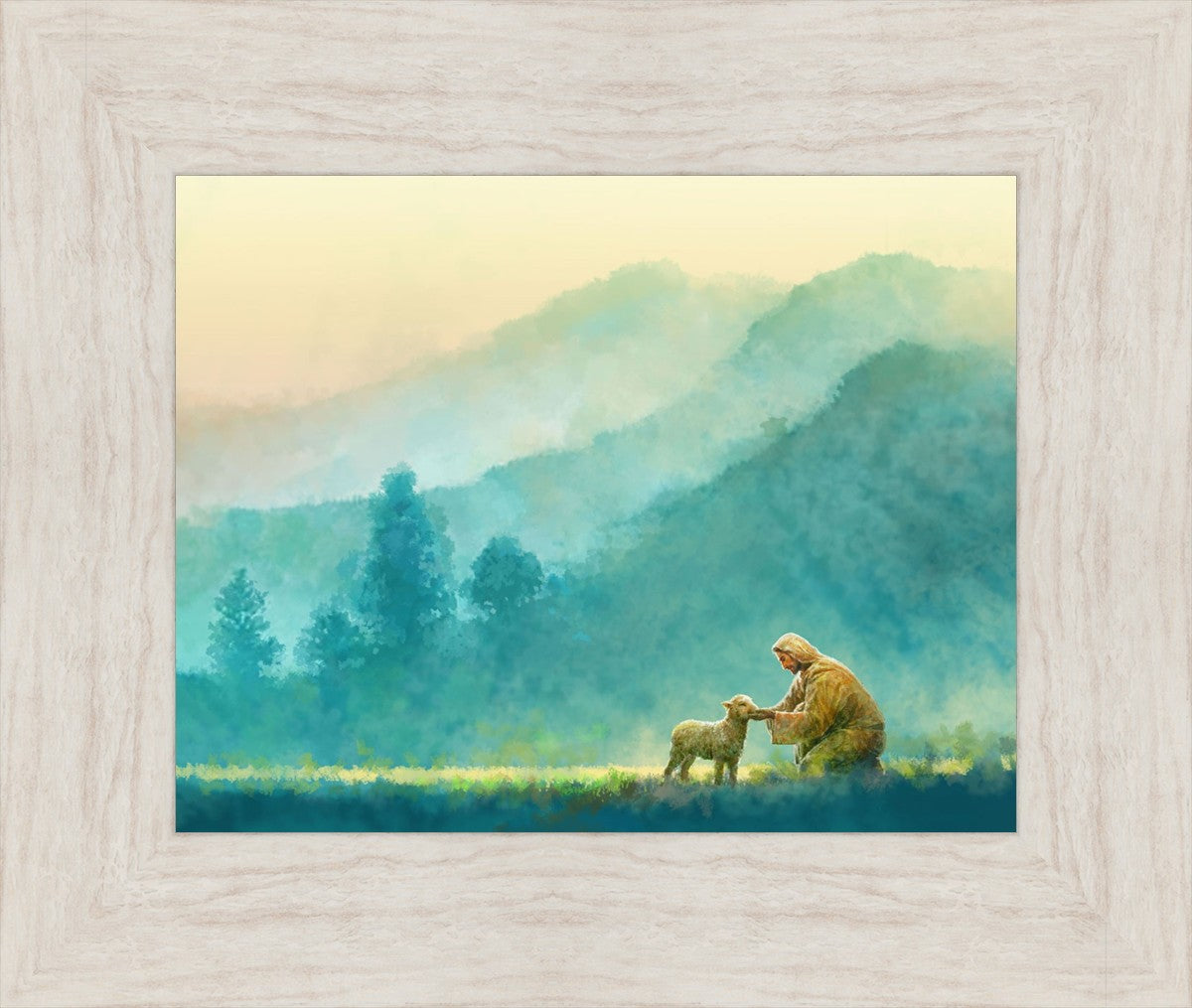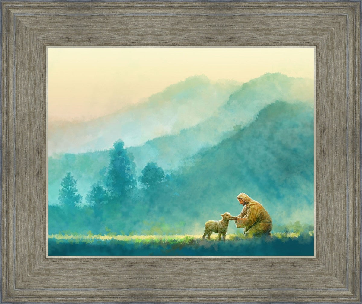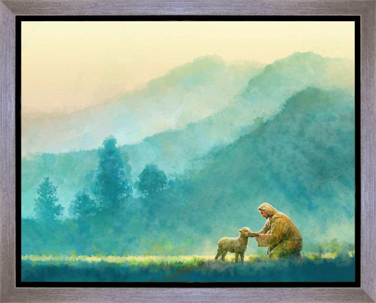 "Little One" by Yongsung Kim is a painting showcasing Jesus Christ tenderly caring for a lost lamb in a vast field, symbolizing His role as the Good Shepherd. This captivating artwork by Yongsung Kim captures the essence of divine care and compassion, for each and every member of His flock.