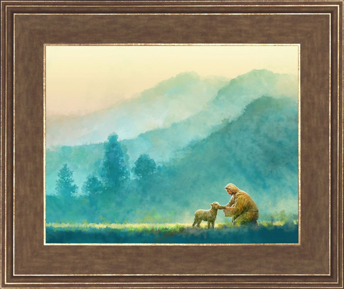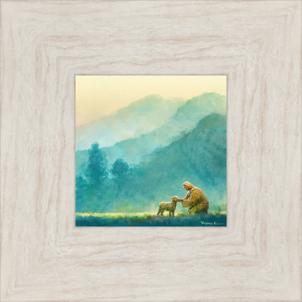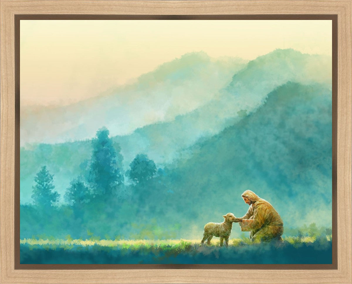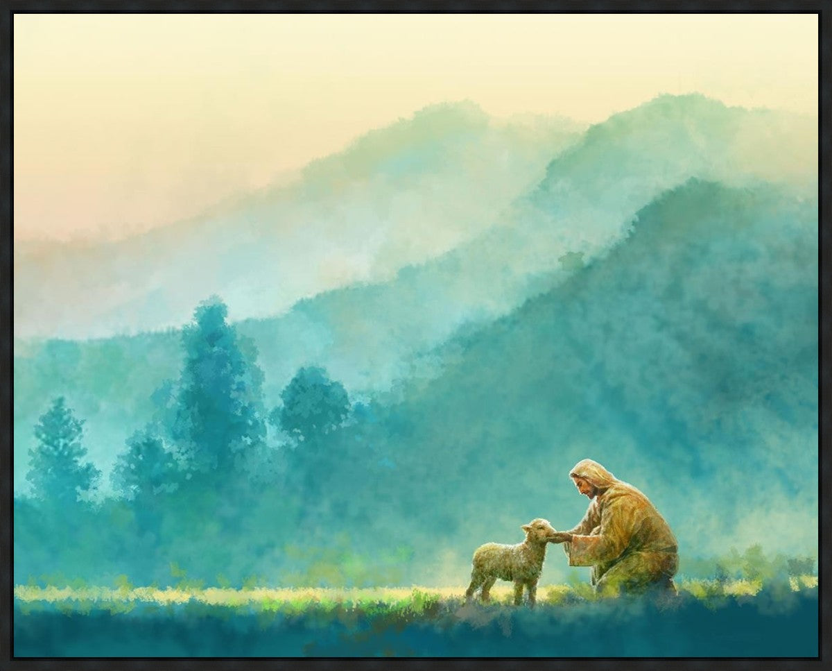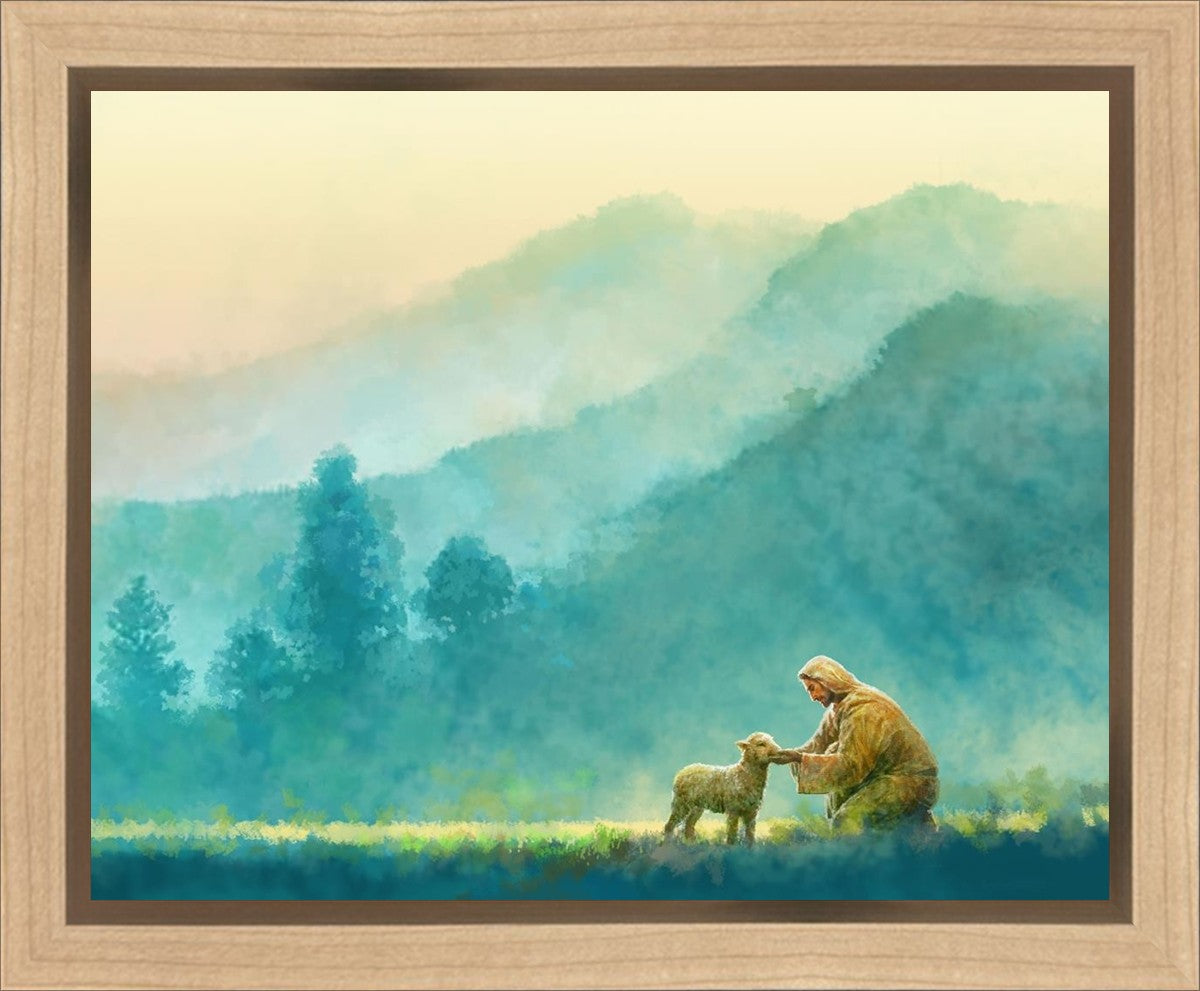 "Little One" by Yongsung Kim is a painting showcasing Jesus Christ tenderly caring for a lost lamb in a vast field, symbolizing His role as the Good Shepherd. This captivating artwork by Yongsung Kim captures the essence of divine care and compassion, for each and every member of His flock.