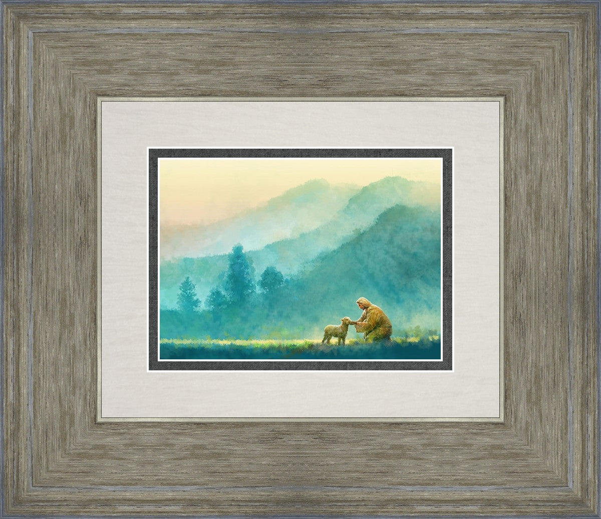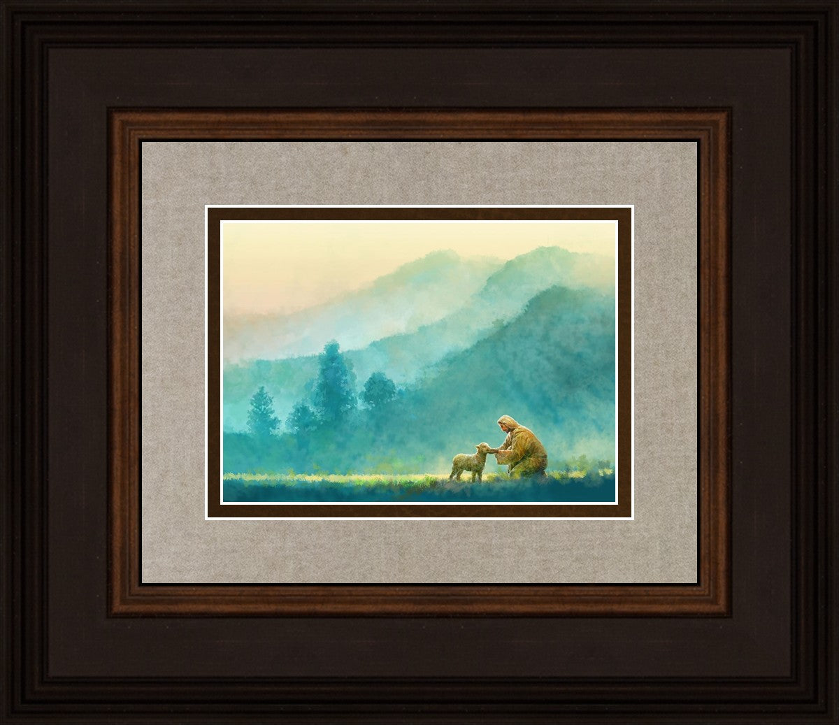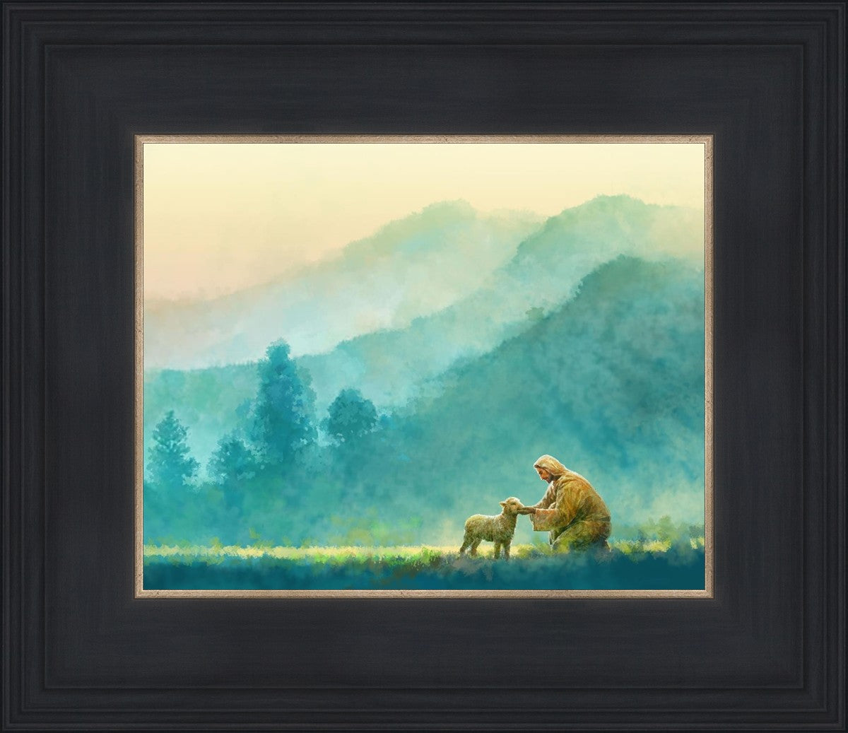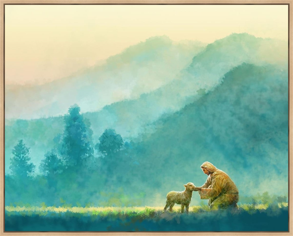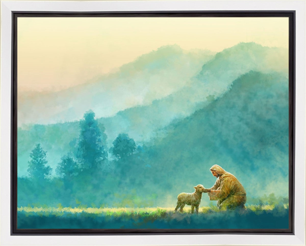 "Little One" by Yongsung Kim is a painting showcasing Jesus Christ tenderly caring for a lost lamb in a vast field, symbolizing His role as the Good Shepherd. This captivating artwork by Yongsung Kim captures the essence of divine care and compassion, for each and every member of His flock.