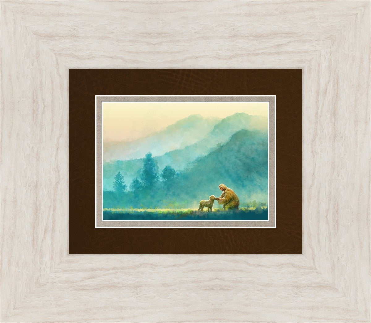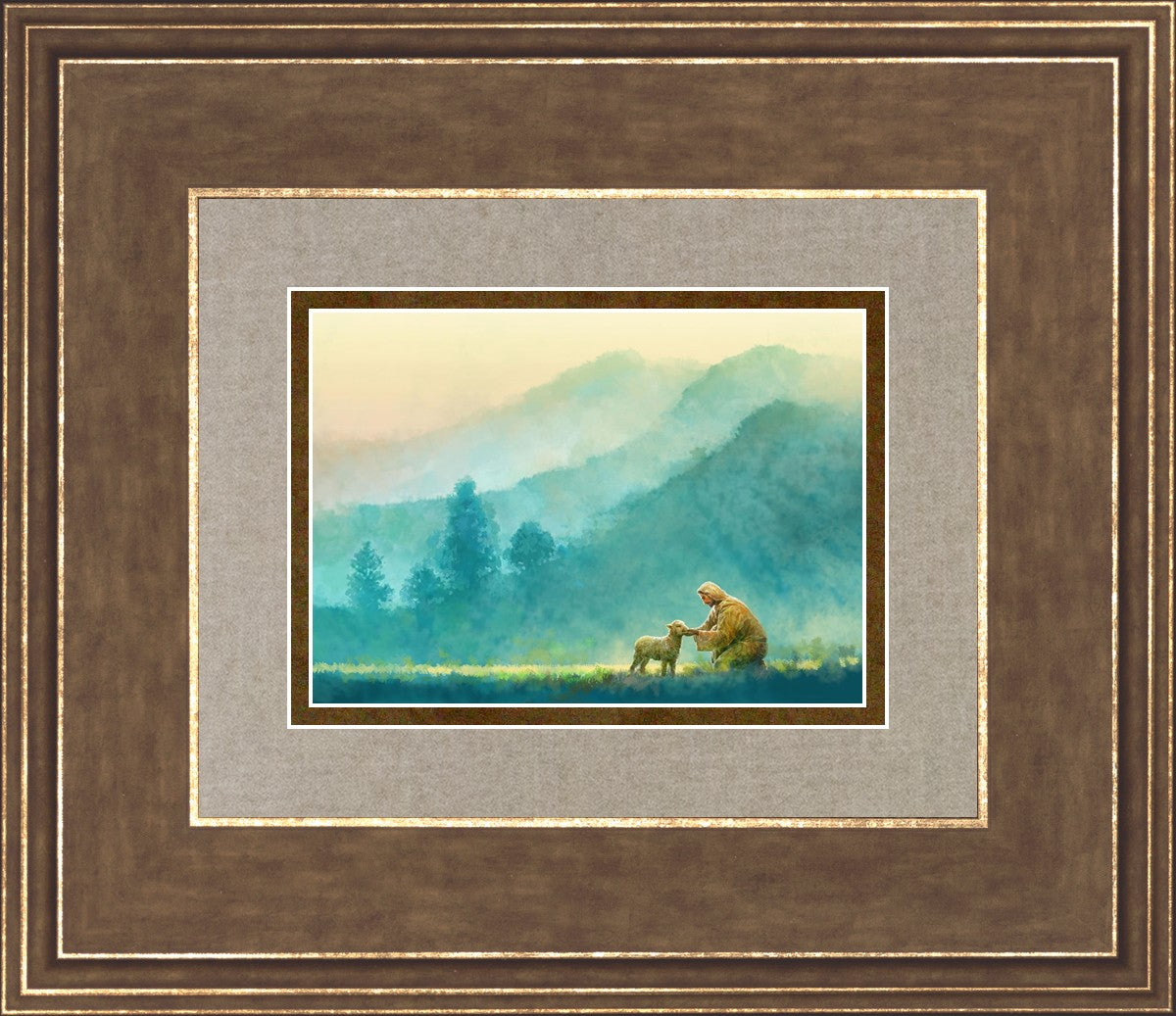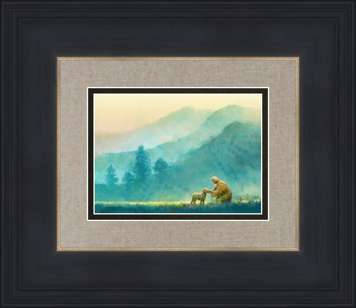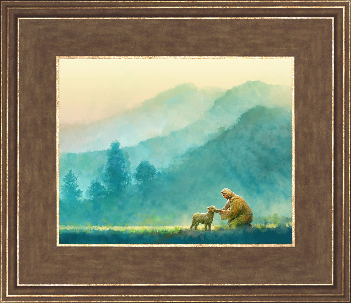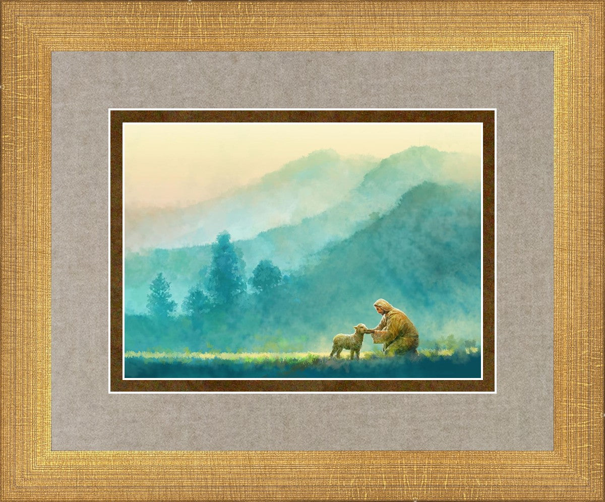 "Little One" by Yongsung Kim is a painting showcasing Jesus Christ tenderly caring for a lost lamb in a vast field, symbolizing His role as the Good Shepherd. This captivating artwork by Yongsung Kim captures the essence of divine care and compassion, for each and every member of His flock.