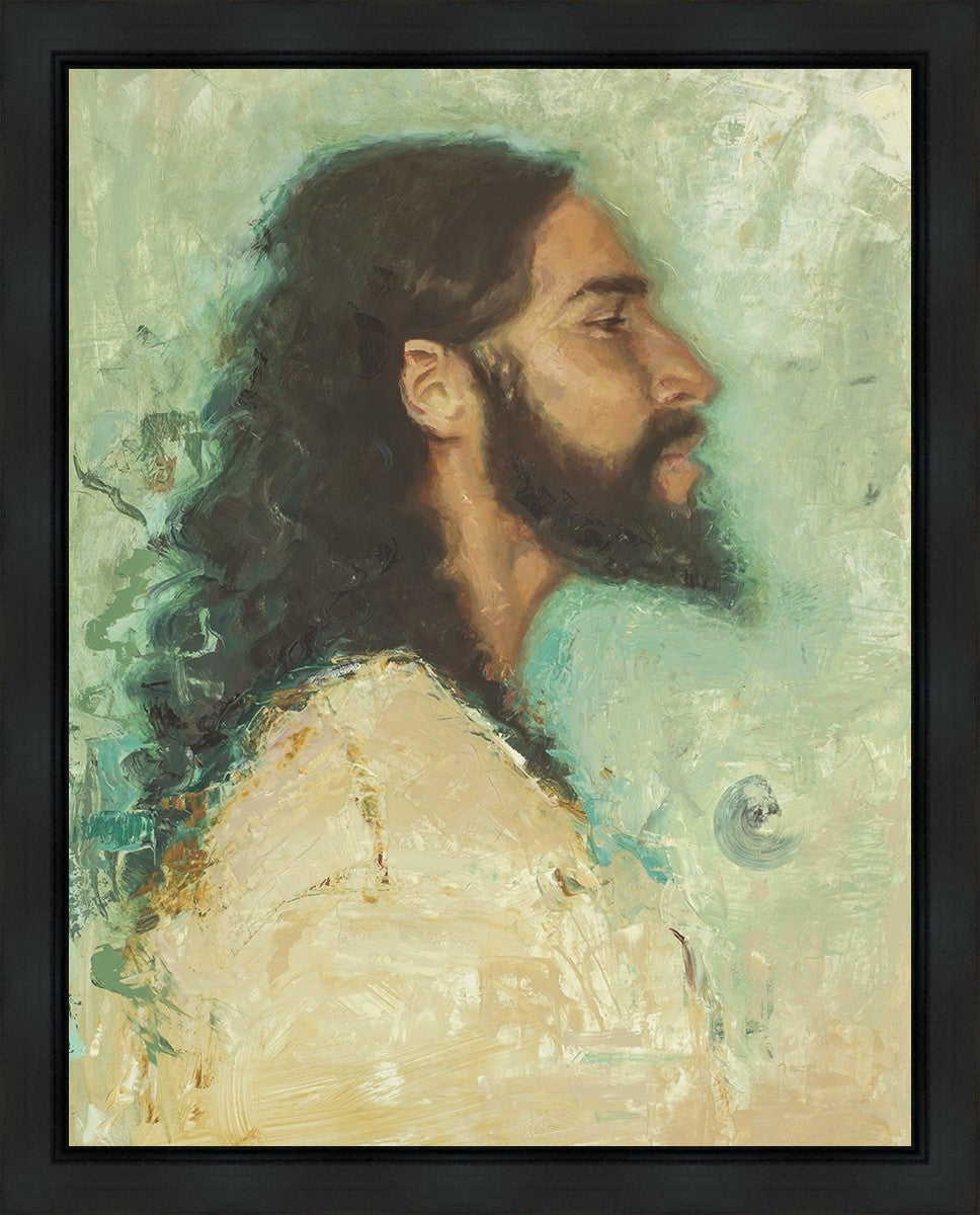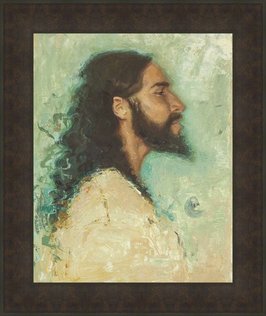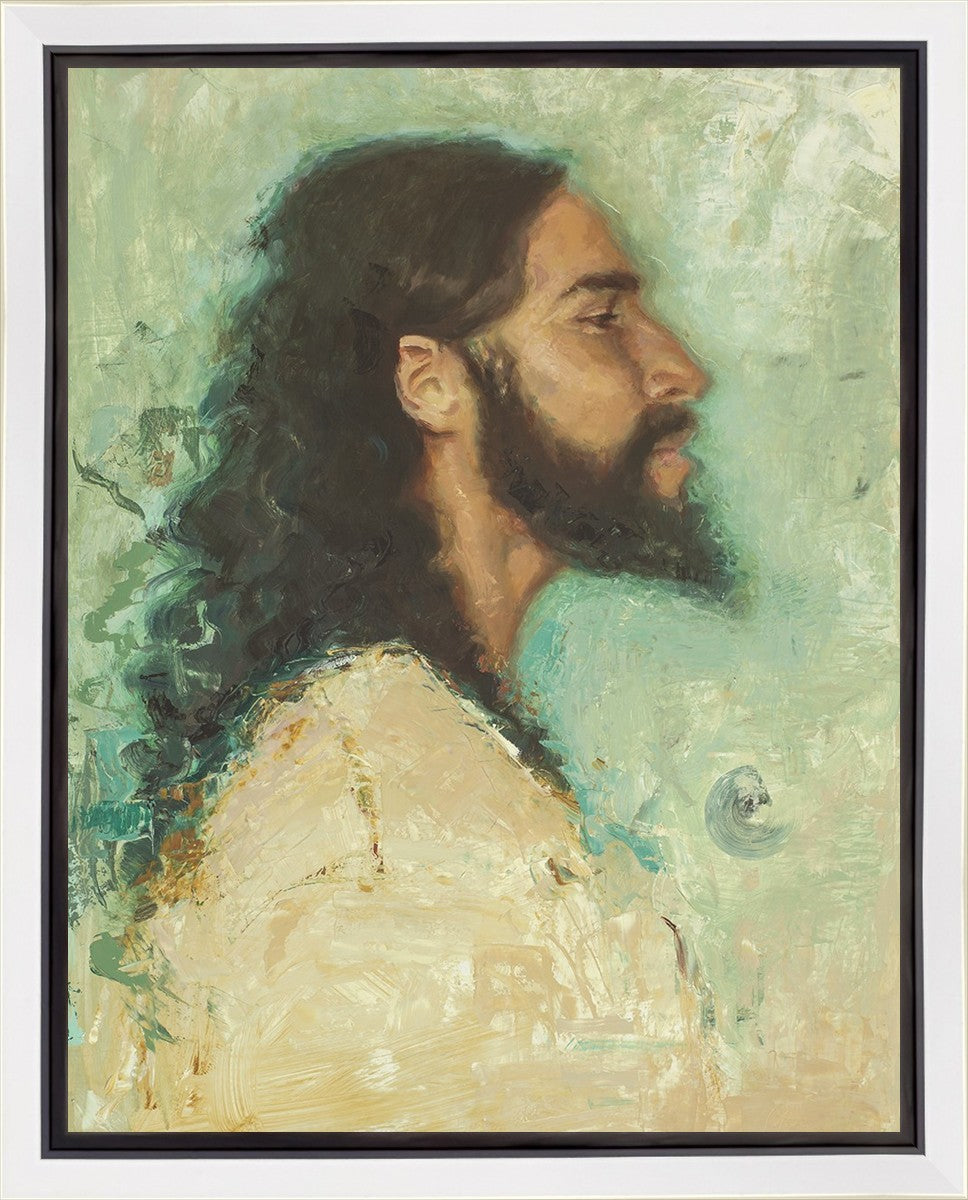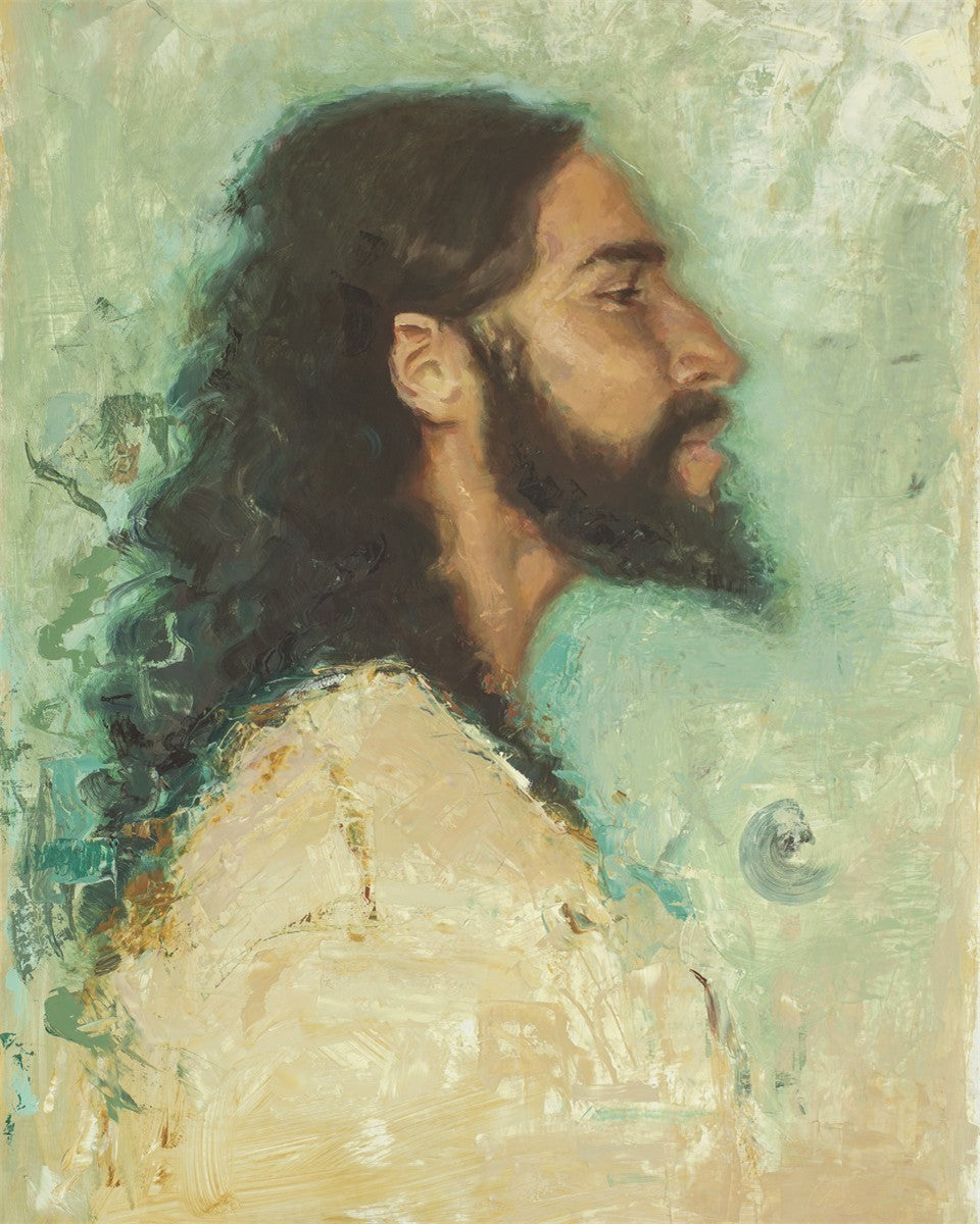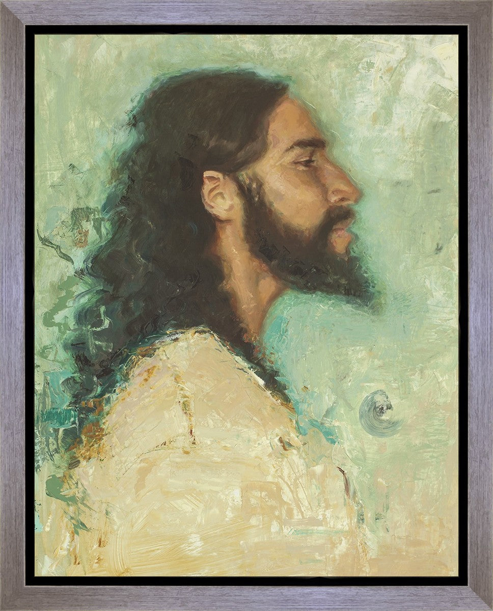 Living Waters merges a historically-based image of Christ with one that still feels visually familiar and spiritually strong. Christ's facial features and ethnicity portray what a Jewish Galilean man in the first century might have looked like. Christ's hair and beard have been left longer, reminiscent of the familiar (anglicized) images I grew up with. To depict the Savior as powerful and life-giving, I employed abstract teals and turquoise elements denoting Christ as the living water. He enlivens and sustains us. He is the key element to our mortal and eternal lives.