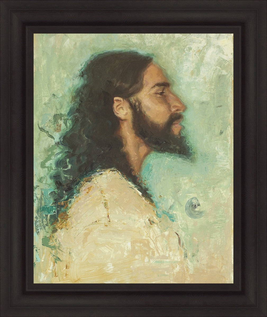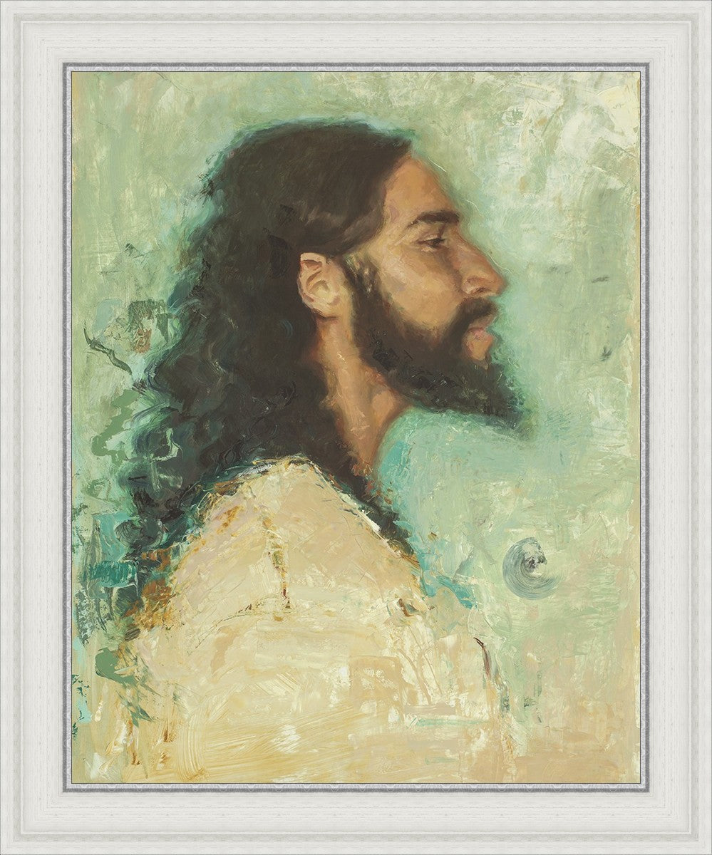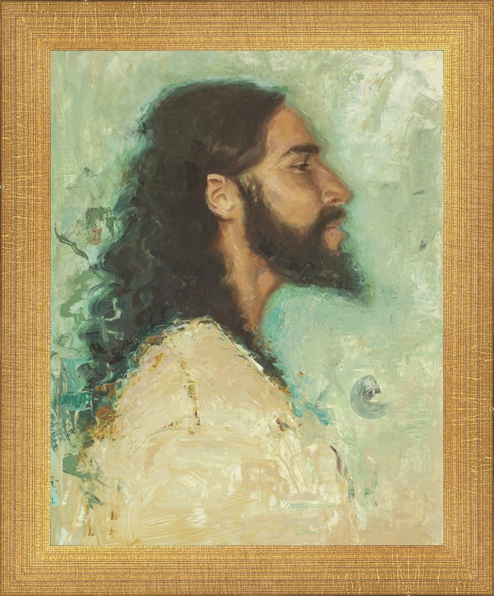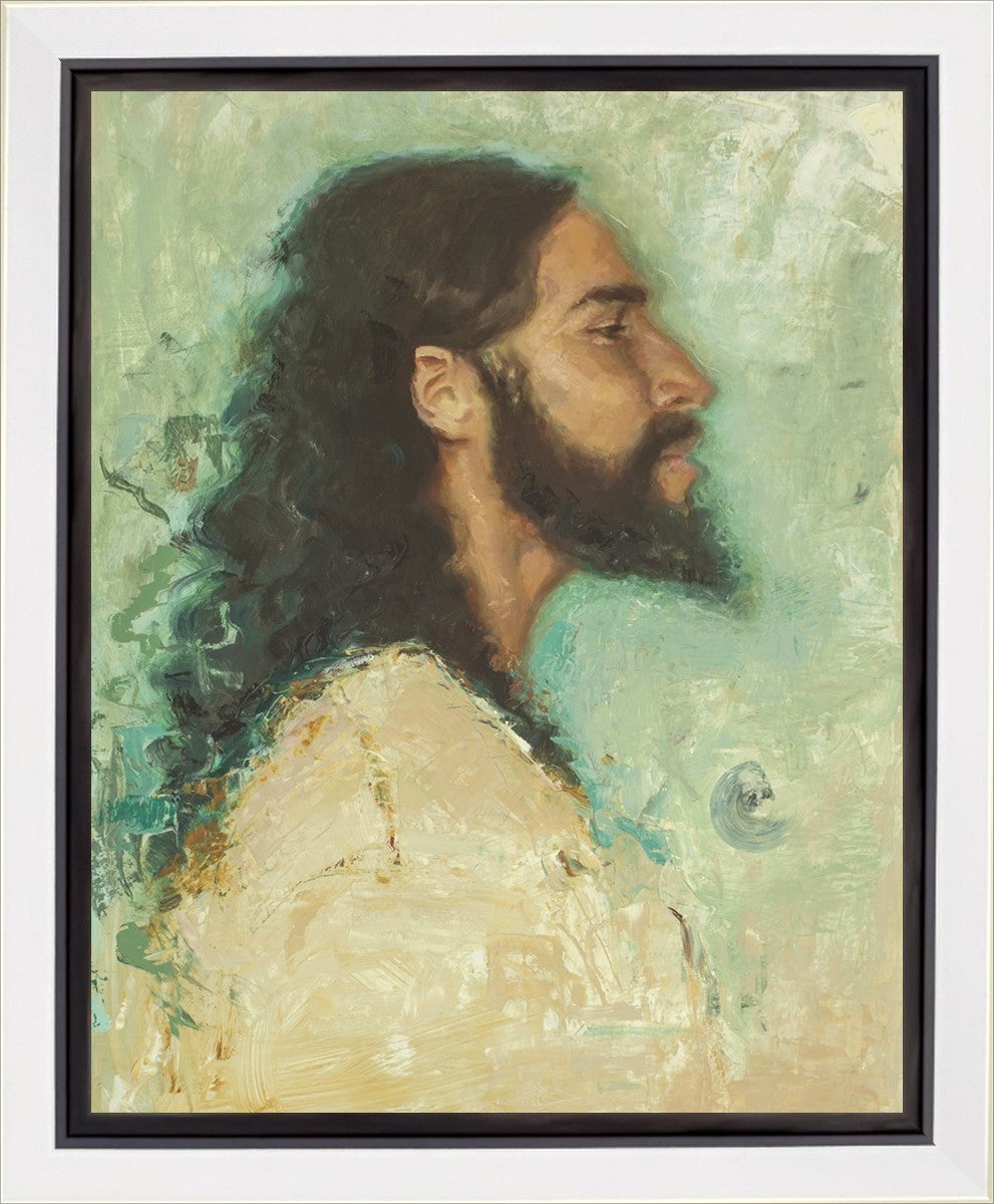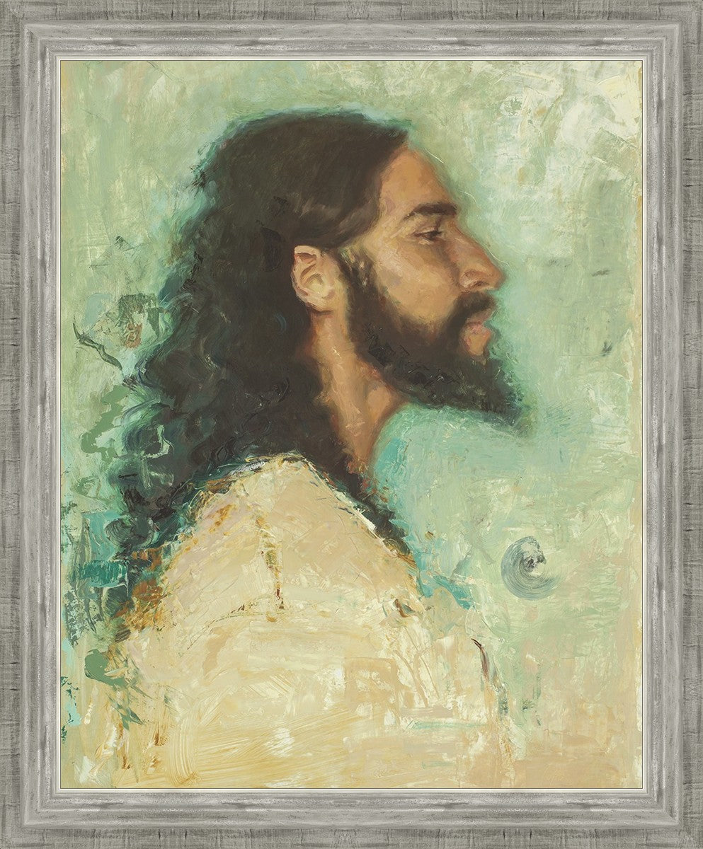 Living Waters merges a historically-based image of Christ with one that still feels visually familiar and spiritually strong. Christ's facial features and ethnicity portray what a Jewish Galilean man in the first century might have looked like. Christ's hair and beard have been left longer, reminiscent of the familiar (anglicized) images I grew up with. To depict the Savior as powerful and life-giving, I employed abstract teals and turquoise elements denoting Christ as the living water. He enlivens and sustains us. He is the key element to our mortal and eternal lives.
