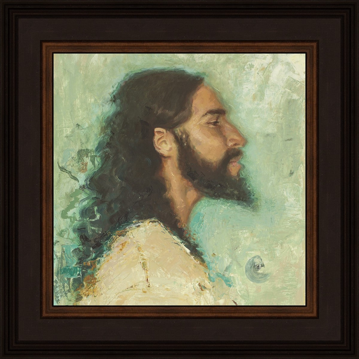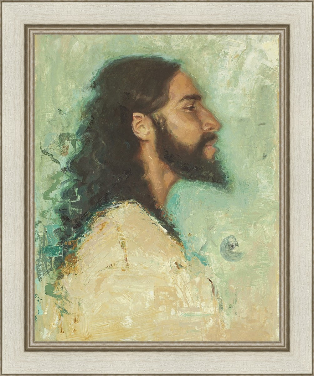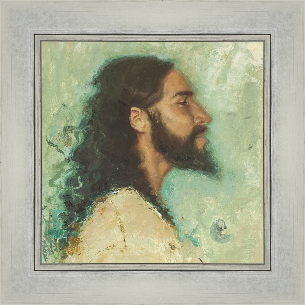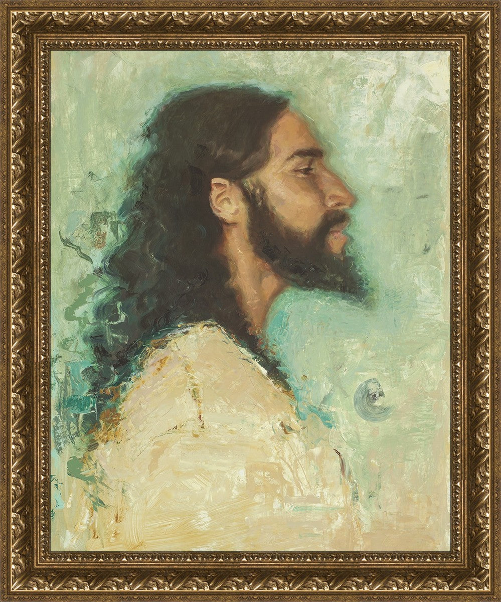 Living Waters merges a historically-based image of Christ with one that still feels visually familiar and spiritually strong. Christ's facial features and ethnicity portray what a Jewish Galilean man in the first century might have looked like. Christ's hair and beard have been left longer, reminiscent of the familiar (anglicized) images I grew up with. To depict the Savior as powerful and life-giving, I employed abstract teals and turquoise elements denoting Christ as the living water. He enlivens and sustains us. He is the key element to our mortal and eternal lives.