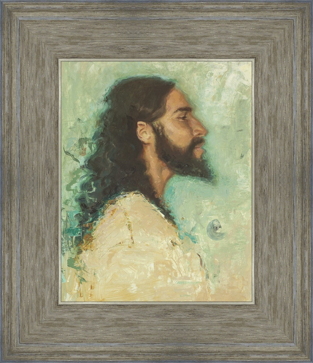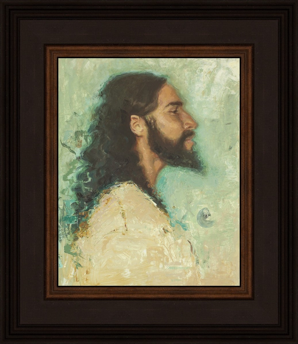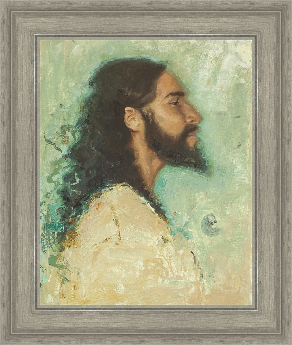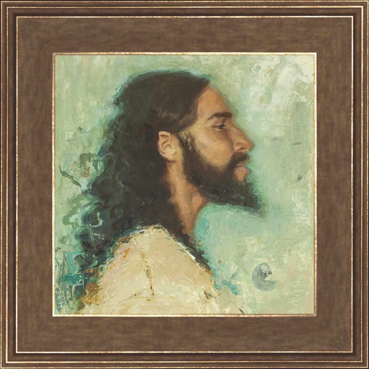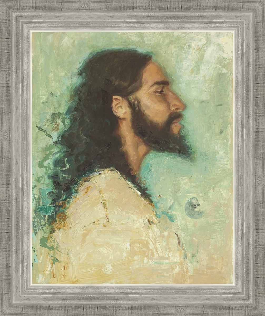 Living Waters merges a historically-based image of Christ with one that still feels visually familiar and spiritually strong. Christ's facial features and ethnicity portray what a Jewish Galilean man in the first century might have looked like. Christ's hair and beard have been left longer, reminiscent of the familiar (anglicized) images I grew up with. To depict the Savior as powerful and life-giving, I employed abstract teals and turquoise elements denoting Christ as the living water. He enlivens and sustains us. He is the key element to our mortal and eternal lives.