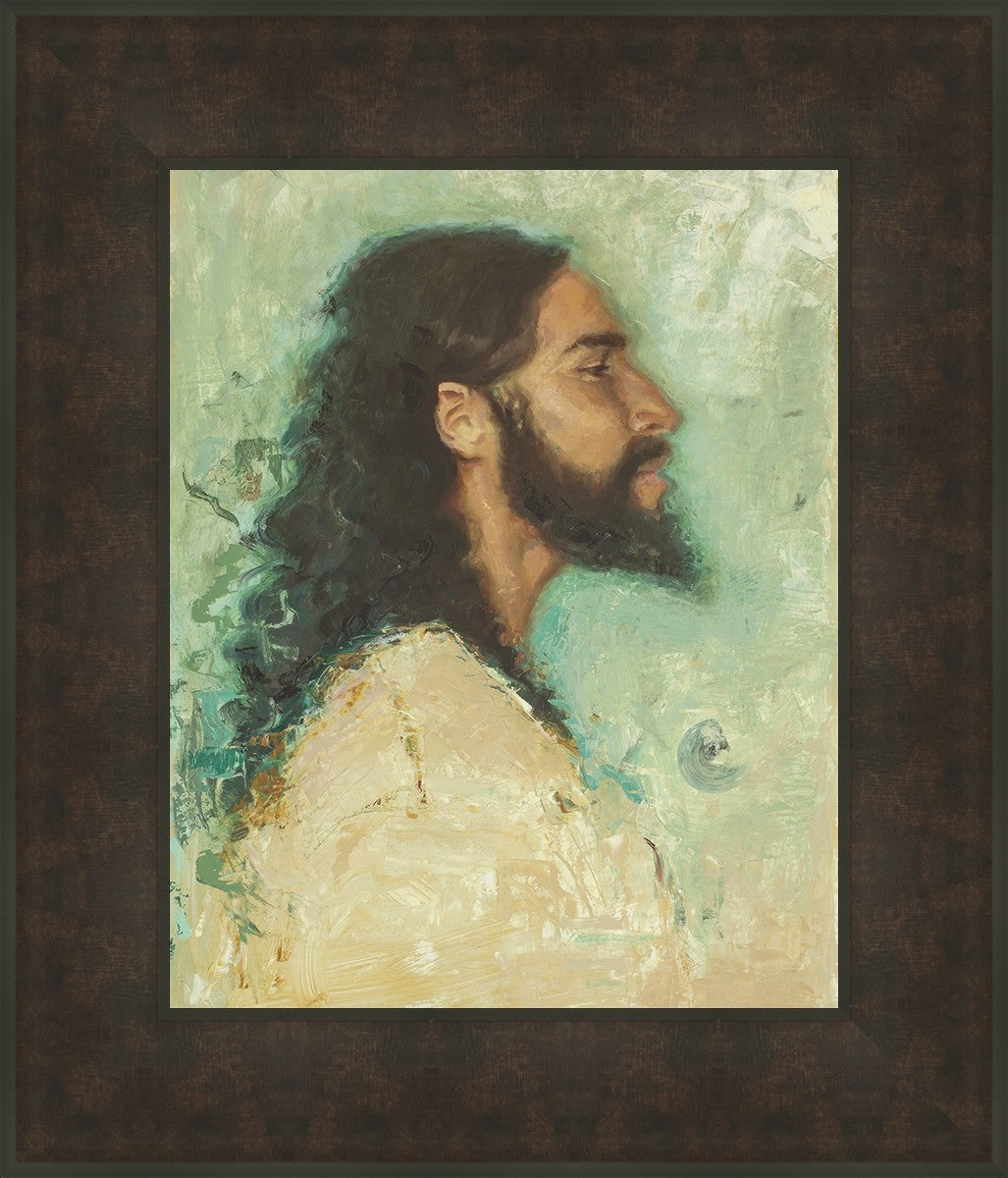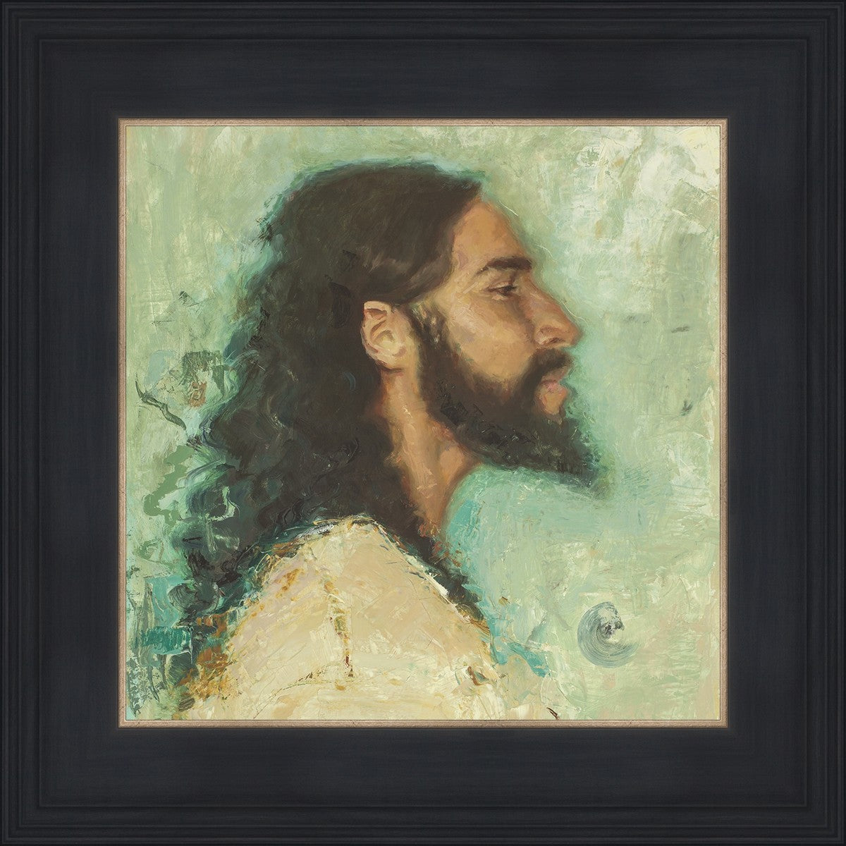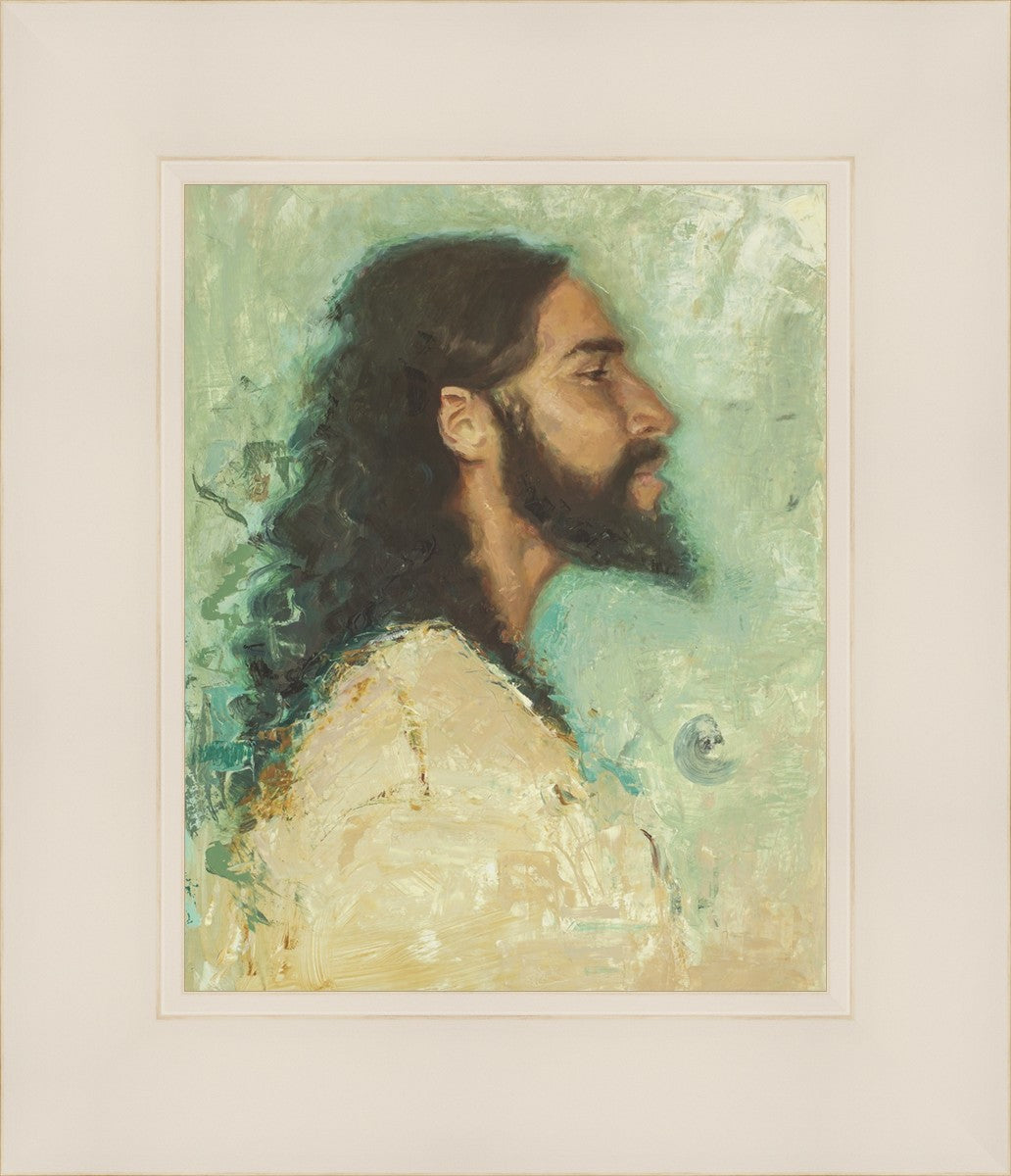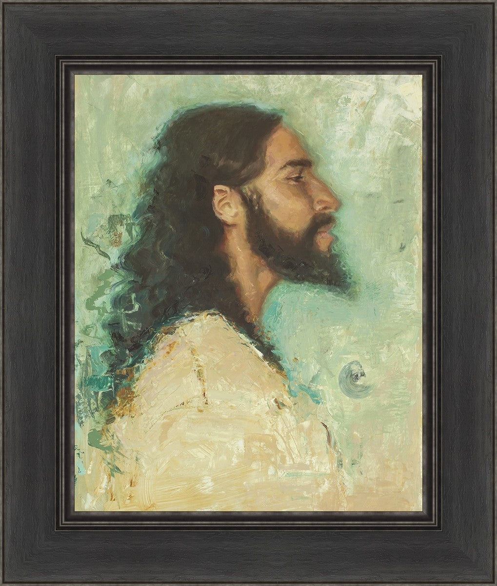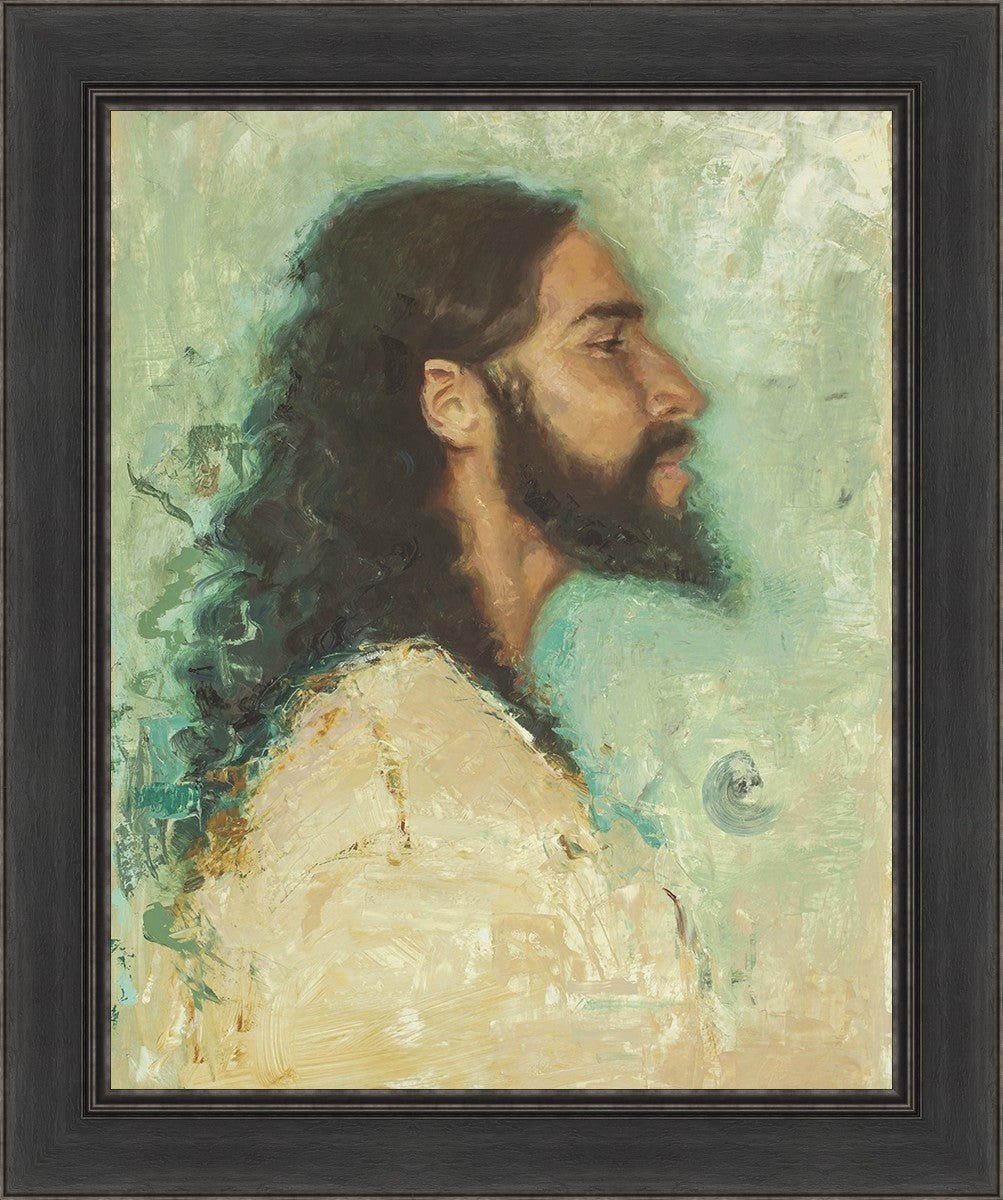 Living Waters merges a historically-based image of Christ with one that still feels visually familiar and spiritually strong. Christ's facial features and ethnicity portray what a Jewish Galilean man in the first century might have looked like. Christ's hair and beard have been left longer, reminiscent of the familiar (anglicized) images I grew up with. To depict the Savior as powerful and life-giving, I employed abstract teals and turquoise elements denoting Christ as the living water. He enlivens and sustains us. He is the key element to our mortal and eternal lives.