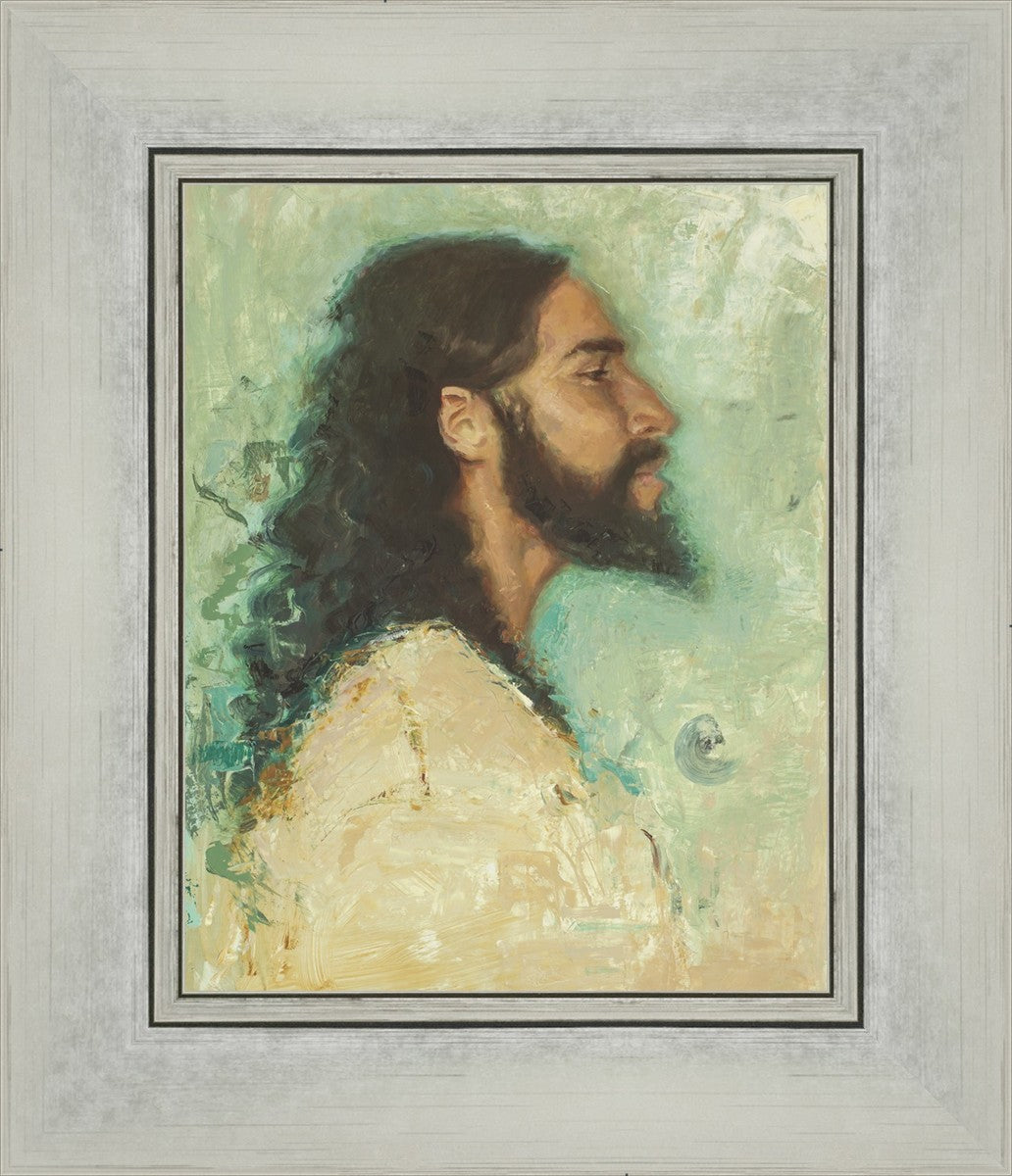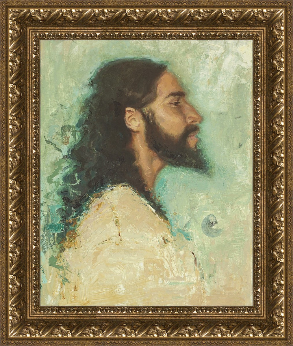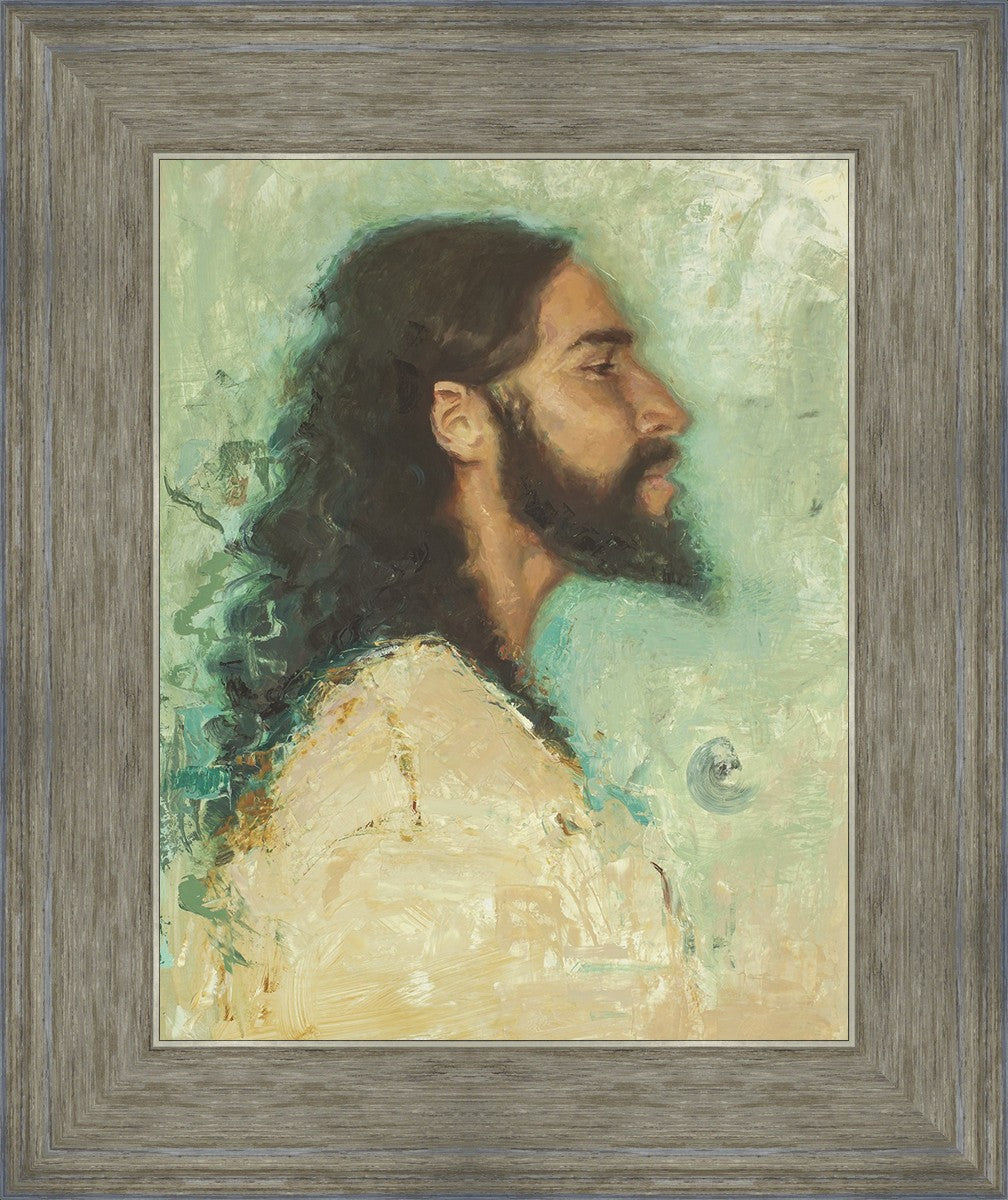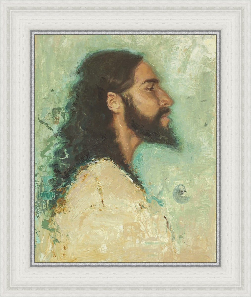 Living Waters merges a historically-based image of Christ with one that still feels visually familiar and spiritually strong. Christ's facial features and ethnicity portray what a Jewish Galilean man in the first century might have looked like. Christ's hair and beard have been left longer, reminiscent of the familiar (anglicized) images I grew up with. To depict the Savior as powerful and life-giving, I employed abstract teals and turquoise elements denoting Christ as the living water. He enlivens and sustains us. He is the key element to our mortal and eternal lives.