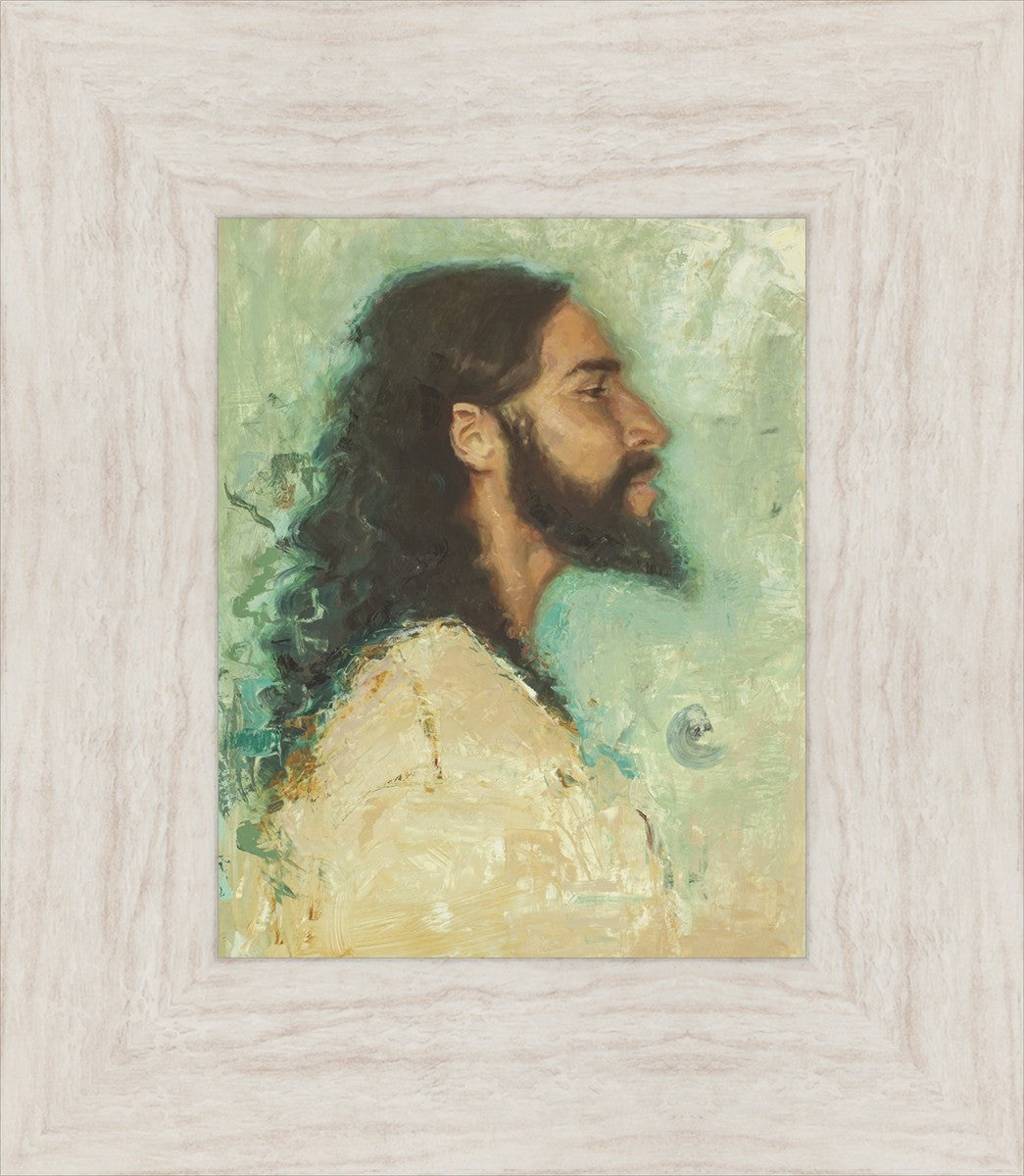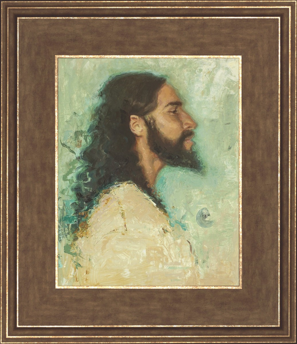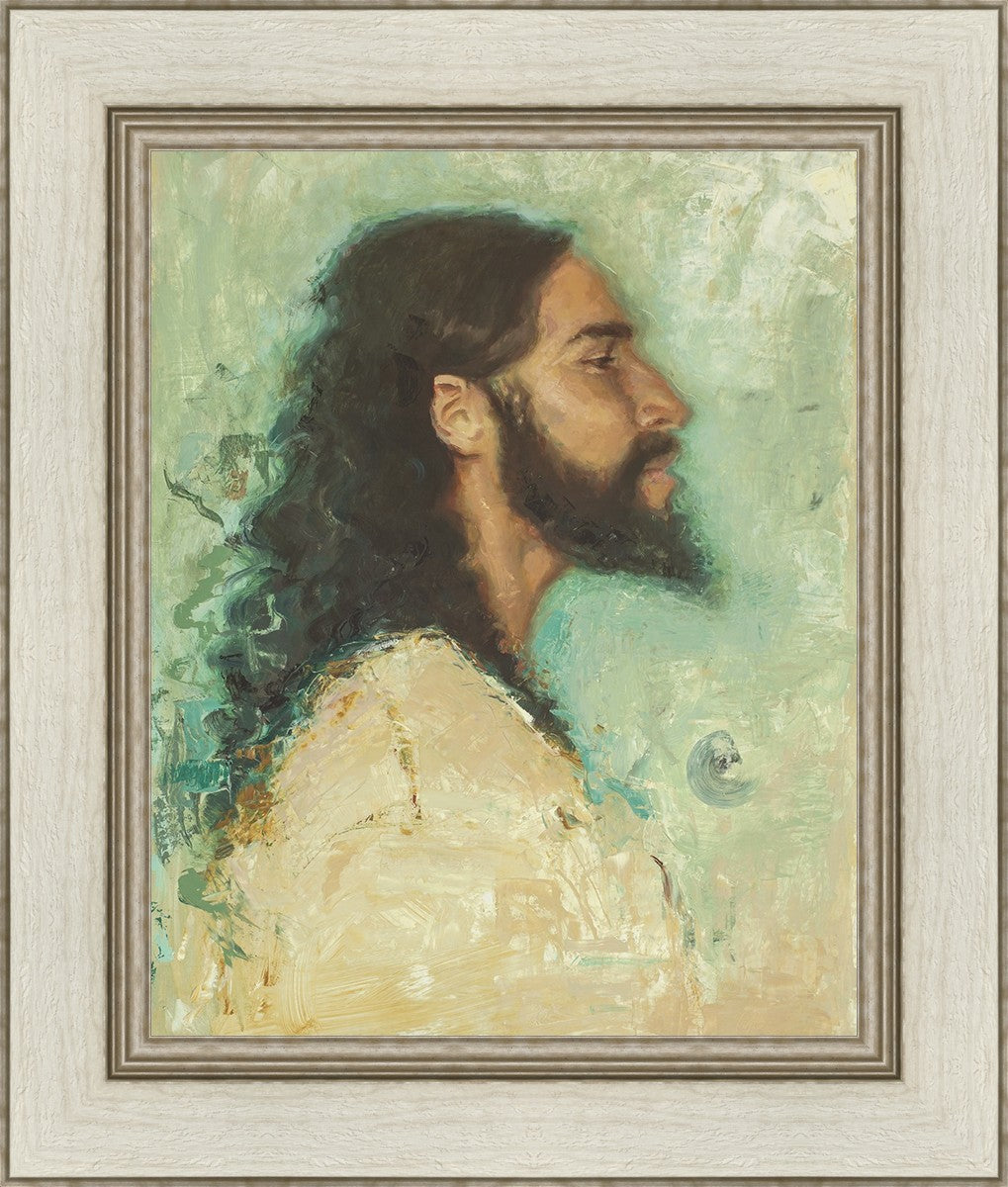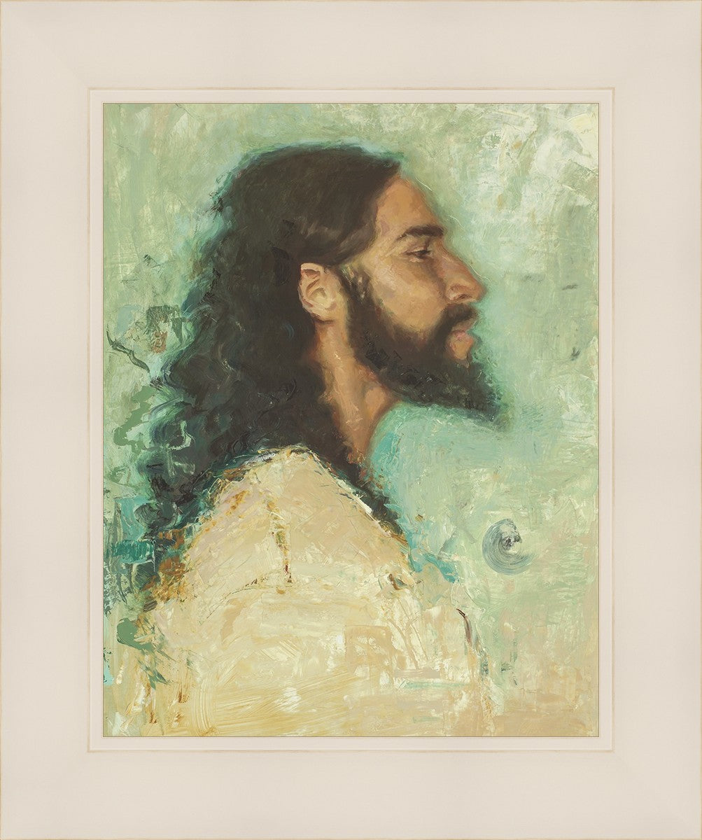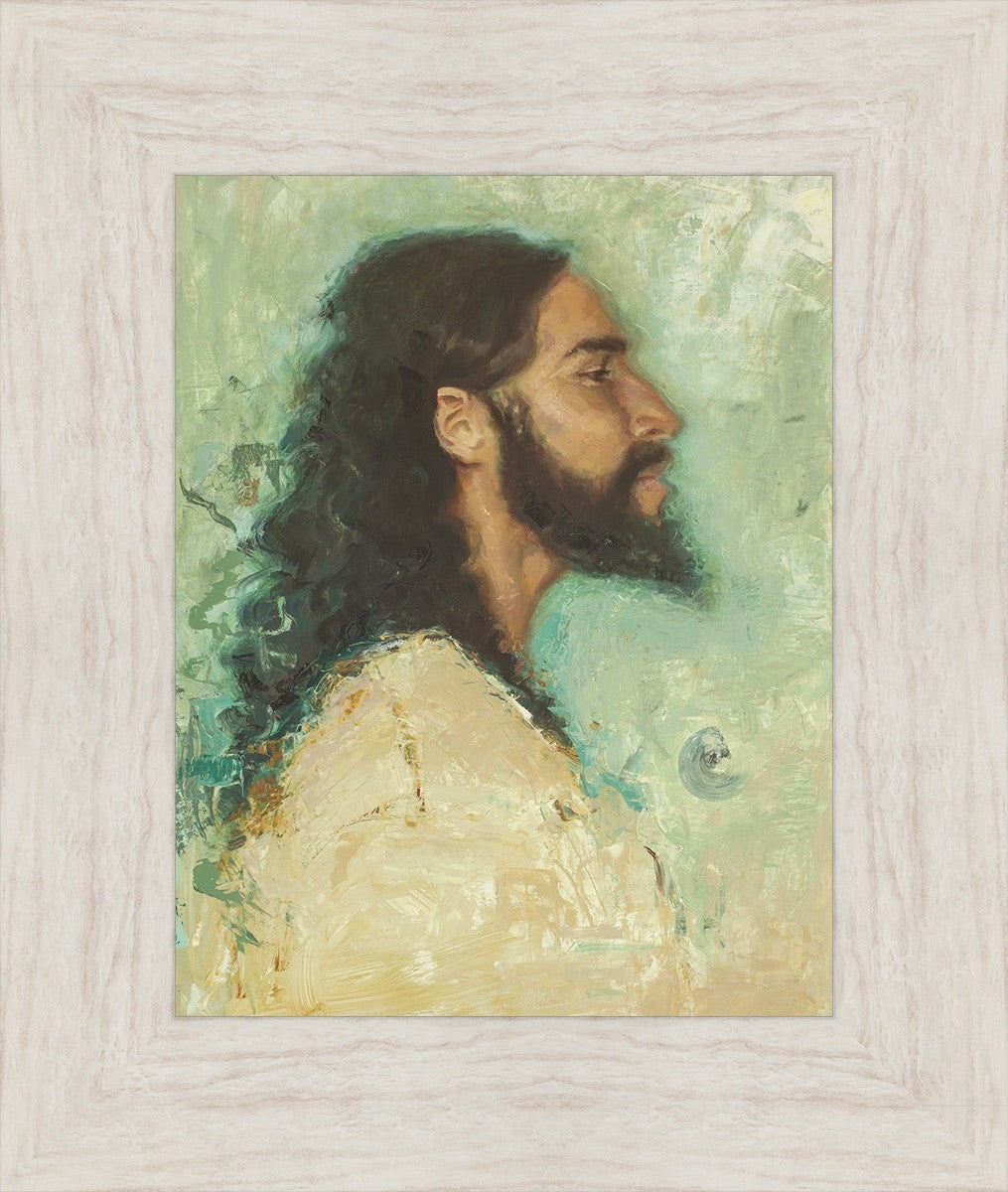Living Waters merges a historically-based image of Christ with one that still feels visually familiar and spiritually strong. Christ's facial features and ethnicity portray what a Jewish Galilean man in the first century might have looked like. Christ's hair and beard have been left longer, reminiscent of the familiar (anglicized) images I grew up with. To depict the Savior as powerful and life-giving, I employed abstract teals and turquoise elements denoting Christ as the living water. He enlivens and sustains us. He is the key element to our mortal and eternal lives.