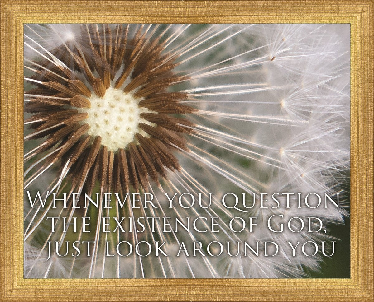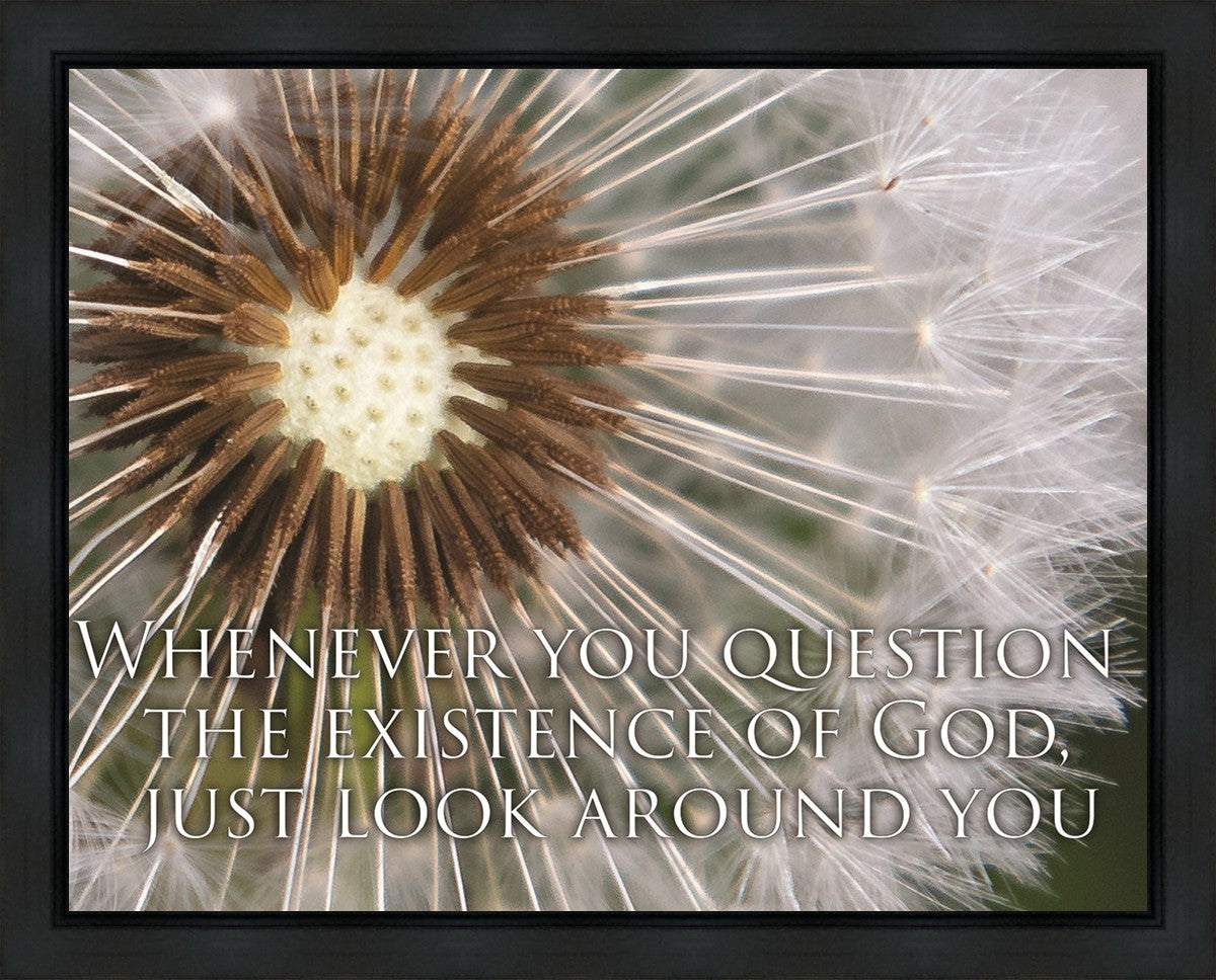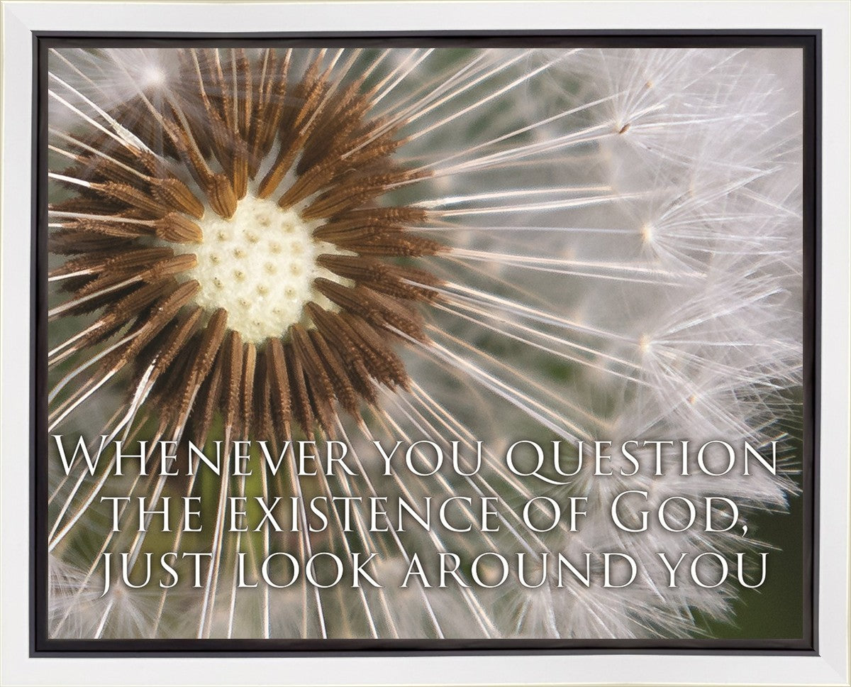 Look Around You Motivisional Poster by Julie Kerr features a photograph of a dandelion and an inspirational quote from Julie Kerr, "Whenever you question the existence of God, look around you.
